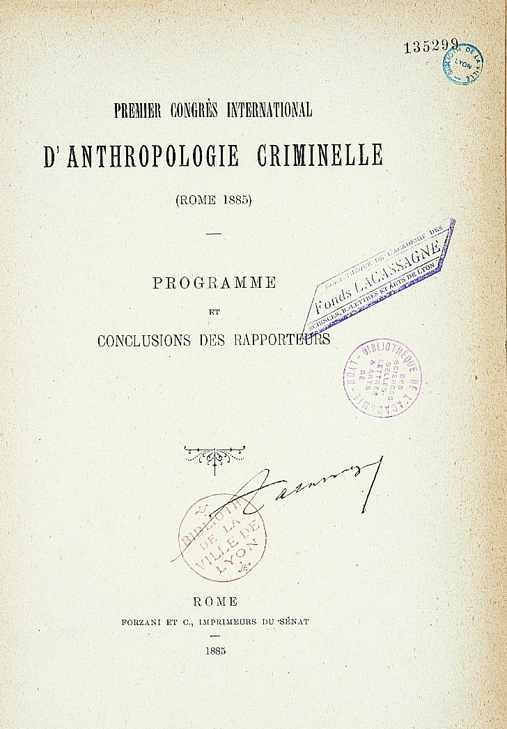 C'est au Congrès international d'Anthropologie criminelle, à Rome, en 1885, que le Professeur Lacassagne fit « irruption » et s'affirma face au Professeur Lombroso. Ses prises de parole à ce congrès, comme son exposé, marquent bien l'expression d'une volonté et d'une conviction, peut-être également d'une stratégie. La courtoisie est de mise, mais les oppositions sont présentes. A la suite de cet épisode, Lacassagne fondera une revue afin d'exposer ses conceptions, mais restera également très ouvert à toutes les idées qui viennent nourrir le débat. Surtout, il avance son hypothèse de l'importance du milieu social. Et de terminer son intervention en concluant qu'à notre époque il n'existe plus d'Ecoles. Il n'y a que la vérité : elle est à tous. [note]A. Lacassagne, « Congrès international AC, 1885 », dans Archives de l'Anthropologie criminelle, 1886, p. 183.