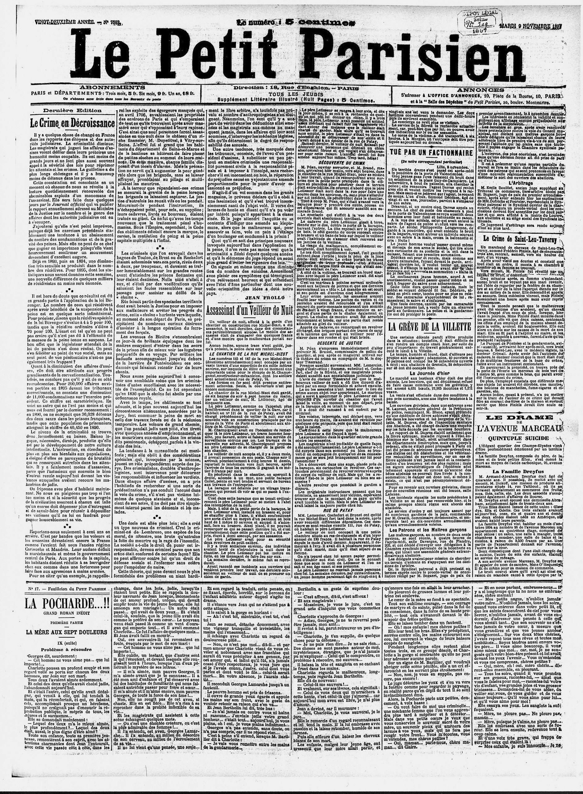La fin du XIXe siècle constitue cependant une étape particulière dans ce processus [note]Je reprends ici les principales conclusions d'un ouvrage précédent : L'Encre et le Sang. Récits de crimes et société à la Belle-Epoque, Paris, Fayard, 1995.. Le phénomène est d'abord d'ordre quantitatif. Prolongeant un mouvement perceptible dès la monarchie de Juillet, le monde des journaux participe désormais pleinement de ce qu'il est convenu d'appeler les « industries culturelles ». Vers 1914, apogée indiscutable de la presse française, on dénombre plus de 50 titres nationaux et près de 260 journaux départementaux, que les systèmes modernes de diffusion mettent à la disposition d'un corps social très alphabétisé et affamé de lectures. Les titres à plus fort tirage comme Le Petit Parisien, Le Matin, Le Petit Journal ou Le Journal, les fameux « quatre Grands », tirent chacun à plus d'un million d'exemplaires, et les grands régionaux comme L'Ouest-Eclair, La Petite Gironde, L'Echo du Nord, La Dépêche, Le Progrès, Lyon républicain ou Le Petit Marseillais, connaissent une progression spectaculaire et un volume global qui atteint 4 millions d'exemplaires [note]Marc Martin, La Presse régionale. Des affiches aux grands quotidiens, Paris, Fayard, 2002.. Or le crime est omniprésent dans ces livraisons quotidiennes, et sa part va croissante. Dans le cas du Petit Parisien, mais l'exemple vaut pour la grande majorité des titres de la presse populaire (et pour bien des journaux réputés plus « sérieux » également), le nombre des faits divers criminels double entre 1894 et 1914 (d'une dizaine à une vingtaine de relations par jour), et le volume qu'ils occupent dans l'espace rédactionnel passe d'environ 8 à 12%, alors même que la pagination augmente considérablement. Beaucoup s'en inquiètent, considérant qu'il s'agit là du symptôme d'une évidente « crise morale », d'autres y voient les effets d'un marché sans scrupules qui a fait de l'information une marchandise comme une autre, d'autres encore, moins nombreux, se contentent de sourire face à un phénomène qui procède somme toute des progrès de la démocratie.