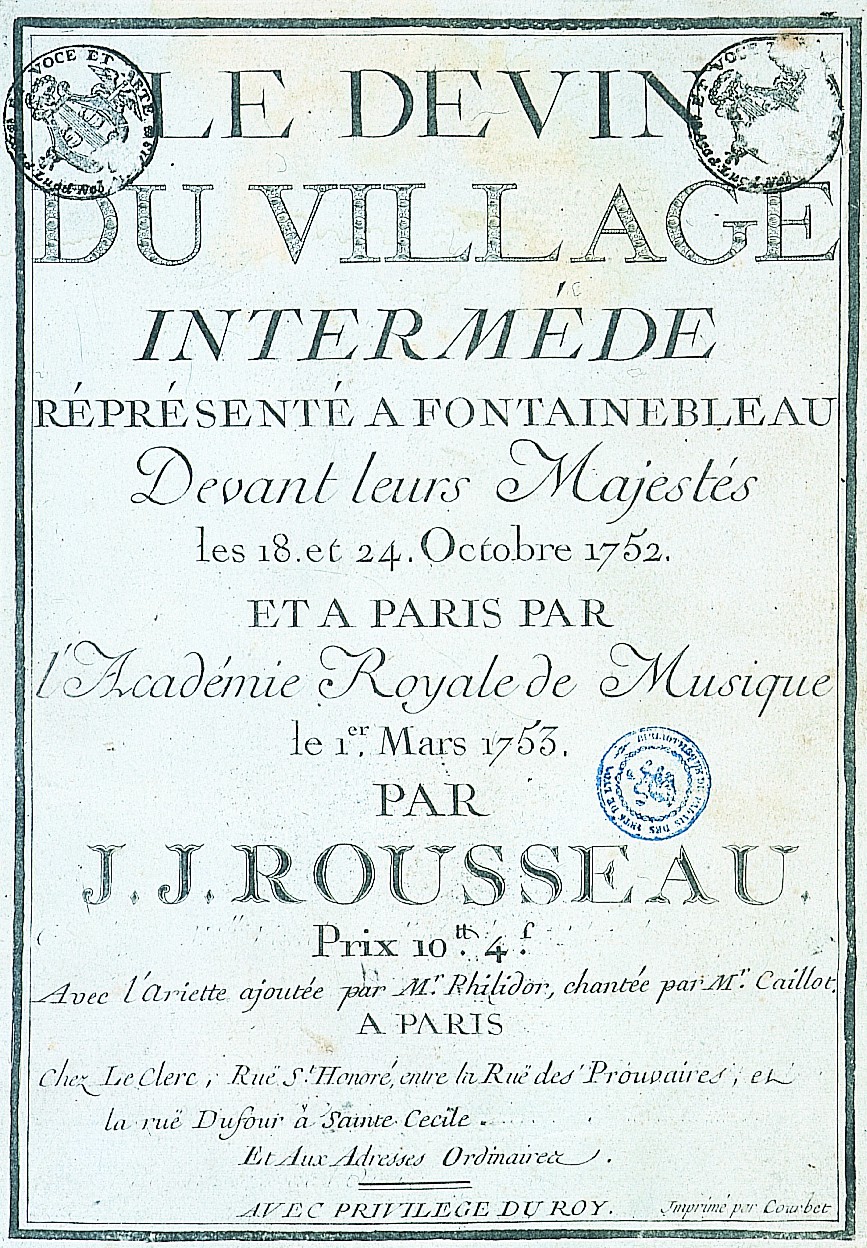 Le Devin du Village acheva de me mettre à la mode, et bientôt il n'y eut pas d'homme plus recherché que moi dans Paris. [note]Jean-Jacques Rousseau, Confessions, dans OEuvres complètes, t. I (Paris, Gallimard, 1959), édition de Marcel Raymond et de Bernard Gagnebin, p. 369.Dans le livre VIII des Confessions, Jean-Jacques Rousseau aborde l'histoire du sommet de sa carrière musicale : le lecteur suit notamment le passage à la cour de Louis XV de ce nouveau Caton, devenu brusquement célèbre après sa dénonciation des maux du siècle dans le Discours sur les sciences et les arts.