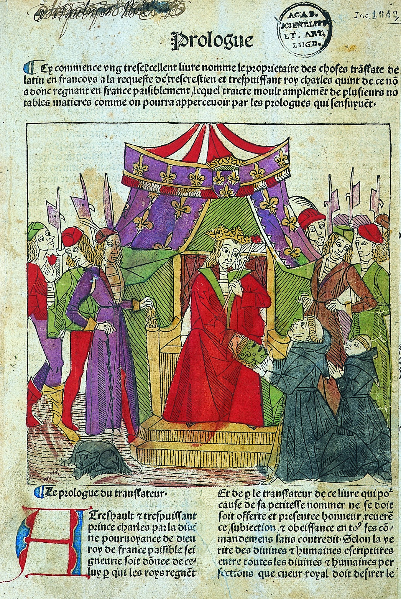 On sait que Charles V fit traduire bon nombre d'oeuvres susceptibles de fonder son action afin de gouverner ses sujets selon les règles du droit et de la justice en vue du bien commun de la collectivité. Le roi accompli devait, selon les Miroirs, allier la sapientia à la potentia et, seigneur naturel de son royaume, ne pouvait se dispenser de mieux connaître la nature ; Charlemagne et Salomon avaient montré le chemin, rappelle le traducteur qui, dans son prologue, énonce que entre les désirs humains de cueur royal le désir de sapience doit estre le principal. C'est pourquoi le De proprietatibus devenu Propriétaire prit place dans les armoires de la Librairie royale. Un siècle durant, la traduction de Jean Corbichon amplifie le succès toujours grand du texte original. Dès 1470, à Bâle, chez l'imprimeur Berthold Ruppel, apparaît la première édition imprimée. Les presses allemandes en donnent huit autres dans les années suivantes, toujours en latin, et dépourvues d'illustrations.