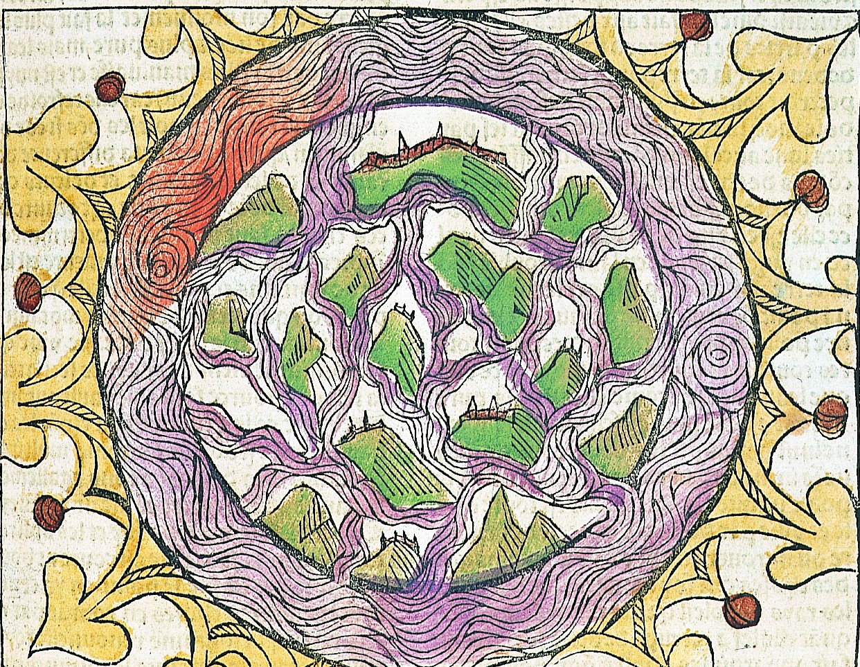 Contemporain de Husz et esprit fort critique, l'humaniste Balci dans une Descriptio Helvetiæ de 1480 note qu'à la source des fleuves se dévoilent presque les secrets du monde. Aux diffluences terrestres et apparentes correspondent en effet des confluences invisibles, car la vénérable théorie du circuit interne des eaux exposée par la plupart des philosophes grecs et romains a été évidemment acceptée par les auteurs médiévaux et par ceux de la Renaissance. Barthélemy est sur ce point catégorique et cite Salomon : les eaux retournent en arrière aux lieux dont elles viennent et yssent de l'abisme qui est leur mère pour courir par le monde (f. 180 vo). L'opinion dominante, quant à elle, accorde au circuit interne une place essentielle sans jamais devenir exclusive. Tous les hommes de haute culture, en accord avec la conception géophysique du globe terraque (une sphère de terre et d'eau mêlées), qui ne sera abandonnée que peu avant 1700, retiennent le rôle majeur des filtrations souterraines et des conduits mucés (cachés), même s'ils divergent sur les mécanismes de la remonte (pesanteur de la mer, action des vents souterrains, condensations internes, processus de capillarité, force attractive des astres, animus de la terre...).