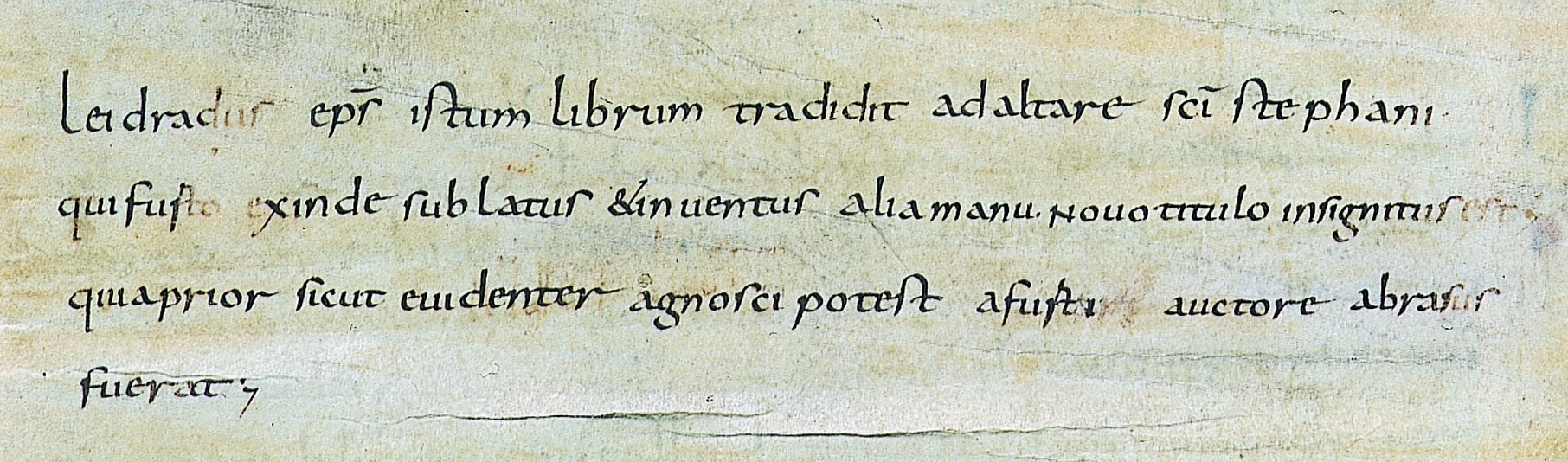 Ces livres, copiés de son vivant et à son initiative, il les a corrigés et parfois annotés. Dans le rapport qu'il adresse à Charlemagne au moment où il songe à se retirer et à laisser le diocèse à son chorévêque [note]Les archevêques de Lyon étaient d'abord entourés de vicaires appelés à les seconder dans l'exercice de leur ministère, et dont quelques uns revêtirent le caractère épiscopal. Ces vicaires furent d'abord désignés sous le nom de chorévêques ou corévêques, puis sous celui de suffragants, enfin d'auxiliaires. Agobard, Leidrat écrit : J'ai également oeuvré de tout mon possible pour faire copier des livres au sein de mon église. Ses successeurs feront de même, que ce soit Agobard, après lui Amolon puis l'évêque Remi venu du monastère de Saint-Oyand dans le Jura, une dépendance de l'évêché lyonnais d'alors, quatre fois plus grand qu'aujourd'hui : tous, animés du même désir de faire croître la bibliothèque, ont imité Leidrat en donnant des livres personnels, et l'on voit plus tard Mannon léguer, lui aussi, une partie de ses livres au monastère de Saint-Oyand, dont il était le prévôt.