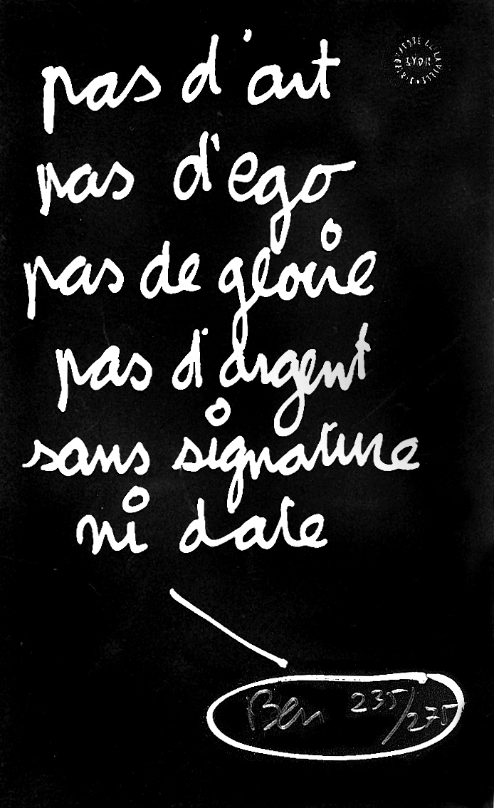 L'artothèque de Lyon, on l'aura compris, ne se résume pas à une collection de multiples prêtables. Les axes d'acquisition, formulés ici de manière peut-être sibylline, sont cependant l'expression d'un principe libératoire qui permet de retenir des démarches actuelles les fondements intelligibles et les formes variées. Son jumelage avec des collections de photographies et de livres d'artistes offre au public une collection de pièces peu répandues, et une vision étendue sur l'artiste.