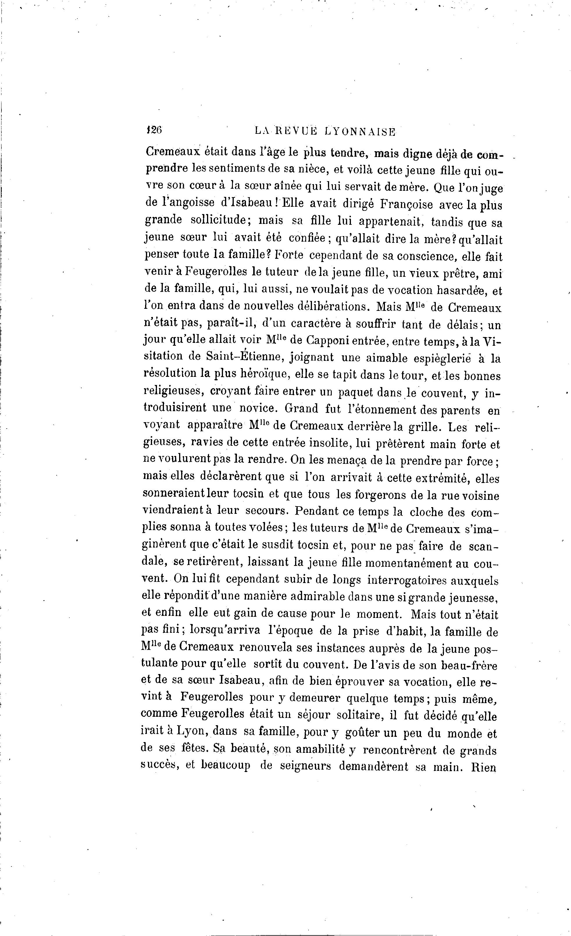 i2& LA REVUE LYONNAISE Cremeaux était dans l'âge le plus tendre, mais digne déjà de com- prendre les sentiments de sa nièce, et voilà cette jeune fille qui ou- vre son cœur à la sœur aînée qui lui servait de mère. Que l'on juge de l'angoisse d'Isabeau ! Elle avait dirigé Françoise avec la plus grande sollicitude; mais sa fille lui appartenait, tandis que sa jeune sœur lui avait été confiée; qu'allait dire la mère?qu'allait penser toute la famille? Forte cependant de sa conscience, elle fait venir à Feugerolles le tuteur delà jeune fille, un vieux prêtre, ami de la famille, qui, lui aussi, ne voulait pas de vocation hasardée, et l'on entra dans de nouvelles délibérations. Mais M1'8 de Cremeaux n'était pas, paraît-il, d'un caractère à souffrir tant de délais; un jour qu'elle allait voir Mile de Capponi entrée, entre temps, à la Vi- sitation de Saint-Etienne, joignant une aimable espièglerie à la résolution la plus héroïque, elle se tapit dans le tour, et les bonnes religieuses, croyant faire entrer un paquet dans le couvent, y in- troduisirent une novice. Grand fut l'étonnement des parents en voyant apparaître Mlle de Cremeaux derrière la grille. Les reli- gieuses, ravies de cette entrée insolite, lui prêtèrent main forte et ne voulurent pas la rendre. On les menaça de la prendre par force ; mais elles déclarèrent que si l'on arrivait à cette extrémité, elles sonneraient leur tocsin et que tous les forgerons de la rue voisine viendraient à leur secours. Pendant ce temps la cloche des corn- plies sonna à toutes volées ; les tuteurs de MIle de Cremeaux s'ima- ginèrent que c'était le susdit tocsin et, pour ne pas' faire de scan- dale, se retirèrent, laissant la jeune fille momentanément au cou- vent. On lui fit cependant subir de longs interrogatoires auxquels elle répondit'd'une manière admirable dans une si grande jeunesse, et enfin elle eut gain de cause pour le moment. Mais tout n'était pas fini ; lorsqu'arriva l'époque de la prise d'habit, la famille de MIle de Cremeaux renouvela ses instances auprès de la jeune pos- tulante pour qu'elle sortît du couvent. De l'avis de son beau-frère et de sa sœur Isabeau, afin de bien éprouver sa vocation, elle re- vint à Feugerolles pour y demeurer quelque temps ; puis même, comme Feugerolles était un séjour solitaire, il fut décidé qu'elle irait à Lyon, dans sa famille, pour y goûter un peu du monde et de ses fêtes. Sa beauté, son amabilité y rencontrèrent de grands succès, et beaucoup de seigneurs demandèrent sa main. Rien