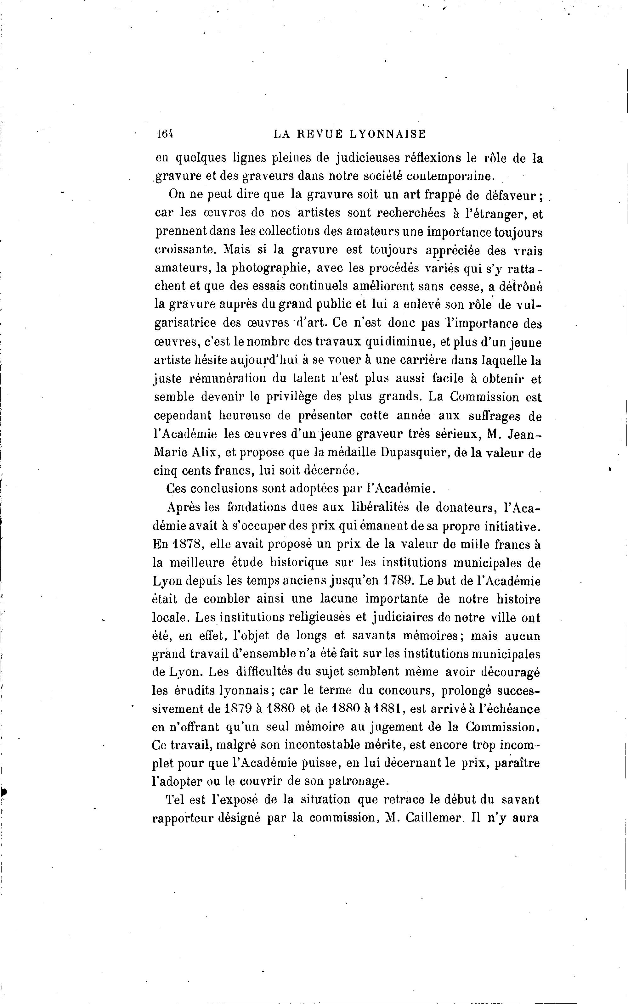 164 LA R E V U E LYONNAISE en quelques lignes pleines de judicieuses réflexions le rôle de la gravure et des graveurs dans notre société contemporaine. On ne peut dire que la gravure soit un art frappé de défaveur ; . car les œuvres de nos artistes sont recherchées à l'étranger, et prennent dans les collections des amateurs une importance toujours croissante. Mais si la gravure est toujours appréciée des vrais amateurs, la photographie, avec les procédés variés qui s'y ratta - chent et que des essais continuels améliorent sans cesse, a détrôné la gravure auprès du grand public et lui a enlevé son rôle de vul- garisatrice des œuvres d'art. Ce n'est donc pas l'importance des œuvres, c'est le nombre des travaux qui diminue, et plus d'un jeune artiste hésite aujourd'hui à se vouer à une carrière dans laquelle la juste rémunération du talent n'est plus aussi facile à obtenir et semble devenir le privilège des plus grands. La Commission est cependant heureuse de présenter cette année aux suffrages de l'Académie les œuvres d'un jeune graveur très sérieux, M. Jean- Marie Alix, et propose que la médaille Dupasquier, de la valeur de cinq cents francs, lui soit décernée. Ces conclusions sont adoptées par l'Académie. Après les fondations dues aux libéralités de donateurs, l'Aca- démie avait à s'occuper des prix qui émanent de sa propre initiative. En 1878, elle avait proposé un prix de la valeur de mille francs à la meilleure étude historique sur les institutions municipales de Lyon depuis les temps anciens jusqu'en 1789. Le but de l'Académie était de combler ainsi une lacune importante de notre histoire locale. Les institutions religieuses et judiciaires de notre ville ont été, en effet, l'objet de longs et savants mémoires; mais aucun grand travail d'ensemble n'a été fait sur les institutions municipales de Lyon. Les difficultés du sujet semblent même avoir découragé les érudits lyonnais; car le terme du concours, prolongé succes- sivement de 1879 à 1880 et de 1880 à 1881, est arrivé à l'échéance en n'offrant qu'un seul mémoire au jugement de la Commission. Ce travail, malgré son incontestable mérite, est encore trop incom- plet pour que l'Académie puisse, en lui décernant le prix, paraître l'adopter ou le couvrir de son patronage. Tel est l'exposé de la situation que retrace le début du savant rapporteur désigné par la commission, M. Caillemer. Il n'y aura