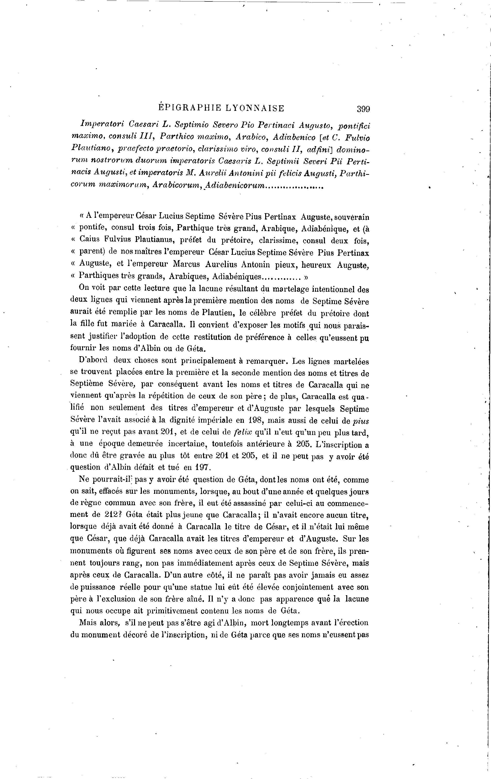du monument décoré de l'inscription, ni de Géta parce que ses noms n'eussent pas