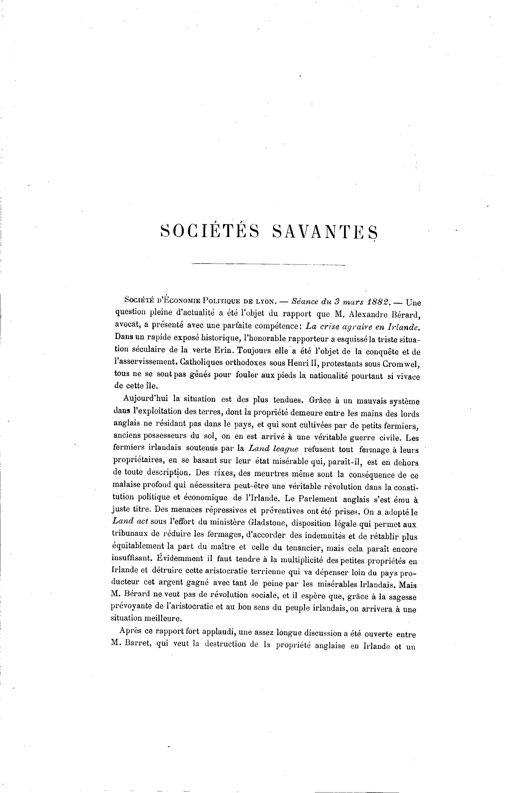SOCIÉTÉS SAVANTES SOCIÉTÉ D'ECONOMIE POLITIQUE DE LYON. — Séance du 3 mars 1882. — Une question pleine d'actualité a été l'objet du rapport que M. Alexandre Bérard, avocat, a présenté avec une parfaite compétence : La crise agraire en Irlande. Dans un rapide exposé historique, l'honorable rapporteur a esquissé la triste situa- tion séculaire de la verte Ei'in. Toujours elle a été l'objet de la conquête et de l'asservissement. Catholiques orthodoxes sous Henri II, protestants sous Cromwel, tous ne se sont pas gênés pour fouler aux pieds la nationalité pourtant si vivaoe de cette île. Aujourd'hui la situation est des plus tendues. Grâce à un mauvais système dans l'exploitation des terres, dont la propriété demeure entre les mains des lords anglais ne résidant pas dans le pays, et qui sont cultivées par de petits fermiers, anciens possesseurs du sol, on en est arrivé à une véritable guerre civile. Les fermiers irlandais soutenus par la Land league refusent tout fermage à leurs propriétaires, en se basant sur leur état misérable qui, paraît-il, est en dehors de toute description. Des rixes, des meurtres même sont la conséquence de ce malaise profond qui nécessitera peut-être une véritable révolution dans la consti- tution politique et économique de l'Irlande. Le Parlement anglais s'est ému à juste titre. Des menaces répressives et préventives ont été prises. On a adopté le Land act sous l'effort du ministère Gladstone, disposition légale qui permet aux tribunaux de réduire les fermages, d'accorder des indemnités et de rétablir plus équitablement la part du maître et celle du tenancier, mais cela paraît encore insuffisant. Évidemment il faut tendre à la multiplicité des petites propriétés en Irlande et détruire cette aristocratie terrienne qui va dépenser loin du pays pro- ducteur cet argent gagné avec tant de peine par les misérables Irlandais. Mais M. Bérard ne veut pas de révolution sociale, et il espère que, grâce à la sagesse prévoyante de l'aristocratie et au bon sens du peuple irlandais, on arrivera à une situation meilleure. Après ce rapport fort applaudi, une assez longue discussion a été ouverte entre M. Barret, qui veut la destruction de la propriété anglaise en Irlande et un