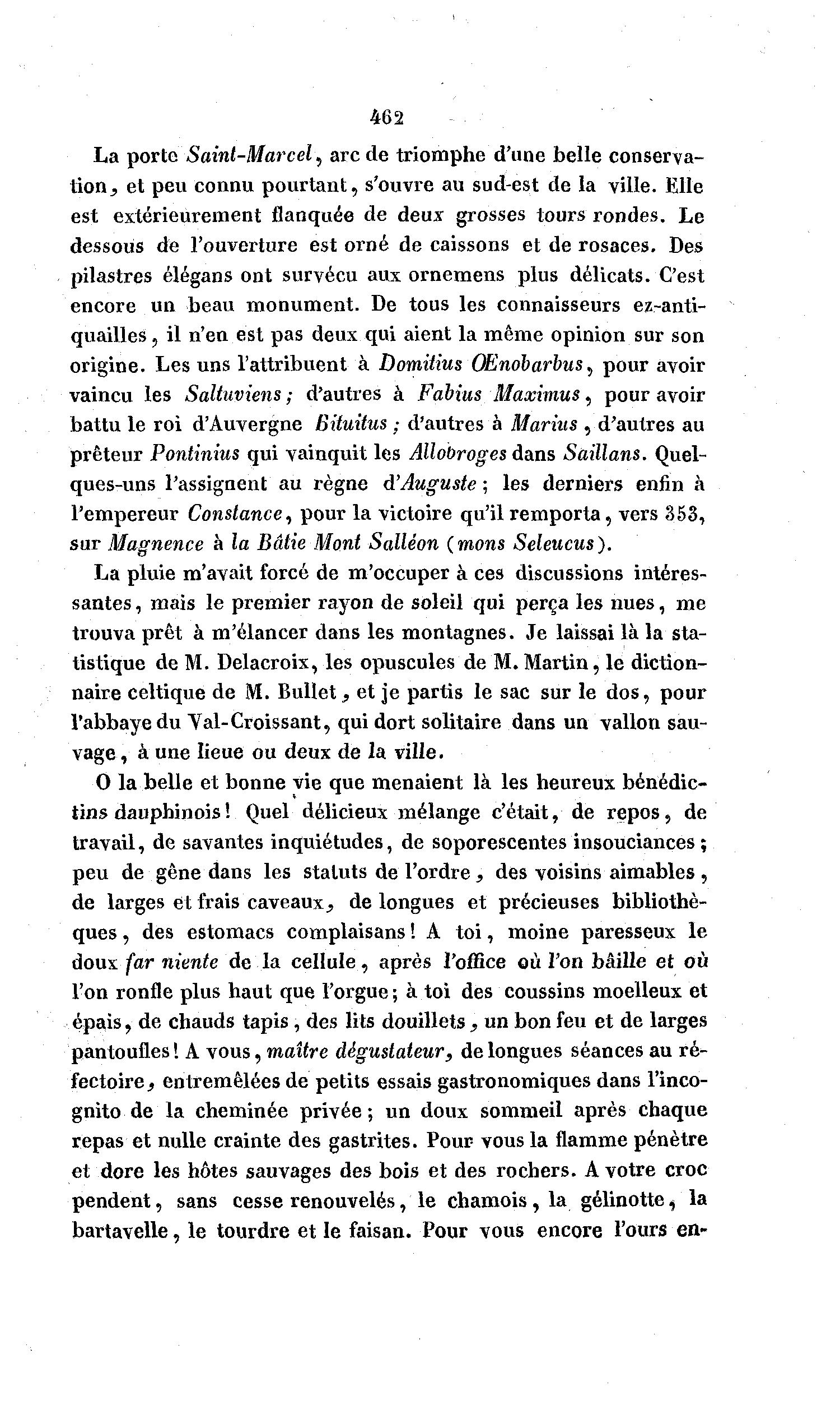 462 La porte Saint-Marcel, arc de triomphe d'une belle conserva- tion ^ et peu connu pourtant, s'ouvre au sud-est de la ville. Elle est extérieurement flanquée de deux grosses tours rondes. Le dessous de l'ouverture est orné de caissons et de rosaces. Des pilastres élégans ont survécu aux ornemens plus délicats. C'est encore un beau monument. De tous les connaisseurs ez-anti- quailles, il n'en est pas deux qui aient la même opinion sur son origine. Les uns l'attribuent à Domilius OEnobarbus, pour avoir vaincu les Saltuviens ; d'autres à Fabius Maximus, pour avoir battu le roi d'Auvergne Bituitus ; d'autres à Marins , d'autres au prêteur Pontinius qui vainquit les Allobroges dans Saillans. Quel- ques-uns l'assignent au règne d'Auguste ; les derniers enfin à l'empereur Constance, pour la victoire qu'il remporta, vers 353, sur Magnence h la Bâtie Mont Salléon (nions Seleucus). La pluie m'avait forcé de m'occuper à ces discussions intéres- santes , mais le premier rayon de soleil qui perça les nues, me trouva prêt à m'élancer dans les montagnes. Je laissai là la sta- tistique de M. Delacroix, les opuscules de M. Martin, le diction- naire celtique de M. Bullet, et je partis le sac sur le dos, pour l'abbaye du "Val-Croissant, qui dort solitaire dans un vallon sau- vage, à une lieue ou deux de la ville. 0 la belle et bonne vie que menaient là les heureux bénédic- tins dauphinois ! Quel délicieux mélange c'était, de repos, de travail, de savantes inquiétudes, de soporescentes insouciances; peu de gêne dans les statuts de l'ordre, des voisins aimables , de larges et frais caveaux, de longues et précieuses bibliothè- ques , des estomacs complaisans ! A toi, moine paresseux le doux far niente de la cellule, après l'office où l'on bâille et où l'on ronfle plus haut que l'orgue; à toi des coussins moelleux et épais, de chauds tapis, des lits douillets, un bon feu et de larges pantoufles! A vous, maître dégustateur, de longues séances au ré- fectoire, entremêlées de petits essais gastronomiques dans l'inco- gnito de la cheminée privée; un doux sommeil après chaque repas et nulle crainte des gastrites. Pour- vous la flamme pénètre et dore les hôtes sauvages des bois et des rochers. A votre croc pendent, sans cesse renouvelés, le chamois, la gelinotte, la bartavelle, le tourdre et le faisan. Pour vous encore l'ours en-