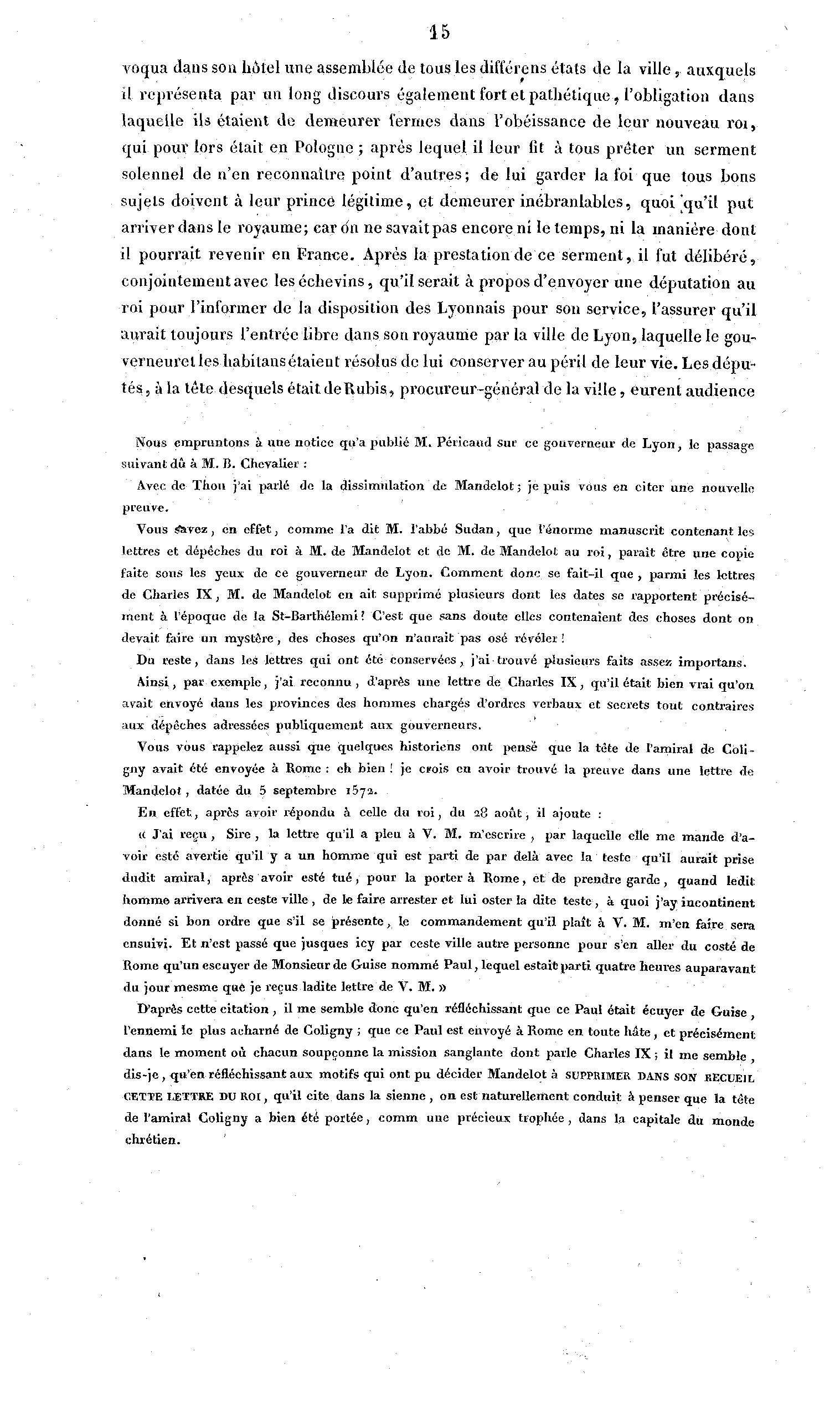 15 voqua dans sou hôtel une assemblée de tous les diiïércns étals de la ville,. auxquels il représenta par un long discours également fort et pathétique, l'obligation dans laquelle ils étaient de demeurer Vernies dans l'obéissance de leur nouveau roi, qui pour lors était en Pologne ; après lequel il leur lit à tous prêter un serment solennel de n'en reconnaître point d'autres; de lui garder la loi que tous bons sujets doivent à leur prince légitime, et demeurer inébranlables, quoi Vju'U put arriver dans le royaume; car on ne savaitpas encore ni le temps, ni la manière dont il pourrait revenir en France. Après la prestation de ce serment, il fut délibéré, conjointement avec les éclievins, qu'il serait à propos d'envoyer une députation au roi pour l'informer de la disposition des Lyonnais pour son service, l'assurer qu'il aurait toujours l'entrée libre dans son royaume par la ville de Lyon, laquelle le gou- verneurel les habilansétaient résolus de lui conserver au péril de leur vie. Les dépu- tés j à la tête desquels était de Rubis, procureur-général de la ville, eurent audience Nous empruntons à. une notice qu'a publié M. Péricaud sur ce gouverneur de Lyon, le passage suivant dû à M. B. Chevalier : Avec de ï h o u j'ai parlé de la dissimulation de Mandelot; je puis vous en citer une nouvelle preuve. Vous Savez, en effet, comme l'a dit M. l'abbé Sudan, que l'énorme manuscrit contenant le? lettres et dépêches du roi à. M. de Mandelot et de M. de Mandelot au r o i , parait être une copie faite sous les yeux de ce gouverneur de Lyon. Comment donc se fait-il que , parmi les lettres de Charles I X , M. de Mandelot en ait supprimé plusieurs dont les dates se rapportent précisé- ment à l'époque de la St-Barthélemi ? C'est que sans doute elles contenaient des choses dont on devait faire un mystère, des choses qu'on n'aurait pas osé révéler ! Du reste, dans les lettres qui ont été conservées, j'ai trouvé plusieurs faits assez important. Ainsi, par exemple, j'ai reconnu , d'après une lettre de Charles I X , qu'il était bien vrai qu'on avait envoyé dans les provinces des hommes chargés d'ordres verbaux et secrets tout contraires aux dépêches adressées publiquement aux gouverneurs. Vous vous rappelez aussi que quelques historiens ont pense que la tète de l'amiral de Coli- gny avait été envoyée à Rome : eh bien ! je CKOÏS en avoir trouvé la preuve dans une lettre de Mandelot, datée du 5 septembre 1572. E n effet, après avoir répondu à celle du r o i , du 28 août, il ajoute : « J'ai reçu , Sire , la lettre qu'il a pieu à V. M. m'escrire f par laquelle elle me mande d'a- voir esté avertie qu'il y a un homme qui est parti de par delà avec la teste qu'il aurait prise dudit amiral, après avoir esté t u é , pour la p o r t e r a Rome, et de prendre garde, quand ledit homme arrivera en ceste ville , de le faire arrester et lui oster la dite teste, à quoi j'ay incontinent donné si bon ordre que s'il se présente, le commandement qu'il plaît à V. M. m'en faire sera ensuivi. Et n'est passé que jusques icy par ceste ville autre personne pour s'en aller du costé de Rome qu'un escuyer de Monsieur de Guise nommé Paul, lequel estait parti quatre heures auparavant du jour mesme que je reçus ladite lettre de V. M. » D'après cette citation , il me semble donc qu'en réfléchissant que ce Paul était écuyer de Guise l'ennemi le plus acharné de Coligny ; que ce Paul est envoyé à Rome en toute hâte, et précisément dans le moment où chacun soupçonne la mission sanglante dont parle Charles IX ; il me semble dis-je, qu'en réfléchissant aux motifs qui ont pu décider Mandelot à SUPPRIMER DANS SON KECUElL CETTE LETTRE DU ROt, qu'il cite dans la sienne , on est naturellement conduit à penser que la tête de l'amiral Coligny a bien été portée, comm une précieux trophée , dans la capitale du monde chrétien.