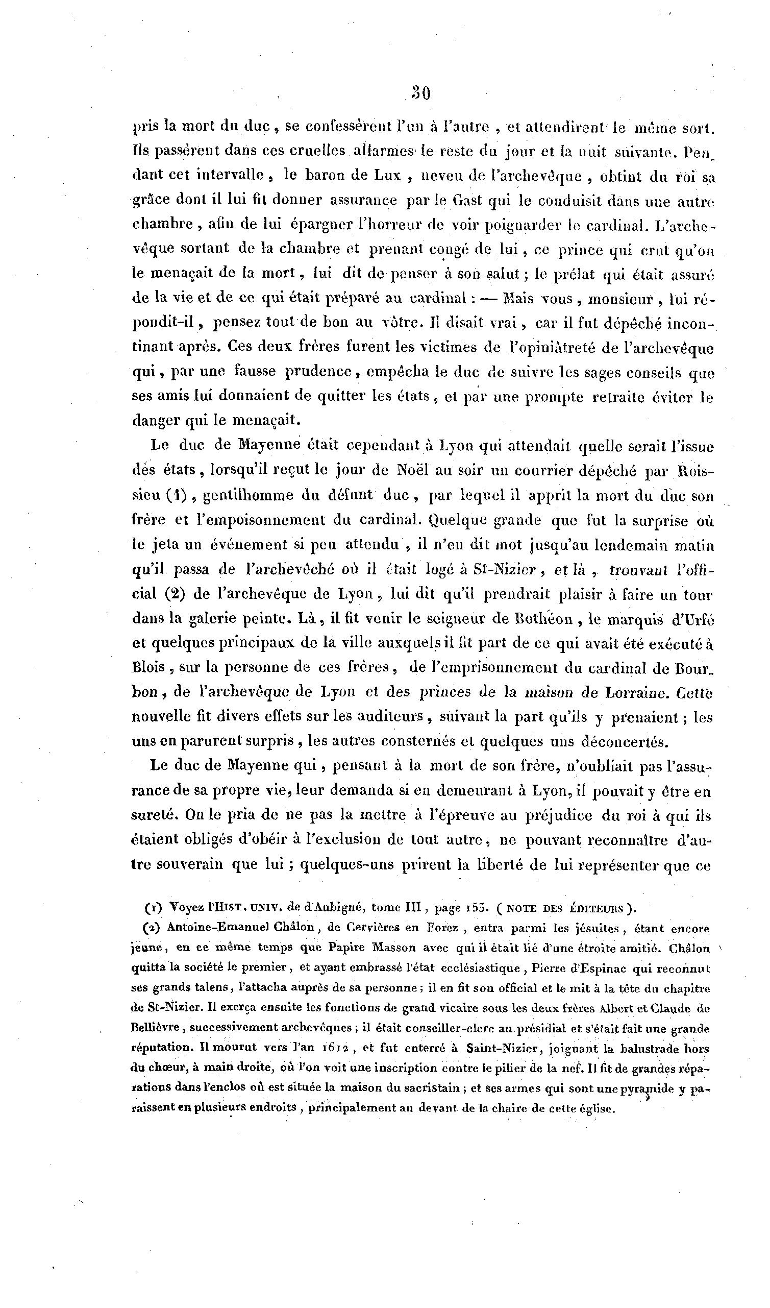 30 pris la mort du duc , se confessèrent l'un à l'autre , et attendirent le même sort. Ils passèrent dans ces cruelles allarmes le reste du jour et la nuit suivante. Pen_ dant cet intervalle , le baron de Lux , neveu de l'archevêque , obtint du roi sa grâce dont il lui fit donner assurance parle Gast qui le conduisit dans une autre chambre , afin de lui épargner l'horreur de voir poignarder le cardinal, h'arche- vêque sortant de la chambre et prenant congé de lui, ce prince qui crut qu'on le menaçait de la mort, lui dit de penser à son salut ; le prélat qui était assuré de la vie et de ce qui était préparé au cardinal : — Mais vous , monsieur , lui ré- pondit-il , pensez tout de bon au vôtre. Il disait vrai, car il fut dépéché incon- tinant après. Ces deux frères furent les victimes de l'opiniâtreté de l'archevêque qui, par une fausse prudence, empêcha le duc de suivre les sages conseils que ses amis lui donnaient de quitter les états, et par une prompte retraite éviter le danger qui le menaçait. Le duc de Mayenne était cependant à Lyon qui attendait quelle serait l'issue des états, lorsqu'il reçut le jour de Noël au soir un courrier dépéché par Rois- sicu (1) , gentilhomme du défunt duc , par lequel il apprit la mort du duc son frère et l'empoisonnement du cardinal. Quelque grande que fut la surprise où le jeta un événement si peu attendu , il n'eu dit mot jusqu'au lendemain matin qu'il passa de l'archevêché où il était logé à Sl'-Nizier, et là , trouvant l'offi- clal (2) de l'archevêque de Lyon , lui dit qu'il prendrait plaisir à faire un tour dans la galerie peinte. Là , il fit venir le seigneur de Bothéon , le marquis d'IMé et quelques principaux de la ville auxquels il (it part de ce qui avait été exécuté à Blois , sur la personne de ces frères, de l'emprisonnement du cardinal de Bour. bon, de l'archevêque de Lyon et des princes de la maison de Lorraine. Cette nouvelle fit divers effets sur les auditeurs , suivant la part qu'ils y prenaient ; les uns en parurent surpris , les autres consternés et quelques uns déconcertés. Le duc de Mayenne qui, pensant à la mort de son frère, n'oubliait pas l'assu- rance de sa propre vie, leur demanda si en demeurant à Lyon, il pouvait y être en sûreté. On le pria de ne pas la mettre à l'épreuve au préjudice du roi à qui ils étaient obligés d'obéir à l'exclusion de tout autre, ne pouvant reconnaître d'au- tre souverain que lui ; quelques-uns prirent la liberté de lui représenter que ce ( l ) Voyez l'HlST. UJNIV. de d'Aubigné, tome I I I , page l55. ( PJOTE DES ÉDITEURS). (a) Antoine-Emanuel Châlon, de Cei'vières en Forez , entra parmi les jésuites , étant encore jeune, en ce même temps que Papire Masson avec qui il était lié d'une étroite amitié. Châlon quitta la société le premier, et ay,ant embrassé l'état ecclésiastique , Pierre d'Espinac qui reconnu t ses grands talens, l'attacha auprès de sa personne ; il en fit son officiai et le mit à la tête du chapitre de St-Nizier. Il exerça ensuite les fonctions de grand vicaire sous les deux frères Albert et Claude de BeUièvre, successivement archevêques ; il était conseiller-clerc au présidial et s'était fait une grande réputation. Il mourut vers l'an 1613 , et fut enterré à Saint-Nizier, Joignant la balustrade hors du chœur, à main droite, où l'on voit une inscription contre le pilier de la nef. Il fit de grandes répa- rations dans l'enclos où est située la maison du sacristain ; et ses armes qui sont une pyramide y p a - raissent en plusieurs endroits , principalement au devant de la chaire de cette église.