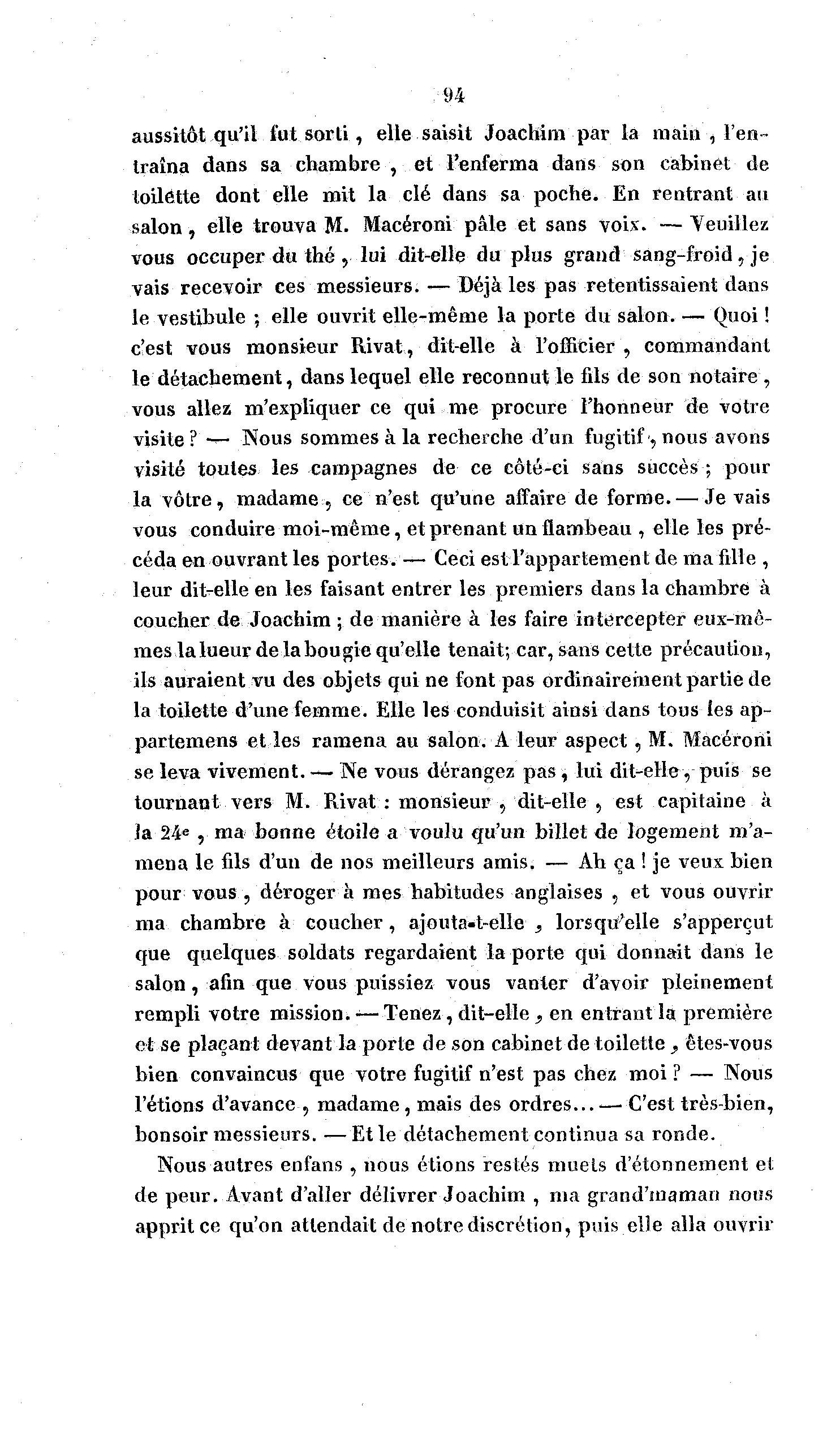 94 aussitôt qu'il fut sorti, elle saisit Joachim par la main , l'en- traîna dans sa chambre , et l'enferma dans son cabinet de toilette dont elle mit la clé dans sa poche. En rentrant an salon, elle trouva M. Macéroni pâle et sans voix. — Yeuillez vous occuper du thé , lui dit-elle du plus grand sang-froid, je vais recevoir ces messieurs. — Déjà les pas retentissaient dans le vestibule ; elle ouvrit elle-même la porte du salon. — Quoi ! c'est vous monsieur Rivât, dit-elle à l'officier , commandant le détachement, dans lequel elle reconnut le fds de son notaire , vous allez m'expliquer ce qui me procure l'honneur de votre visite ? -r- Nous sommes à la recherche d'un fugitif', nous avons visité toutes les campagnes de ce côté-ci sans succès ; pour la vôtre, madame, ce n'est qu'une affaire de forme. — Je vais vous conduire moi-même, et prenant un flambeau , elle les pré- céda en ouvrant les portes. — Ceci est l'appartement de ma fille , leur dit-elle en les faisant entrer les premiers dans la chambre à coucher de Joachim ; de manière à les faire intercepter eux-mê- mes la lueur de la bougie qu'elle tenait; car, sans cette précaution, ils auraient vu des objets qui ne font pas ordinairement partie de la toilette d'une femme. Elle les conduisit ainsi dans tous les ap- partenions et les ramena au salon. A leur aspect, M. Macéroni se leva vivement. — Ne vous dérangez pas, lui dit-elle, puis se tournant vers M. Rivât : monsieur , dit-elle , est capitaine à la 24e , ma bonne étoile a voulu qu'un billet de logement m'a- mena le fils d'un de nos meilleurs amis. — Ah ça ! je veux bien pour vous , déroger à mes habitudes anglaises , et vous ouvrir ma chambre à coucher, ajouta-t-elle , lorsqu'elle s'apperçut que quelques soldats regardaient la porte qui donnait dans le salon, afin que vous puissiez vous vanter d'avoir pleinement rempli votre mission. -— Tenez, dit-elle , en entrant la première et se plaçant devant la porte de son cabinet de toilette , êtes-vous bien convaincus que votre fugitif n'est pas chez moi ? — Nous l'étions d'avance , madame, mais des ordres... — C'est très-bien, bonsoir messieurs. — Et le détachement continua sa ronde. Nous autres enfans , nous étions restés muets d'étonnement et: de peur. Avant d'aller délivrer Joachim , ma grand'maman nous apprit ce qu'on attendait de notre discrétion, puis elîe alla ouvrir