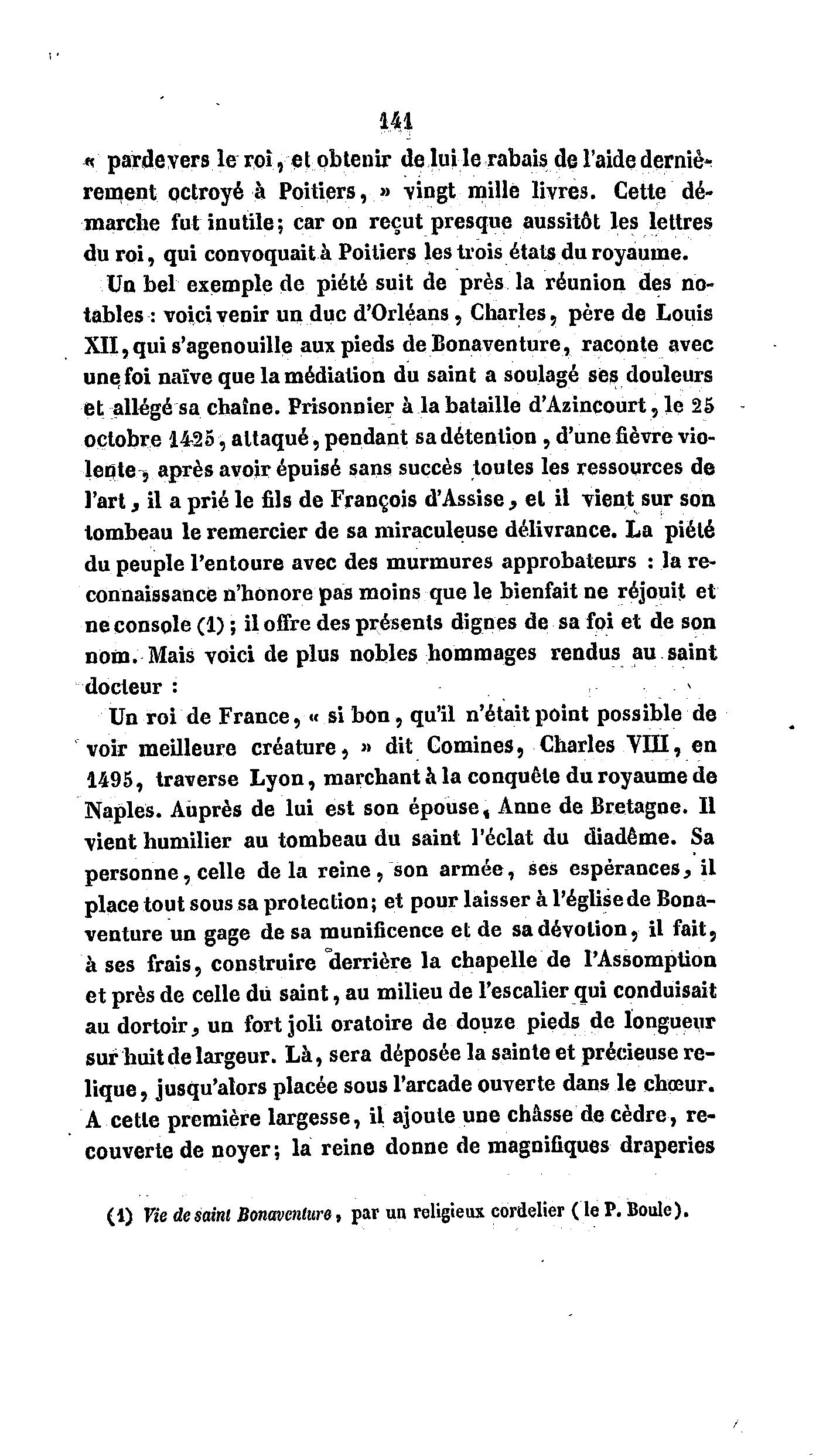 Mi « pardevers le roi, et obtenir de lui le rabais de l'aide derniè- rement octroyé à Poitiers, » -vingt mille livres. Cette dé- marche fut inutile; car on reçut presque aussitôt les lettres du roi, qui convoquait à Poitiers les trois états du royaume. Un bel exemple de piété suit de près la réunion des no- tables : voici venir un duc d'Orléans, Charles, père de Louis XII, qui s'agenouille aux pieds deBonaventure, raconte avec une foi naïve que la médiation du saint a soulagé ses douleurs et allégé sa chaîne. Prisonnier à la bataille d'Âzincourt, le 25 octobre 1425, attaqué, pendant sa détention , d'une fièvre vio- lente, après avoir épuisé sans succès toutes les ressources de l'art, il a prié le fils de François d'Assise , et il vient sur son tombeau le remercier de sa miraculeuse délivrance. La piété du peuple l'entoure avec des murmures approbateurs : la re- connaissance n'honore pas moins que le bienfait ne réjouit et ne console (1) ; il offre des présents dignes de sa foi et de son nom. Mais voici de plus nobles hommages rendus au saint docteur : * Un roi de France, « si bon, qu'il n'était point possible de voir meilleure créature, » dit Comines, Charles VIII, en 1495, traverse Lyon, marchant à la conquête du royaume de Naples. Auprès de lui est son épouse, Anne de Bretagne. Il vient humilier au tombeau du saint l'éclat du diadème. Sa personne, celle delà reine, son armée, ses espérances., il place tout sous sa protection; et pour laisser â l'église de Bona- venture un gage de sa munificence et de sa dévotion, il fait, à ses frais, construire derrière la chapelle de l'Assomption et près de celle dû saint, au milieu de l'escalier qui conduisait au dortoir, un fort joli oratoire de douze pieds de longueur sur huit de largeur. Là , sera déposée la sainte et précieuse re- lique, jusqu'alors placée sous l'arcade ouverte dans le chœur. A cette première largesse, il ajoute une châsse de cèdre, re- couverte de noyer; la reine donne de magnifiques draperies (1) Vie de saint Bonavmtwe, par un religieux cordelier (le P. Boule).