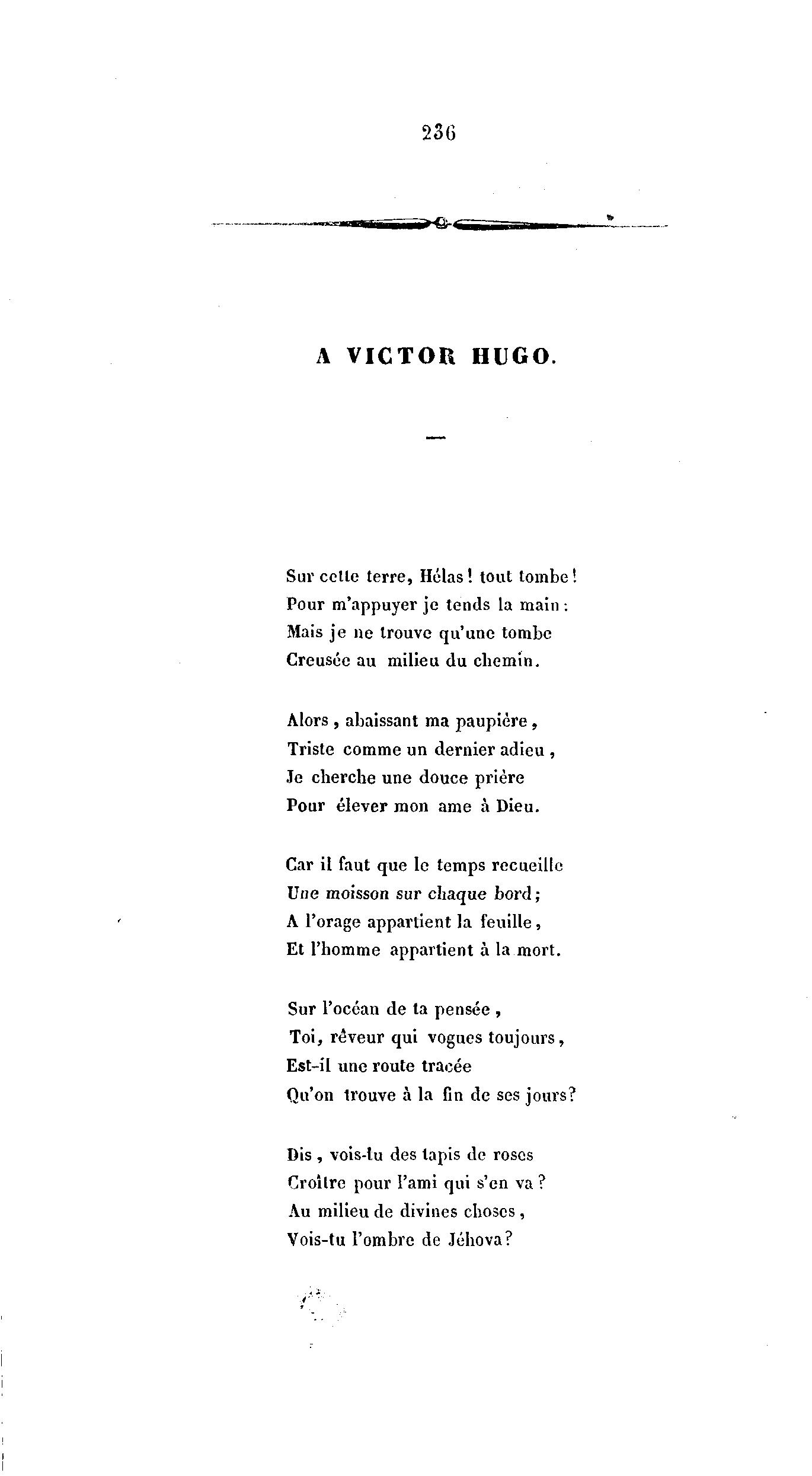 23G A VICTOR HUGO. Sur celle terre, Hélas ! tout tombe ! Pour m'appuyer je lends la main : Mais je ne trouve qu'une tombe Creusée au milieu du chemin. Alors , abaissant ma paupière, Triste comme un dernier adieu , Je cherche une douce prière Pour élever mon ame à Dieu. Car il faut que le temps recueille Une moisson sur chaque bord ; A l'orage appartient la feuille, Et l'homme appartient à la mort. Sur l'océan de la pensée , Toi, rêveur qui vogues toujours, Est-il une route tracée Qu'on trouve à la fin de ses jours? Dis , vois-lu des lapis de roses Croître pour l'ami qui s'en va ? Au milieu de divines choses, Vois-tu l'ombre de Jéhova?