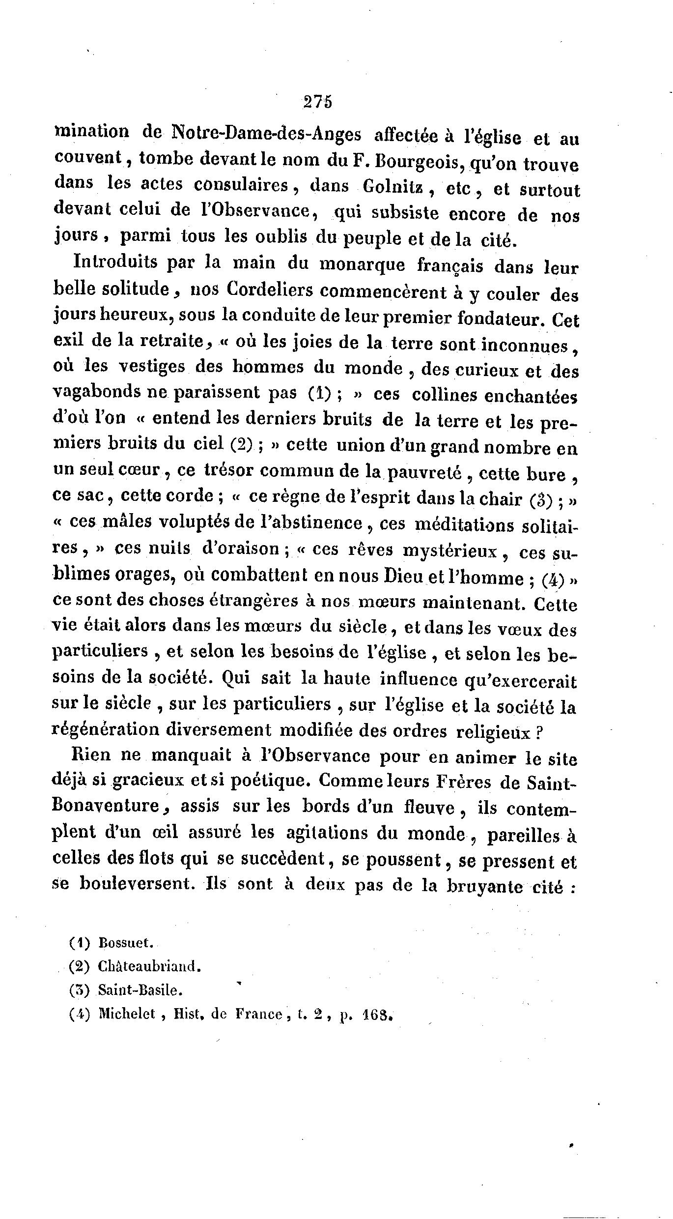 275 roination de Notre-Dame-des-Anges affectée à l'église et au couvent, tombe devant le nom du F. Bourgeois, qu'on trouve dans les actes consulaires, dans Colnitz , etc, et surtout devant celui de l'Observance, qui subsiste encore de nos jours . parmi tous les oublis du peuple et de la cité. Introduits par la main du monarque français dans leur belle solitude, nos Cordeliers commencèrent à y couler des jours heureux, sous la conduite de leur premier fondateur. Cet exil de la retraite ^ « où les joies de la terre sont inconnues, où les vestiges des hommes du monde , des curieux et des vagabonds ne paraissent pas (1) ; » ces collines enchantées d'où l'on « entend les derniers bruits de la terre et les pre- miers bruits du ciel (2) ; » cette union d'un grand nombre en un seul cœur, ce trésor commun de la pauvreté , cette bure , ce sac, cette corde ; « ce règne de l'esprit dans la chair (3) ; » « ces mâles voluptés de l'abstinence, ces méditations solitai- res , » ces nuits d'oraison ; « ces rêves mystérieux , ces su- blimes orages, où combattent en nous Dieu et l'homme ; (4) » ce sont des choses étrangères à nos mœurs maintenant. Cette vie était alors dans les mœurs du siècle, et dans les vœux des particuliers , et selon les besoins de l'église , et selon les be- soins de la société. Qui sait la haute influence qu'exercerait sur le siècle , sur les particuliers , sur l'église et la société la régénération diversement modifiée des ordres religieux ? Rien ne manquait à l'Observance pour en animer le site déjà si gracieux et si poétique. Comme leurs Frères de Saint- Bonaventure, assis sur les bords d'un fleuve, ils contem- plent d'un œil assuré les agitations du monde, pareilles à celles des flots qui se succèdent, se poussent, se pressent et se bouleversent. Ils sont à deux pas de la bruyante cité : (1) Bossuet. (2) Chateaubriand. (3) Saint-Basile. (4) Michelet , Hisl. de France, t. 2 , p. 16S.