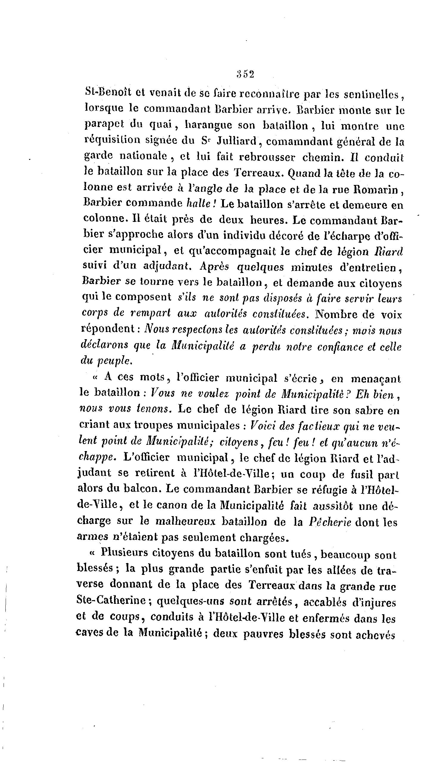 852 St-Benoît et venait de se faire reconnaître par les sentinelles, lorsque le commandant Barbier arrive. Barbier monte sur le parapet du quai, harangue son bataillon , lui montre une réquisition signée du Sr Julliard, comamndant général de la garde nationale , et lui fait rebrousser chemin. Il conduit le bataillon sur la place des Terreaux. Quand !a tète de la co- lonne est arrivée à l'angle de la place et de la rue Romarin , Barbier commande halte ! Le bataillon s'arrête et demeure en colonne. Il était près de deux heures. Le commandant Bar- bier s'approche alors d'un individu décoré de I'écharpe d'offi- cier municipal, et qu'accompagnait le chef de légion Riard suivi d'un adjudant. Après quelques minutes d'entretien, Barbier se tourne vers le bataillon, et demande aux citoyens qui le composent s'ils ne sont pas disposés à faire servir leurs corps de rempart aux autorités constituées. Nombre de voix répondent : Nous respectons les autorités constituées ; mois nous déclarons que la Municipalité a perdu notre confiance et celle du peuple. « A ces mots, l'officier municipal s'écrie, en menaçant le bataillon : Vous ne voulez point de Municipalité ? Eh bien, nous vous tenons. Le chef de légion Riard lire son sabre en criant aux troupes municipales : Voici des factieux gui ne veu- lent point de Municipalité; citoyens, feu ! feu ! et qu'aucun n'é- chappe. L'officier municipal, le chef de légion Riard et l'ad- judant se retirent à l'Hôtel-de-Ville; un coup de fusil pari alors du balcon. Le commandant Barbier se réfugie à l'Hôtel- de-Ville, et le canon de la Municipalité fait aussitôt une dé- charge sur le malheureux bataillon de la Pêcherie dont les armes n'étaient pas seulement chargées. « Plusieurs citoyens du bataillon sont tués , beaucoup son t blessés ; la plus grande partie s'enfuit par les allées de tra- verse donnant de la place des Terreaux dans la grande rue Ste-Catherine; quelques-uns sont arrêtés, accablés d'injures et de coups, conduits à l'Hôtel-de-Ville et enfermés dans les caves de la Municipalité ; deux pauvres blessés sont achevés