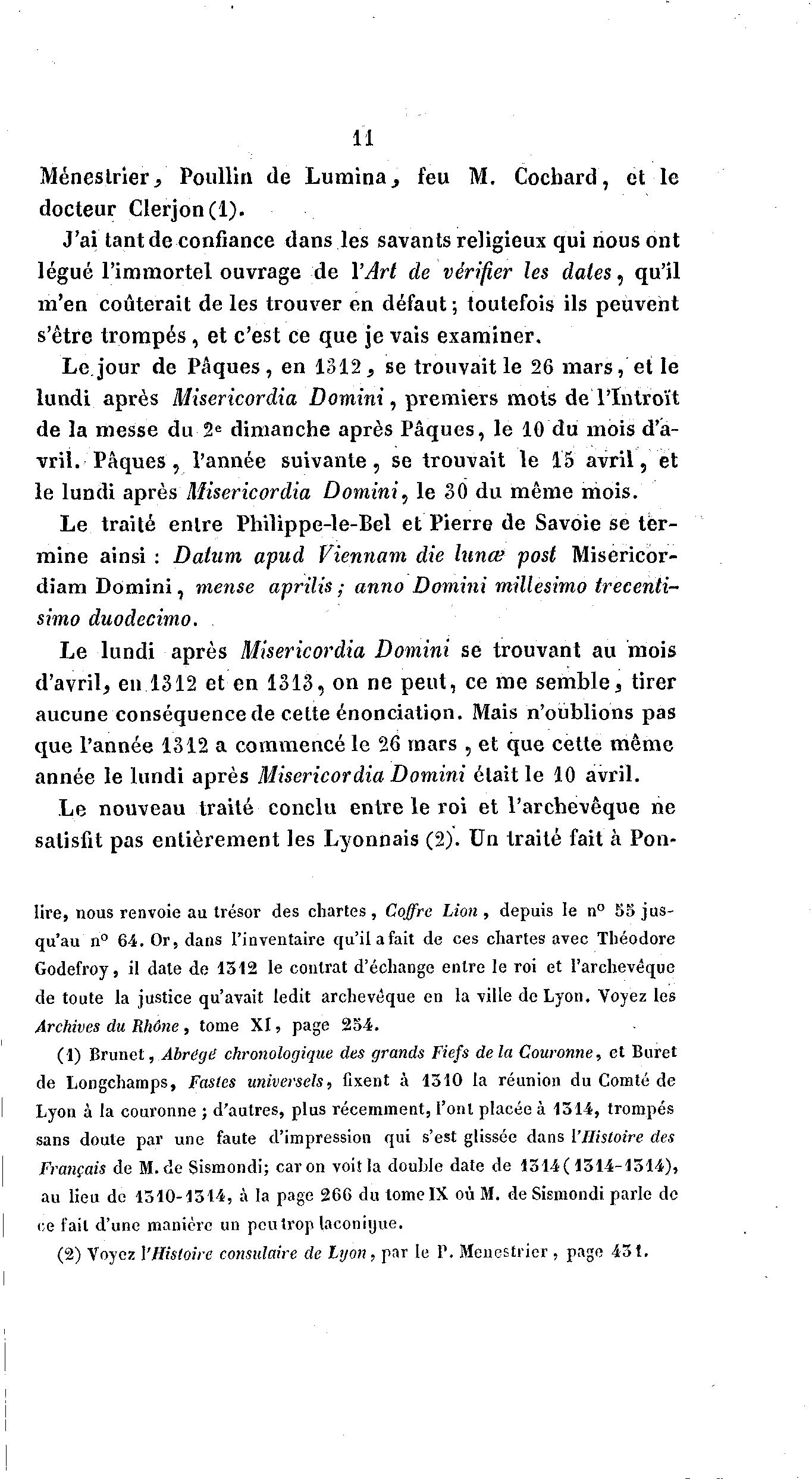 11 Méneslrier, Poullin de Lumina, feu M. Cochard, et le docteur Clerjon(l). J'ai tant de confiance dans les savants religieux qui nous ont légué l'immortel ouvrage de l'Art de vérifier les dates, qu'il m'en coûterait de les trouver en défaut; toutefois ils peuvent s'être trompés, et c'est ce que je vais examiner. Le. jour de Pâques, en 1312, se trouvait le 26 mars, et le lundi après Misericordia Domini, premiers mots de l'Introït de la messe du 2e dimanche après Pâques, le 10 du mois d'a- vril. Pâques , l'année suivante, se trouvait le 15 avril, et le lundi après Misericordia Domini, le 30 du même mois. Le traité entre Philippe-le-Bel et Pierre de Savoie se ter- mine ainsi : Datum apud Viennam die lunœ post Misericor- diam Domini, mense aprilis ; anno Domini millesimo trecenti- simo duodecimo. Le lundi après Misericordia Domini se trouvant au mois d'avril, en 1312 et en 1313, on ne peut, ce me semble, tirer aucune conséquence de cette énonciation. Mais n'oublions pas que l'année 1312 a commencé le 26 mars , et que cette même année le lundi après Misericordia Domini était le 10 avril. Le nouveau traité conclu entre le roi et l'arcbevêque ne satisfit pas entièrement les Lyonnais (2). Un traité fait à Pon- lire, nous renvoie au trésor des chartes, Coffre Lion, depuis le n° 83 jus- qu'au n° 64. Or, dans l'inventaire qu'il afait de ces chartes avec Théodore Godefroy, il date de 1312 le contrat d'échange entre le roi et l'archevêque de toute la justice qu'avait ledit archevêque en la ville de Lyon. Voyez les Archives du Rhône , tome XI, page 254. (1) Brunet, Abrégé chronologique des grands Fiefs delà Couronne, et Buret de Longchamps, Fastes universels, fixent à 1310 la réunion du Comté de Lyon à la couronne ; d'autres, plus récemment, l'ont placée à 1314, trompés sans doute par une faute d'impression qui s'est glissée dans l'Histoire des Français de M.de Sismondi; caron voit la double date de 1314(1314-1314), au lieu de 1310-1314, à la page 266 du tome IX où M. de Sismondi parle de ce fait d'une manière un peu trop laconiijue. (2) Voyez l'Histoire consulaire de Lyon, par le P. Mencstrier , page 43t.