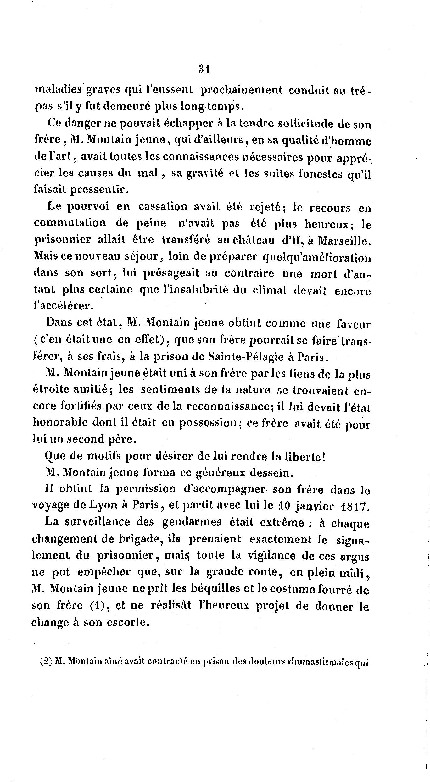 31 maladies graves qui l'eussent prochainement conduit au tré- pas s'il y fut demeuré plus long temps. Ce danger ne pouvait échapper à la tendre sollicitude de son frère, M. Montain j e u n e , qui d'ailleurs, en sa qualité d'homme de l'art, avait toutes les connaissances nécessaires pour appré- cier les causes du m a l , sa gravité et les suites funestes qu'il faisait pressentir. Le pourvoi en cassation avait été rejeté; le recours en commutation de peine n'avait pas été plus heureux; le prisonnier allait être transféré au château d'If, à Marseille. Mais ce nouveau séjour, loin de préparer quelqu'amélioralion dans son sort, lui présageait au contraire une mort d'au- tant plus certaine que l'insalubrité du climat devait encore l'accélérer. Dans cet état, M. Montain jeune obtint comme une faveur (c'en était une en effet), que son frère pourrait se faire trans- férer, à ses frais, à la prison de Sainte-Pélagie à Paris. M. Montain jeune était uni à son frère par les lieus de la plus étroite amitié; les sentiments de la nature ne trouvaient en- core fortifiés par ceux de la reconnaissance; il lui devait l'état honorable dont il était en possession; ce frère avait été pour lui un second père. Que de motifs pour désirer de lui rendre la liberté! M. Montain jeune forma ce généreux dessein. Il obtint la permission d'accompagner son frère dans le voyage de Lyon à Paris, et partit avec lui le 10 janvier 1817. La surveillance des gendarmes était extrême : à chaque changement de brigade, ils prenaient exactement le signa- lement du prisonnier, mais toute la vigilance de ces argus ne put empêcher que, sur la grande route, en plein m i d i , M. Montain jeune ne prît les béquilles et le costume fourré de son frère (1), et ne réalisât l'heureux projet de donner le change à son escorte. (2) M, Monlain aîné avait coniraclé en prison des douleurs rhumastismalesqui