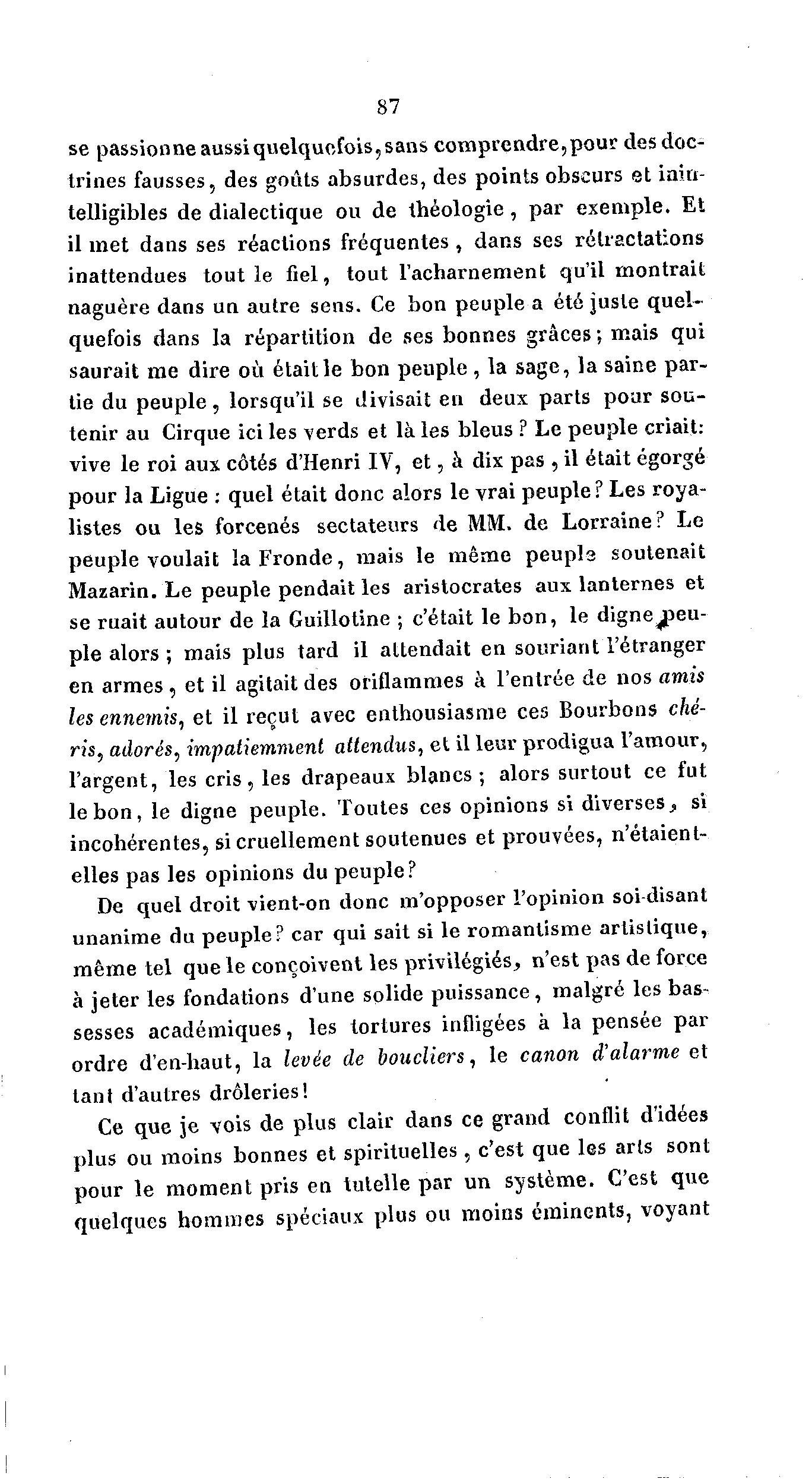 87 se passionneaussiquelquefoiSjsans comprendre,pour des doc- trines fausses, des goûts absurdes, des points obscurs et inin- telligibles de dialectique ou de théologie, par exemple. Et il met dans ses réactions fréquentes , dans ses rétractations inattendues tout le fiel, tout l'acharnement qu'il montrait naguère dans un autre sens. Ce bon peuple a été juste quel- quefois dans la répartition de ses bonnes grâces ; mais qui saurait me dire où était le bon peuple , la sage, la saine par- tie du p e u p l e , lorsqu'il se divisait en deux parts pour sou- tenir au Cirque ici les verds et là les bleus ? Le peuple criait: vive le roi aux côtés d'Henri IV, e t , à dix pas , il était égorgé pour la Ligue : quel était donc alors le vrai peuple? Les roya- listes ou les forcenés sectateurs de MM. de Lorraine? Le peuple voulait la F r o n d e , mais le même peupla soutenait Mazarin. Le peuple pendait les aristocrates aux lanternes et se ruait autour de la Guillotine ; c'était le b o n , le digne peu- ple alors ; mais plus tard il attendait en souriant l'étranger en a r m e s , et il agitait des oriflammes à l'entrée de nos amis les ennemis, et il reçut avec enthousiasme ces Bourbons ché- ris, adorés, impatiemment attendus, et il leur prodigua l'amour, l'argent, les c r i s , les drapeaux b l a n c s ; alors surtout ce fut le b o n , le digne peuple. Toutes ces opinions si diverses, si incohérentes, si cruellement soutenues et prouvées, n'étaient- elles pas les opinions du peuple? De quel droit vient-on donc m'opposer l'opinion soi-disant unanime du peuple? car qui sait si le romantisme artistique, même tel que le conçoivent les privilégiés, n'est pas de force à jeter les fondations d'une solide puissance, malgré les bas- sesses académiques, les tortures infligées à la pensée par ordre d'en-haut, la levée de boucliers, le canon d'alarme et tant d'autres drôleries! Ce que je vois de plus clair dans ce grand conflit d'idées plus ou moins bonnes et spirituelles, c'est que les arls sont pour le moment pris en tutelle par un système. C'est que quelques hommes spéciaux plus ou moins éminents, voyant