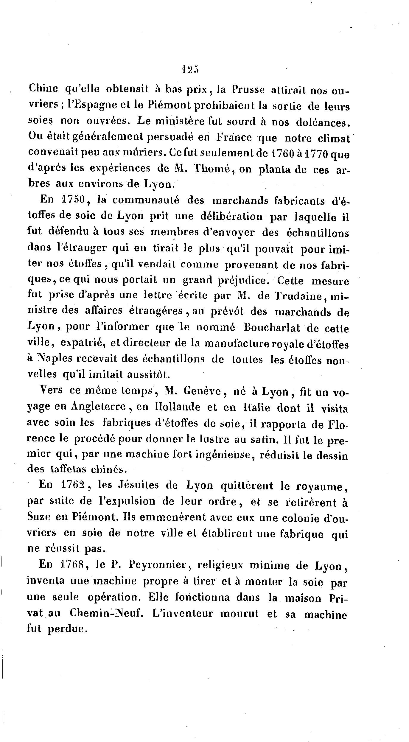 125 Chine qu'elle obtenait à bas prix, la Prusse attirail nos ou- vriers ; l'Espagne et le Piémont prohibaient la sortie de leurs soies non ouvrées. Le ministère fut sourd à nos doléances. Ou était généralement persuadé en France que notre climat convenait peu aux mûriers. Ce fut seulement de 1760 à 1770 que d'après les expériences de M. T h o m é , on planta de ces ar- bres aux environs de Lyon. En 1750, la communauté des marchands fabricants d'é- toffes de soie de Lyon prit une délibération par laquelle il fut défendu à tous ses membres d'envoyer des échantillons dans l'étranger qui en tirait le plus qu'il pouvait pour imi- ter nos étoffes, qu'il vendait comme provenant de nos fabri- ques, ce qui nous portail un grand préjudice. Cette mesure fut prise d'après une lettre écrite par M. de Trudaine, m i - nistre des affaires étrangères, au prévôt des marchands de L y o n , pour l'informer que le nommé Boucharlat de cette ville, expatrié, et directeur de la manufacture royale d'étoffes à Naples recevait des échantillons de toutes les étoffes nou- velles qu'il imitait aussitôt. Vers ce même t e m p s , M. Genève, né à L y o n , fit un vo- yage en Angleterre, en Hollande et en Italie dont il visita avec soin les fabriques d'étoffes de soie, il rapporta de Flo- rence le procédé pour donner le lustre au satin. Il fut le pre- mier q u i , par une machine fort ingénieuse, réduisit le dessin des taffetas chinés. En 1762, les Jésuites de Lyon quittèrent le r o y a u m e , par suite de l'expulsion de leur o r d r e , et se retirèrent à Suze en Piémont. Ils emmenèrent avec eux une colonie d'ou- vriers en soie de notre ville et établirent une fabrique qui ne réussit pas. En 1768, le P. Peyronnier, religieux minime de L y o n , inventa une machine propre à tirer et à monter la soie par une seule opération. Elle fonctionna dans la maison Pri- vât au Chemin-Neuf. L'inventeur mourut et sa machine fut perdue.
