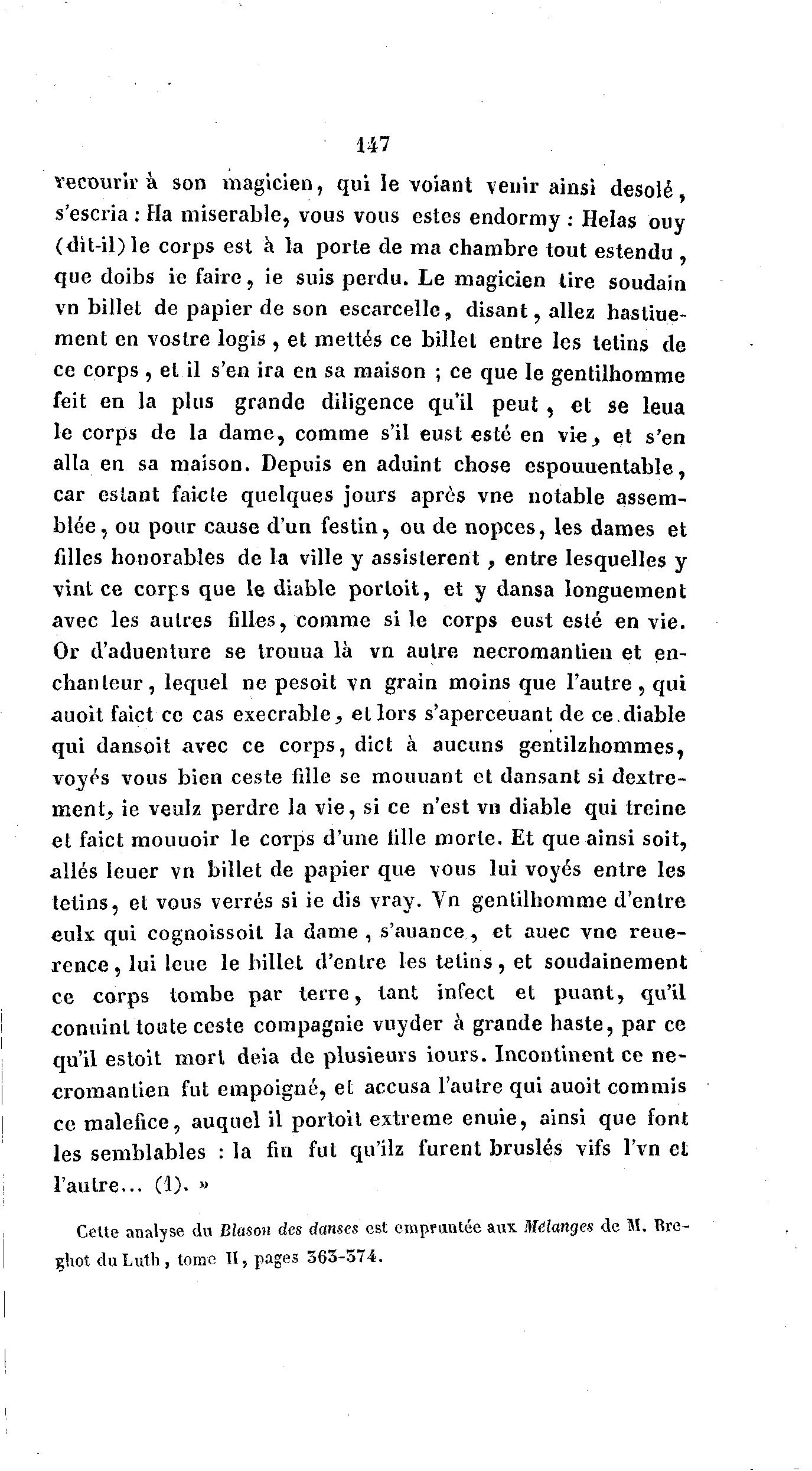 147 recourir à son magicien, qui le voiant venir ainsi désolé s'escria : Ha misérable, vous vous estes endormy : Helas ouy (dit-il) le corps est à la porte de ma chambre tout estendu que doibs ie faire, ie suis perdu. Le magicien lire soudain vn billet de papier de son escarcelle, d i s a n t , allez hastiue- ment en vostre logis , et mettes ce billet entre les tetins de ce corps , et il s'en ira en sa maison ; ce que le gentilhomme feit en la plus grande diligence qu'il p e u t , et se leua le corps de la d a m e , comme s'il eust esté en v i e , et s'en alla en sa maison. Depuis en aduint chose espouuentable, car estant faicle quelques jours après vne notable assem- b l é e , ou pour cause d'un festin, ou de nopces, les dames et filles honorables de la ville y assistèrent , entre lesquelles y vint ce corps que le diable portoit, et y dansa longuement avec les autres filles, comme si le corps eust esté e n v i e . Or d'aduenture se trouua là vn autre necromantien et en- c h a n t e u r , lequel ne pesoit vn grain moins que l ' a u t r e , qui auoit faict ce cas exécrable, et lors s'aperceuant de ce.diable qui dansoit avec ce corps, dict à aucuns gentilzhommes, voyes vous bien ceste fille se mouuant et dansant si dextre- m e n t , ie veulz perdre la vie, si ce n'est vn diable qui treine et faict mouuoir le corps d'une fille morte. Et que ainsi soit, allés leuer vn billet de papier que vous lui voyés entre les tetins, et vous verres si ie dis vray. Vn gentilhomme d'entre eulx qui cognoissoit la dame , s'auance , et auec vne r e u e - rence , lui leue le billet d'entre les tetins , et soudainement ce corps tombe par t e r r e , tant infect et p u a n t , qu'il conuinl toute ceste compagnie vuyder à grande haste, par ce qu'il estoit mort deia de plusieurs iours. Incontinent ce n e - cromantien fut empoigné, et accusa l'autre qui auoit commis ce maléfice, auquel il portoit extrême enuie, ainsi que font les semblables : la fin fut qu'ilz furent bruslés vifs l'vn et l'autre... (1). » Celte analyse du Blason des danses est empruntée aux Mélanges de M. Rre- %\wX du Luth , tome II, pages 363-574.