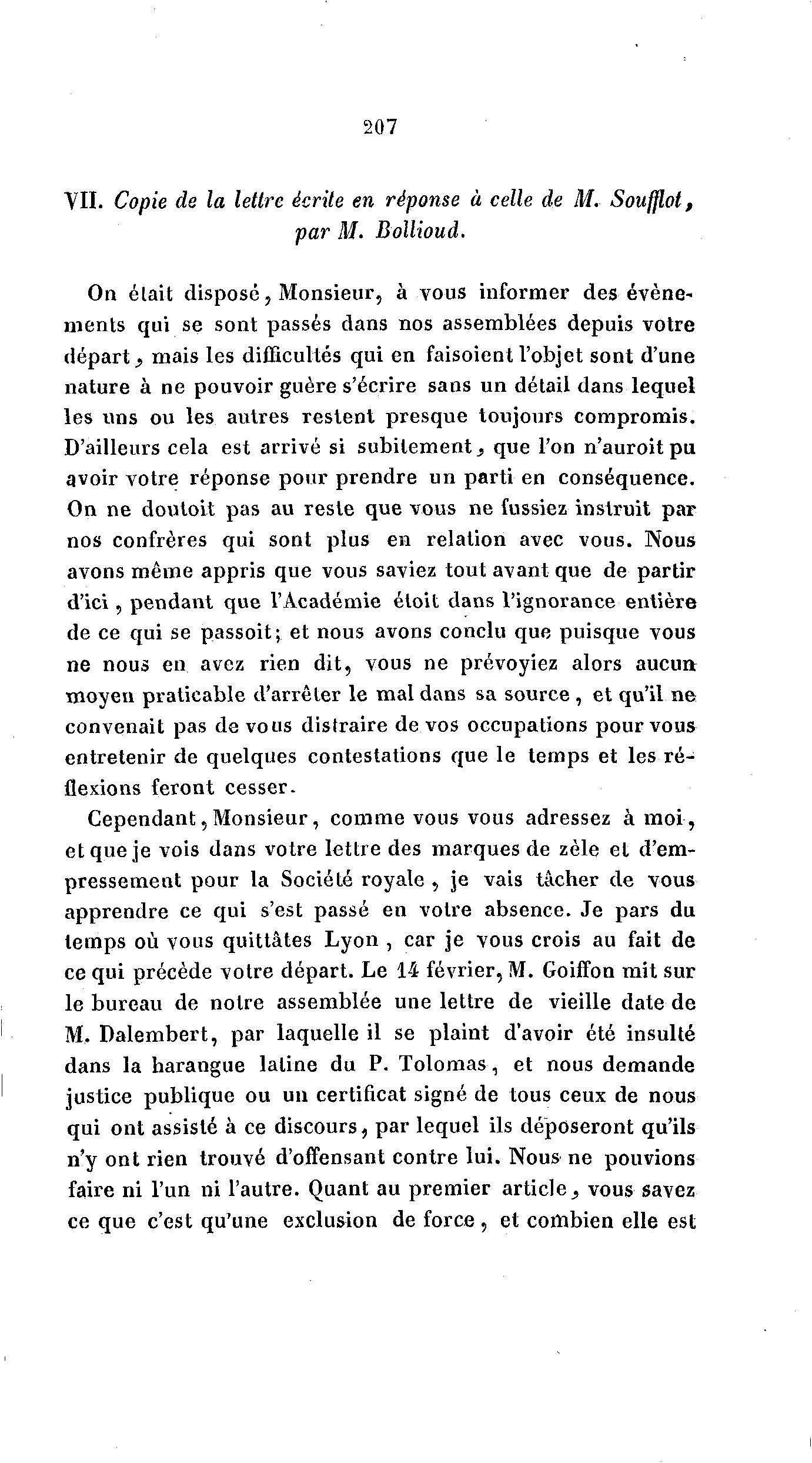 VII. Copie de la lettre écrite en réponse à celle de M. Soufflât,
