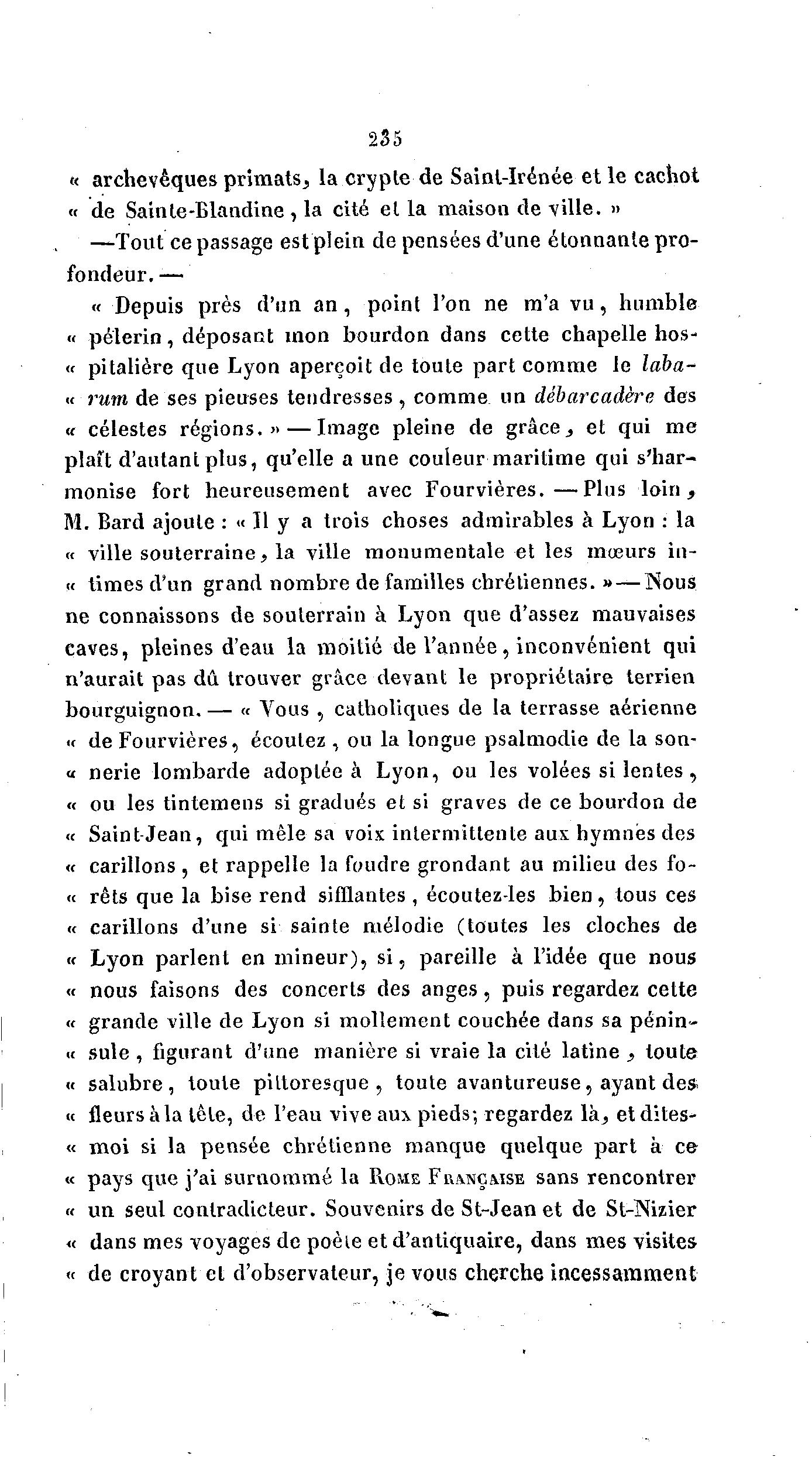 235 « archevêques primats, la crypte de Sainl-Irénée et le cachot « de Sainte-Blandine, la cité et la maison de ville. » —Tout ce passage est plein de pensées d'une étonnante pro- fondeur. — « Depuis près d'un a n , point l'on ne m'a v u , humble « p è l e r i n , déposant mon bourdon dans cette chapelle hos- « pitalière que Lyon aperçoit de toute part comme le laba- « rum de ses pieuses tendresses , comme un débarcadère des « célestes régions.» — Image pleine de grâce., et qui me plaît d'autant plus, qu'elle a une couleur maritime qui s'har- monise fort heureusement avec F o u r v i è r e s . — P l u s l o i n , M. Bard ajoute : « Il y a trois choses admirables à Lyon : la « ville souterraine, la ville monumentale et les mœurs in— « limes d'un grand nombre de familles chrétiennes. » — Nous ne connaissons de souterrain à Lyon que d'assez mauvaises caves, pleines d'eau la moitié de l ' a n n é e , inconvénient qui n'aurait pas dû trouver grâce devant le propriétaire terrien bourguignon. — « Vous , catholiques de la terrasse aérienne •< de Fourvières, écoutez , ou la longue psalmodie de la son- « nerie lombarde adoptée à Lyon, ou les volées si l e n t e s , « ou les tintemens si gradués et si graves de ce bourdon de « Saint-Jean, qui mêle sa voix intermittente aux hymnes des « carillons , et rappelle la foudre grondant au milieu des fo- « rets que la bise rend sifflantes , écoutez-les b i e n , tous ces « carillons d'une si sainte mélodie (toutes les cloches de « Lyon parlent en m i n e u r ) , s i , pareille à l'idée que nous « nous faisons des concerts des a n g e s , puis regardez cette « grande ville de Lyon si mollement couchée dans sa pénin- « suie , figurant d'une manière si vraie la cité latine s toute « salubre, toute pittoresque, toute avantureuse, ayant des « fleurs à la tête, de l'eau vive aux pieds; regardez l à , etdites- « moi si la pensée chrétienne manque quelque part à ce « pays que j'ai surnommé la PVOME FRANÇAISE sans rencontrer « un seul contradicteur. Souvenirs de St-Jean et de St-Nizier « dans mes voyages de poêle et d'antiquaire, dans mes visites « de croyant et d'observateur, je vous cherche incessamment