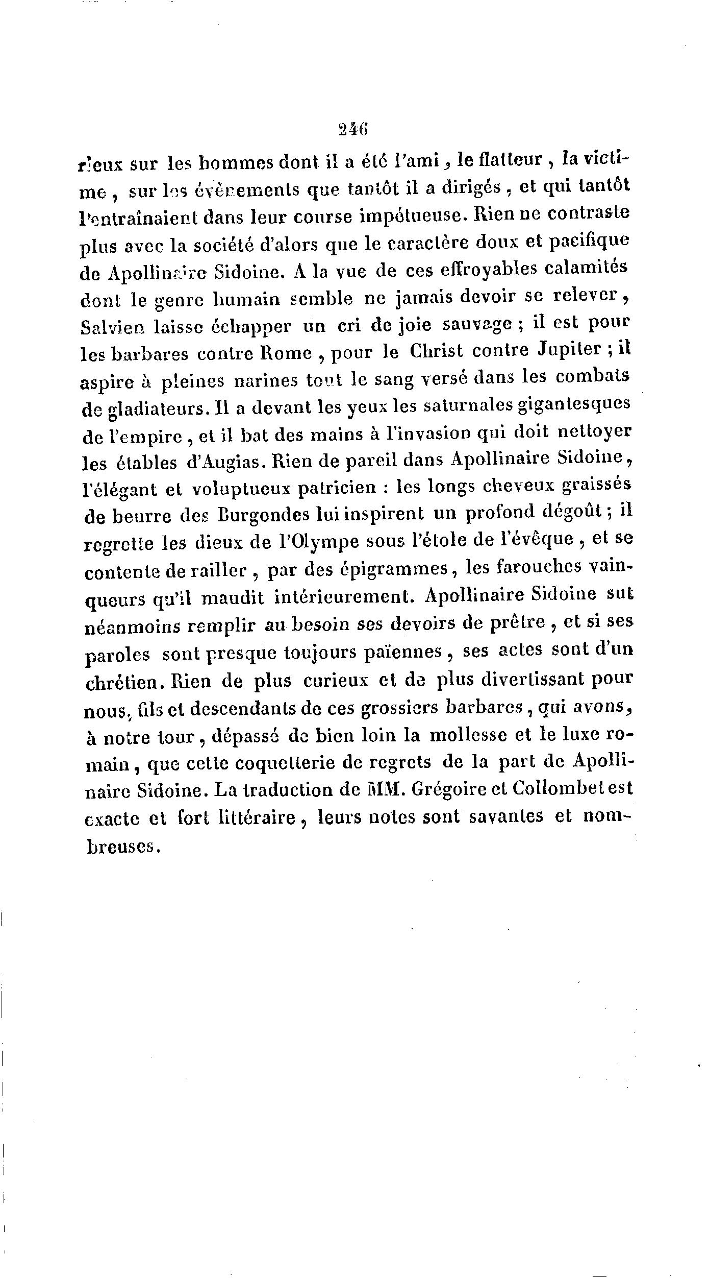246 r'eux sur les hommes dont il a été l'ami, le flatteur, la victi- me , sur les évecements que tantôt il a dirigés , et qui tantôt l'entraînaient dans leur course impétueuse. Rien ne contraste plus avec la société d'alors que le caractère doux et pacifique de Apollinr-'re Sidoine. A la vue de ces effroyables calamités dont le genre humain semble ne jamais devoir se relever, Salvien laisse échapper un cri de joie sauva.ge ; il est pour les barbares contre Rome , pour le Christ contre Jupiter ; il aspire à pleines narines tout le sang versé dans les combats de gladiateurs. Il a devant les yeux les saturnales gigantesques de l'empire , et il bat des mains à l'invasion qui doit nettoyer les élables d'Augias. Rien de pareil dans Apollinaire Sidoine, l'élégant et voluptueux patricien : les longs cheveux graissés de beurre des Burgondes lui inspirent un profond dégoût; il regrette les dieux de l'Olympe sous Pétole de l'évêque , et se contente de railler , par des épigrammes, les farouches vain- queurs qu'il maudit intérieurement. Apollinaire Sidoine sut néanmoins remplir au besoin ses devoirs de prêtre , et si ses paroles sont presque toujours païennes, ses actes sont d'un chrétien. Rien de plus curieux et de plus divertissant pour nous., ûls et descendants de ces grossiers barbares , qui avons^ à notre tour, dépassé de bien loin la mollesse et le luxe ro- main, que cette coquetterie de regrets de la part de Apolli- naire Sidoine. La traduction de MM. Grégoire et Collombetest exacte et fort littéraire, leurs notes sont savantes et nom- breuses.