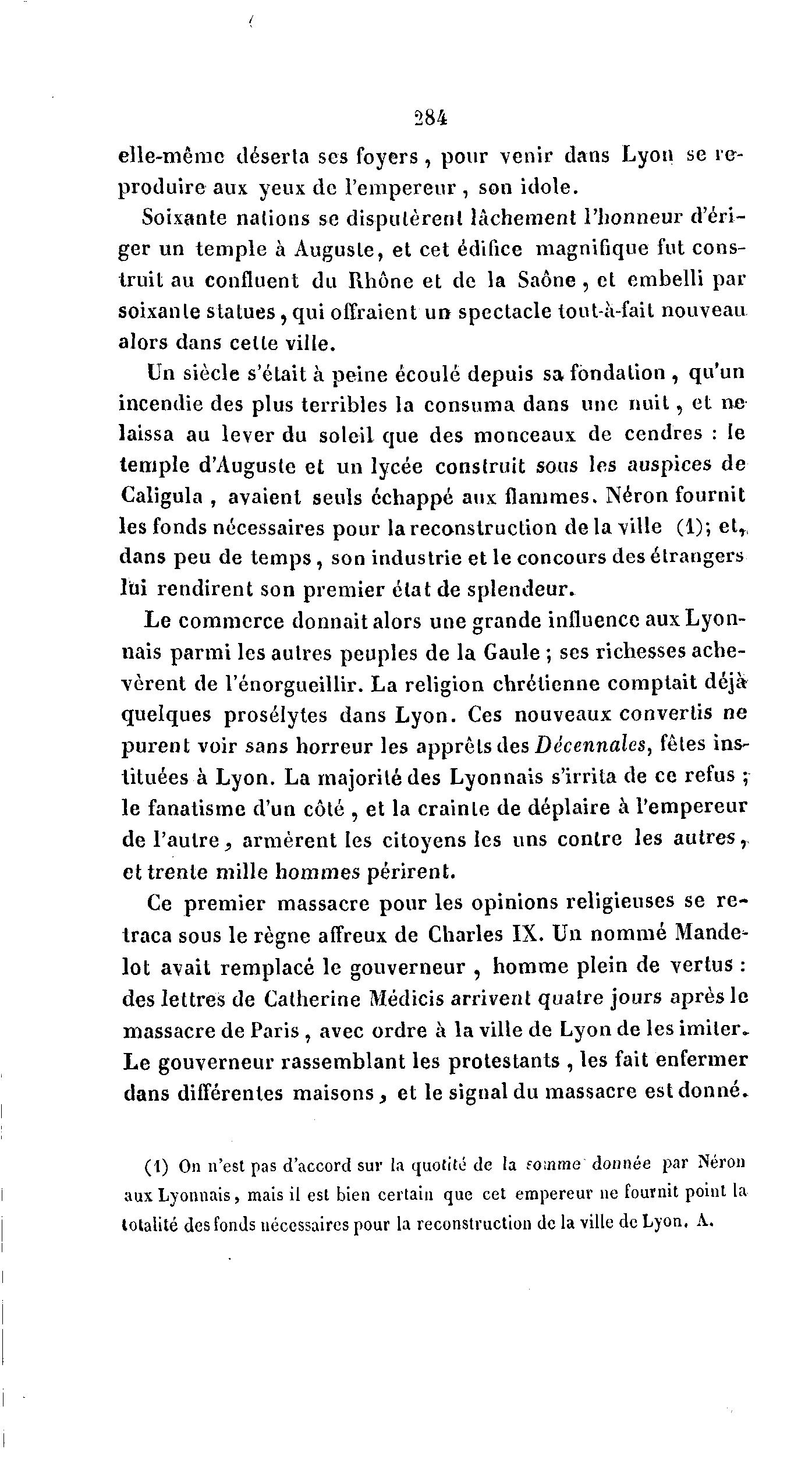 284 elle-même déserta ses foyers , pour venir dans Lyon se re- produire aux yeux de l'empereur , son idole. Soixante nations se disputèrent lâchement l'honneur d'éri- ger un temple à Auguste, et cet édifice magnifique fut cons- truit au confluent du Rhône et de la Saône , et embelli par soixante statues, qui offraient un spectacle lout-à -fait nouveau alors dans celle ville. Un siècle s'était à peine écoulé depuis sa fondation , qu'un incendie des plus terribles la consuma dans une nuit, et ne laissa au lever du soleil que des monceaux de cendres : le temple d'Auguste et un lycée construit sous les auspices de Caligula , avaient seuls échappé aux flammes. Néron fournit les fonds nécessaires pour la reconstruction de la ville (1); ett, dans peu de temps , son industrie et le concours des étrangers lui rendirent son premier état de splendeur. Le commerce donnait alors une grande influence aux Lyon- nais parmi les autres peuples de la Gaule ; ses richesses ache- vèrent de l'enorgueillir. La religion chrétienne comptait déjà quelques prosélytes dans Lyon. Ces nouveaux convertis ne purent voir sans horreur les apprêts des Décennales, fêtes ins- tituées à Lyon. La majorité des Lyonnais s'irrita de ce refus ; le fanatisme d'un côté , et la crainte de déplaire à l'empereur de l'autre, armèrent les citoyens les uns contre les autres, et trente mille hommes périrent. Ce premier massacre pour les opinions religieuses se re- traça sous le règne affreux de Charles IX. Un nommé Mande- lot avait remplacé le gouverneur , homme plein de vertus : des lettres de Catherine Médicis arrivent quatre jours après le massacre de Paris , avec ordre à la ville de Lyon de les imiter. Le gouverneur rassemblant les protestants , les fait enfermer dans différentes maisons, et le signal du massacre est donné. (1) On n'est pas d'accord sur la quotité de la foinme donnée par Néron aux Lyonnais, mais il est bien certain que cet empereur ne fournit point la totalité des fonds nécessaires pour la reconstruction de la ville de Lyon, A.