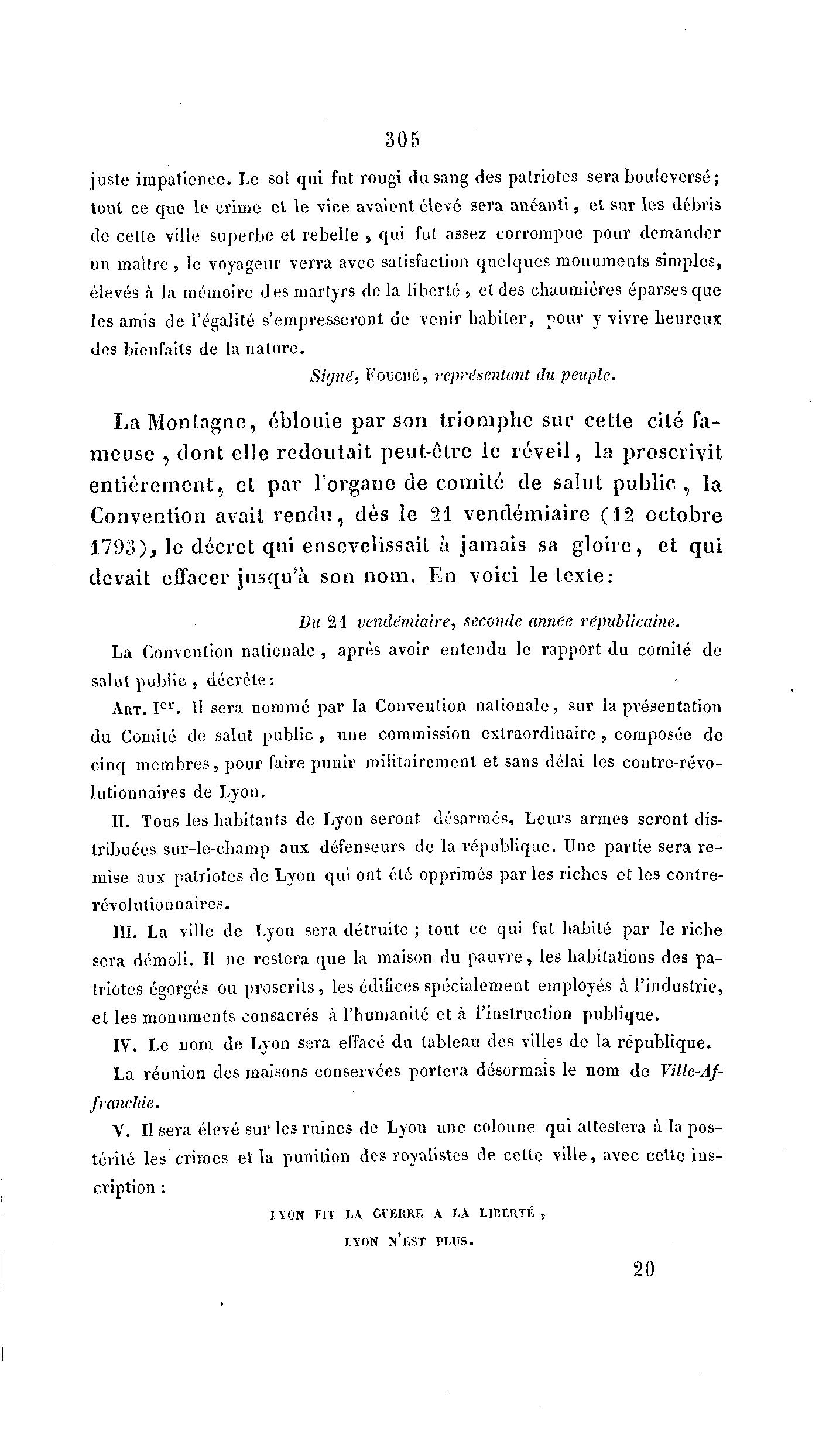 V. Il sera élevé sur les ruines de Lyon une colonne qui attestera à la pos-