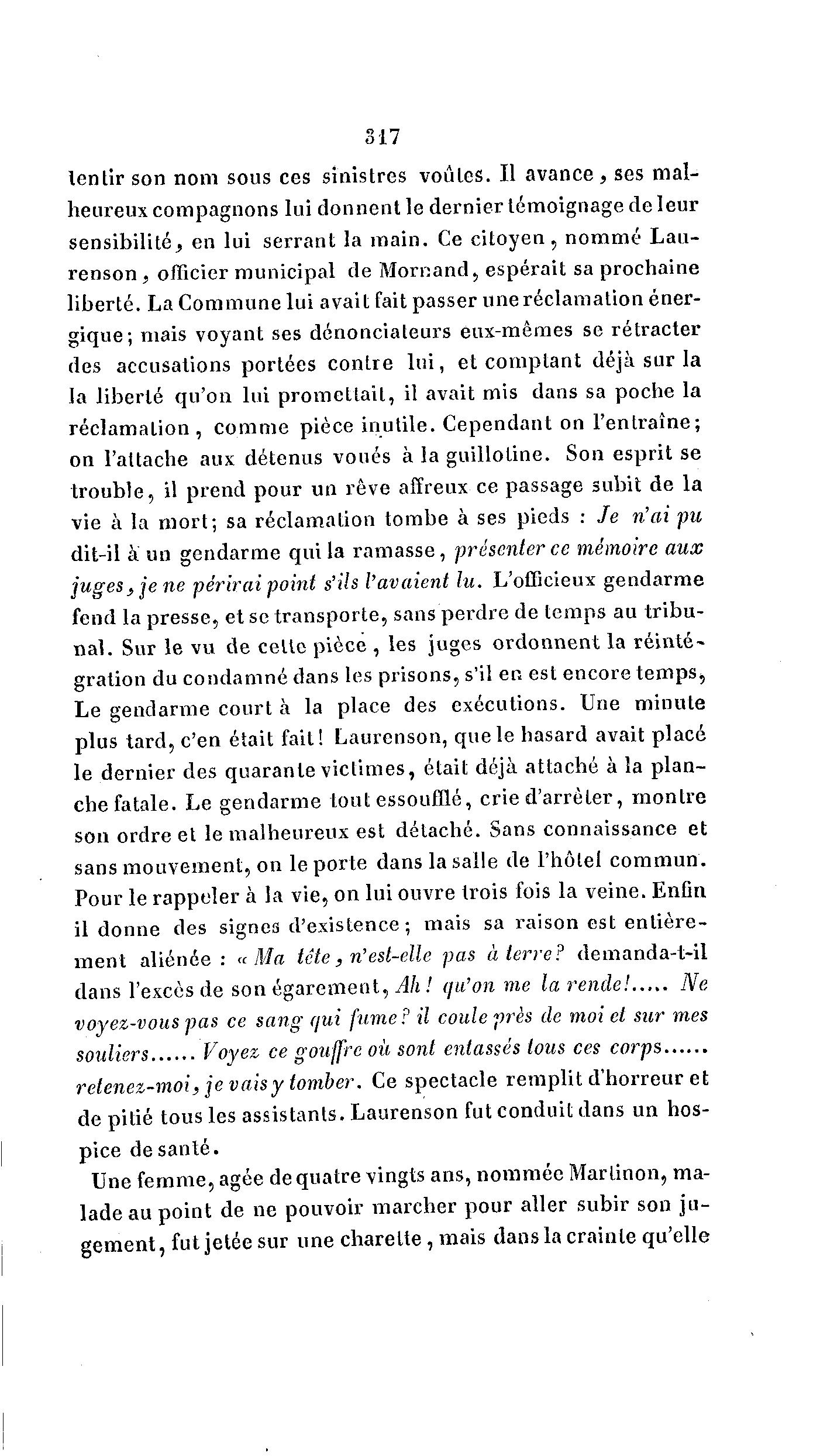 317 lentir son nom sous ces sinistres voûtes. Il a v a n c e , ses mal- heureux compagnons lui donnent le dernier témoignage de leur sensibilité, en lui serrant la main. Ce citoyen, nommé Lau- renson , officier municipal de Mornand, espérait sa prochaine liberté. La Commune lui avait fait passer une réclamation éner- gique; mais voyant ses dénonciateurs eux-mêmes se rétracter des accusations portées contre l u i , et comptant déjà sur la la liberté qu'on lui promettait, il avait mis dans sa poche la réclamation, comme pièce inutile. Cependant on l'entraîne; on l'attache aux détenus voués à la guillotine. Son esprit se trouble, il prend pour un rêve affreux ce passage subit de la vie à la mort; sa réclamation tombe à ses pieds : Je n'ai pu dit-il à un gendarme qui la ramasse, présenter ce mémoire aux juges , je ne périrai point s'ils l'avaient lu. L'officieux gendarme fend la presse, et se transporte, sans perdre de temps au tribu- nal. Sur le vu de celte pièce , les juges ordonnent la réinté- gration du condamné dans les prisons, s'il en est encore temps, Le gendarme court à la place des exécutions. Une minute plus tard, c'en était fait! Laurenson, que le hasard avait placé le dernier des quarante victimes, était déjà attaché à la plan- che fatale. Le gendarme tout essoufflé, crie d'arrêter, montre son ordre et le malheureux est détaché. Sans connaissance et sans mouvement, on le porte dans la salle de l'hôtel commun. Pour le rappeler à la vie, on lui ouvre trois fois la veine. Enfin il donne des signes d'existence; mais sa raison est entière- ment aliénée : «Ma tête, n'est-elle pas à terre? demanda-t-il dans l'excès de son égarement, Ah! qu'on me la rende! Ne voyez-vous pas ce sang qui fume? il coule près de moi el sur mes souliers Voyez ce gouffre où sont entassés tous ces corps retenez-moi, je vais y tomber. Ce spectacle remplit d'horreur et de pitié tous les assistants. Laurenson fut conduit dans un hos- pice de santé. Une femme, âgée de quatre vingts ans, nommée Marlinon, ma- lade au point de ne pouvoir marcher pour aller subir son ju- gement, fut jetée sur une charelte, mais dans la crainte qu'elle