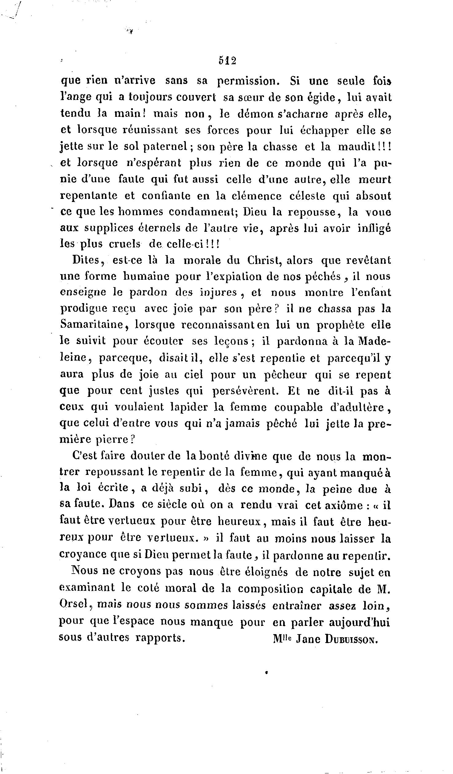 512 que rien n'arrive sans sa permission. Si une seule foi» l'ange qui a toujours couvert sa sœur de son égide, lui avait tendu la main! mais non, le démon s'acharne après elle, et lorsque réunissant ses forces pour lui échapper elle se jette sur le sol paternel; son père la chasse et la maudit!!! et lorsque n'espérant plus rien de ce monde qui l'a pu- nie d'une faute qui fut aussi celle d'une autre, elle meurt repentante et confiante en la clémence céleste qui absout ce que les hommes condamnent; Dieu la repousse, la voue aux supplices éternels de l'autre vie, après lui avoir infligé les plus cruels de celle-ci!!! Dites, est-ce là la morale du Christ, alors que revêtant une forme humaine pour l'expiation de nos péchés, il nous enseigne le pardon des injures , et nous montre l'enfant prodigue reçu avec joie par son père ? il ne chassa pas la Samaritaine, lorsque reconnaissant en lui un prophète elle le suivit pour écouter ses leçons ; il pardonna à la Made- leine, parceque, disait il, elle s'est repentie et parcequ'il y aura plus de joie au ciel pour un pêcheur qui se repent que pour cent jusles qui persévèrent. Et ne dit-il pas à ceux qui voulaient lapider la femme coupable d'adultère, que celui d'entre vous qui n'a jamais péché lui jette la pre- mière pierre? C'est faire douter de la bonté divine que de nous la mon- trer repoussant le repentir de la femme, qui ayant manquéà la loi écrite, a déjà subi, dès ce monde, la peine due à sa faute. Dans ce siècle où on a rendu vrai cet axiome : « il faut être vertueux pour être heureux, mais il faut être heu- reux pour être vertueux. » il faut au moins nous laisser la croyance que si Dieu permet la faute, il pardonne au repentir. Nous ne croyons pas nous être éloignés de notre sujet en examinant le coté moral de la composition capitale de M. Qrsel, mais nous nous sommes laissés entraîner assez loin, pour que l'espace nous manque pour en parler aujourd'hui sous d'autres rapports. Mlle Jane DUBMSSON.