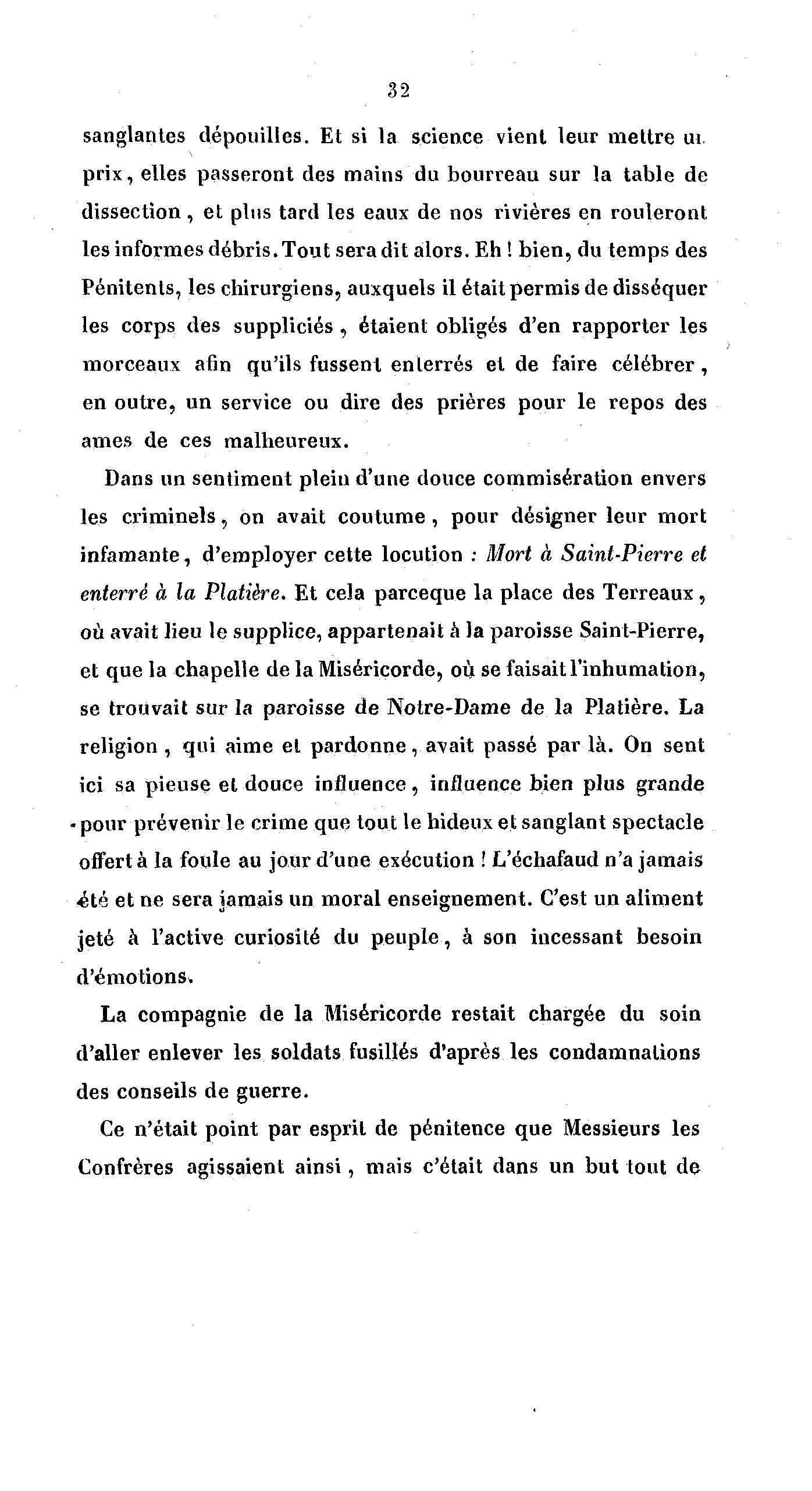 32 sanglantes dépouilles. Et si la science vient leur mettre ui prix, elles passeront des mains du bourreau sur la table de dissection , et plus tard les eaux de nos rivières en rouleront les informes débris. Tout sera dit alors. Eh ! bien, du temps des Pénitents, les chirurgiens, auxquels il était permis de disséquer les corps des suppliciés , étaient obligés d'en rapporter les morceaux afin qu'ils fussent enterrés et de faire célébrer, en outre, un service ou dire des prières pour le repos des âmes de ces malheureux. Dans un sentiment plein d'une douce commisération envers les criminels, on avait coutume , pour désigner leur mort infamante, d'employer cette locution ; Mort à Saint-Pierre et enterré à la Platière. Et cela parceque la place des Terreaux, où avait lieu le supplice, appartenait à la paroisse Saint-Pierre, et que la chapelle de la Miséricorde, où se faisait l'inhumation, se trouvait sur la paroisse de Notre-Dame de la Platière. La religion , qui aime et pardonne, avait passé par là . On sent ici sa pieuse et douce influence, influence bien plus grande - pour prévenir le crime que tout le hideux et sanglant spectacle offert à la foule au jour d'une exécution ! L'échafaud n'a jamais •été et ne sera iamais un moral enseignement. C'est un aliment jeté à l'active curiosité du peuple, à son incessant besoin d'émotions. La compagnie de la Miséricorde restait chargée du soin d'aller enlever les soldats fusillés d'après les condamnations des conseils de guerre. Ce n'était point par esprit de pénitence que Messieurs les Confrères agissaient ainsi, mais c'était dans un but tout de