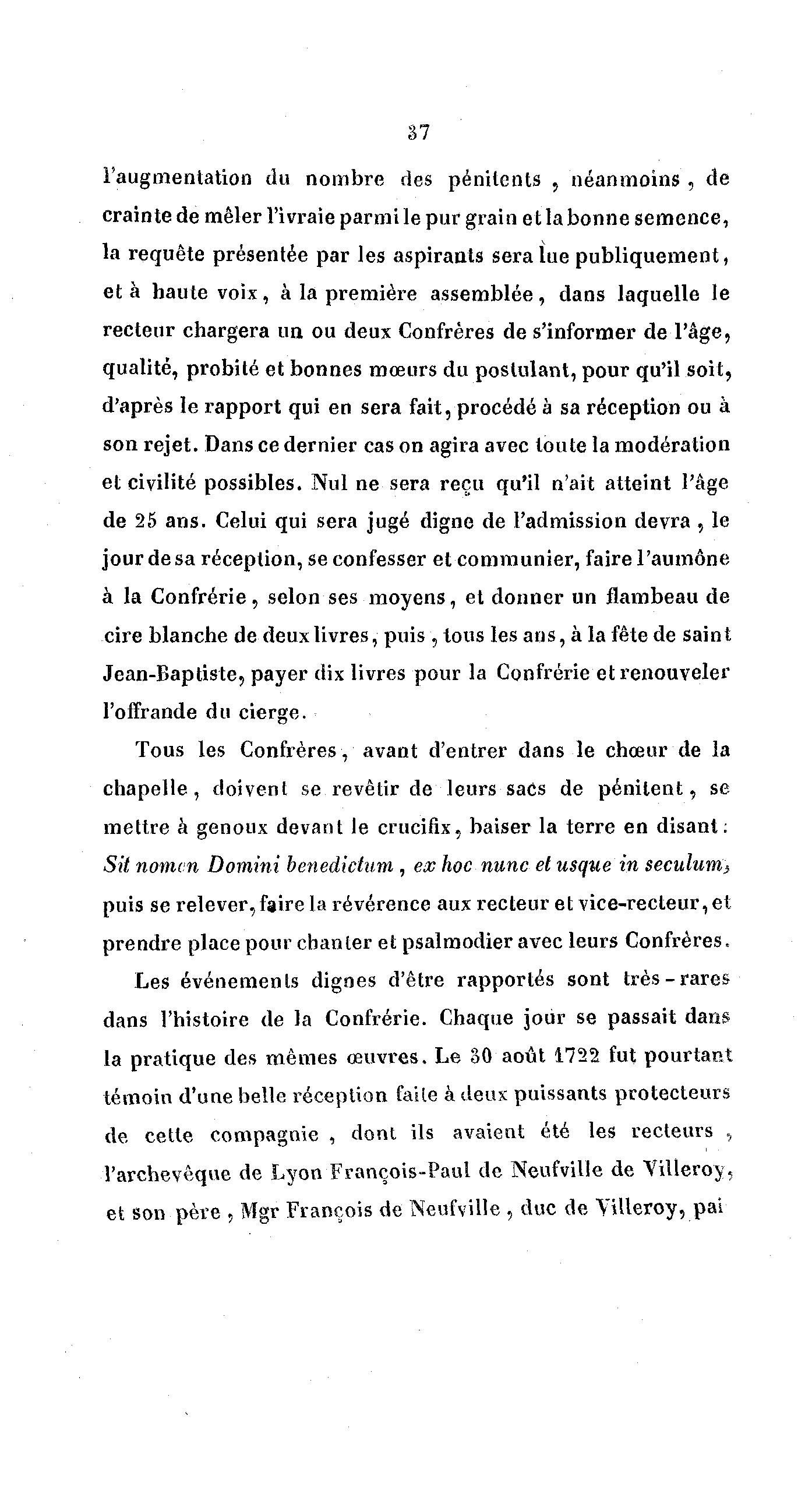 87 l'augmentation du nombre des pénitents , néanmoins , de crainte de mêler l'ivraie parmi le pur grain e t la bonne semence, la requête présentée par les aspirants sera lue publiquement, et à haute voix, à la première assemblée, dans laquelle le recteur chargera un ou deux Confrères de s'informer de l'âge, qualité, probité et bonnes mœurs du postulant, pour qu'il soit, d'après le rapport qui en sera fait, procédé à sa réception ou à son rejet. Dans ce dernier cas on agira avec toute la modération et civilité possibles. Nul ne sera reçu qu'il n'ait atteint l'âge de 25 ans. Celui qui sera jugé digne de l'admission devra , le jour de sa réception, se confesser et communier, faire l'aumône à la Confrérie, selon ses moyens, et donner un flambeau de cire blanche de deux livres, puis , tous les ans, à la fête de saint Jean-Baptiste, payer dix livres pour la Confrérie et renouveler l'offrande du cierge. Tous les Confrères, avant d'entrer dans le chœur de la chapelle, doivent se revêtir de leurs sacs de pénitent, se mettre à genoux devant le crucifix, baiser la terre en disant: Sit nomcn Domini benedictum , ex hoc nunc et usque in seculum,) puis se relever, faire la révérence aux recteur et vice-recteur, et prendre place pour chanter et psalmodier avec leurs Confrères. Les événements dignes d'être rapportés sont très-rares dans l'histoire de la Confrérie. Chaque jour se passait dans la pratique des mêmes œuvres. Le 30 août 1722 fut pourtant témoin d'une belle réception faite à deux puissants protecteurs de. cette compagnie , dont ils avaient été les recteurs , l'archevêque de Lyon François-Paul de Neufville de Yilleroy. et son père , Mgr François de Neufville , duc de Yilleroy, pai