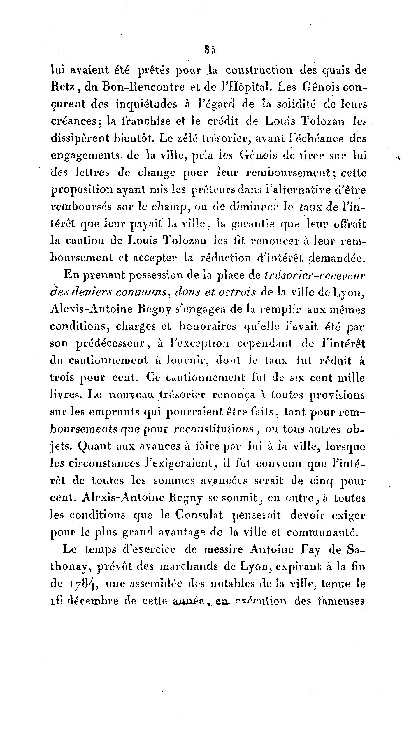 85 îui avaient été prêtés pour la construction des quais de Retz, du Bon-Rencontre et de l'Hôpital. Les Génois con- çurent des inquiétudes à l'égard de la solidité de leurs créances; la franchise et le crédit de Louis Tolozau les dissipèrent bientôt. Le zélé trésorier, avant l'échéance des engagements de la ville, pria ies Génois de tirer sur lui t des lettres de change pour leur remboursement; cette proposition ayant mis les prêteurs dans l'alternative d'être remboursés sur le champ, ou de diminuer le taux de l'in- térêt que leur payait la ville, la garantie que leur offrait la caution de Louis Tolozan les fit renoncer à leur rem- boursement et accepter la réduction d'intérêt demandée. En prenant possession de la place de trésorier-receveur des deniers communs, dons et octrois de la ville de Lyon, Alexis-Antoine Regny s'engagea de la remplir aux mêmes conditions, charges et honoraires qu'elle l'avait été par son prédécesseur, à l'exception cependant de l'intérêt du cautionnement à fournir, dont le taux fut réduit à trois pour cent. Ce cautionnement fut de six cent mille livres. Le nouveau trésorier renonça à toutes provisions sur les emprunts qui pourraient être faits, tant pour rem- boursements que pour reconstitutions, ou tous autres ob- jets. Quant aux avances à faire par lui à la ville, lorsque les circonstances l'exigeraient, il fut convenu que l'inté- rêt de toutes les sommes avancées serait de cinq pour cent. Alexis-Antoine Regny se soumit, en outre, à toutes les conditions que le Consulat penserait devoir exiger pour le plus grand avantage de la ville et communauté. Le temps d'exercice de messire Antoine Fay de Sa- thonay, prévôt des marchands de Lyon, expirant à la fin de 1784, «ne assemblée des notables de la ville, tenue le 16 décembre de cette aanip. ,.e», px-é-o.ution des fameuses