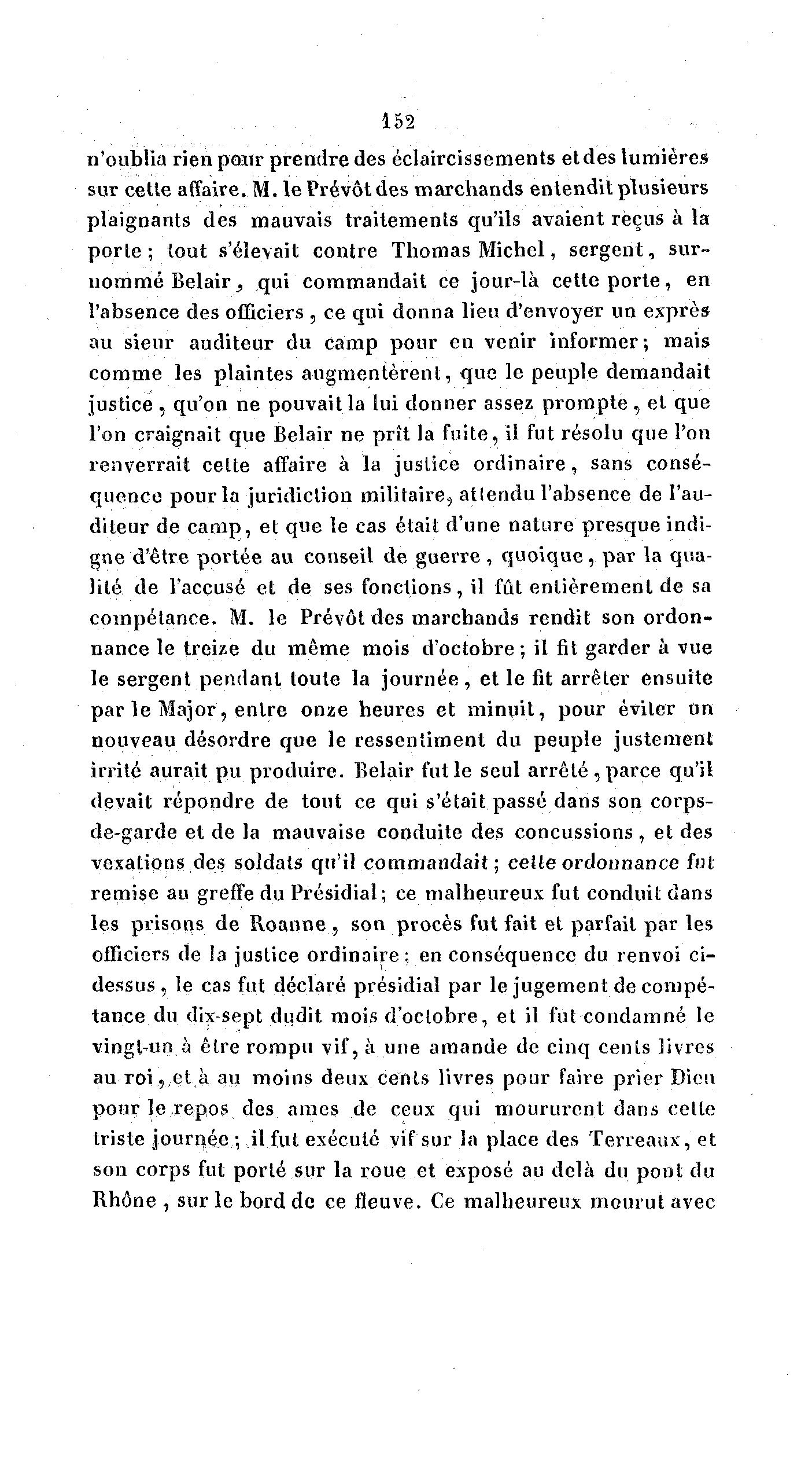 152 n'oublia rien pour prendre des éclaircissements etdes lumières sur cette affaire. M. le Prévôt des marchands entendit plusieurs plaignants des mauvais traitements qu'ils avaient reçus à la p o r t e ; tout s'élevait contre Thomas Michel, sergent, sur- nommé Belair^ qui commandait ce jour-là cette p o r t e , en l'absence des officiers , ce qui donna lieu d'envoyer un exprès au sieur auditeur du camp pour en venir informer; mais comme les plaintes augmentèrent, que le peuple demandait justice , qu'on ne pouvait la lui donner assez prompte , et que l'on craignait que Belair ne prît la fuite, il fut résolu que l'on renverrait cette affaire à la justice ordinaire, sans consé- quence pour la juridiction militaire, atlendu l'absence de l'au- diteur de c a m p , et que le cas était d'une nature presque indi- gne d'être portée au conseil de g u e r r e , q u o i q u e , par la qua- lité de l'accusé et de ses fonctions, il fût entièrement de sa compétance. M. le Prévôt des marchands rendit son ordon- nance le treize du m ê m e mois d'octobre ; il fit garder à vue le sergent pendant toute la j o u r n é e , et le fit arrêter ensuite par le Major, entre onze heures et minuit, pour éviter un nouveau désordre que le ressentiment du peuple justement irrité aurait pu produire. Belair fut le seul a r r ê t é , parce qu'il devait répondre de tout ce qui s'était passé dans son corps- de-garde et de la mauvaise conduite des concussions , et des vexations des soldats qu'il commandait; celle ordonnance fut remise au greffe du Présidial; ce malheureux fut conduit dans les prisons de Roanne , son procès fut fait et parfait par les officiers de îa justice ordinaire ; en conséquence du renvoi ci- dessus, le cas fut déclaré présidial par le jugement de compé- tance du dix-sept dudit mois d'octobre, et il fut condamné le vingt-un à être rompu vif, à une amande de cinq cents livres au roi.,..et à au moins deux cents livres pour faire prier Dieu pour le repos des âmes de ceux qui moururent dans celte triste journée ; il fut exécuté vif sur la place des Terreaux, et son corps fut porté sur la roue et exposé au delà du pool du Rhône , sur le bord de ce fleuve. Ce malheureux mourut avec