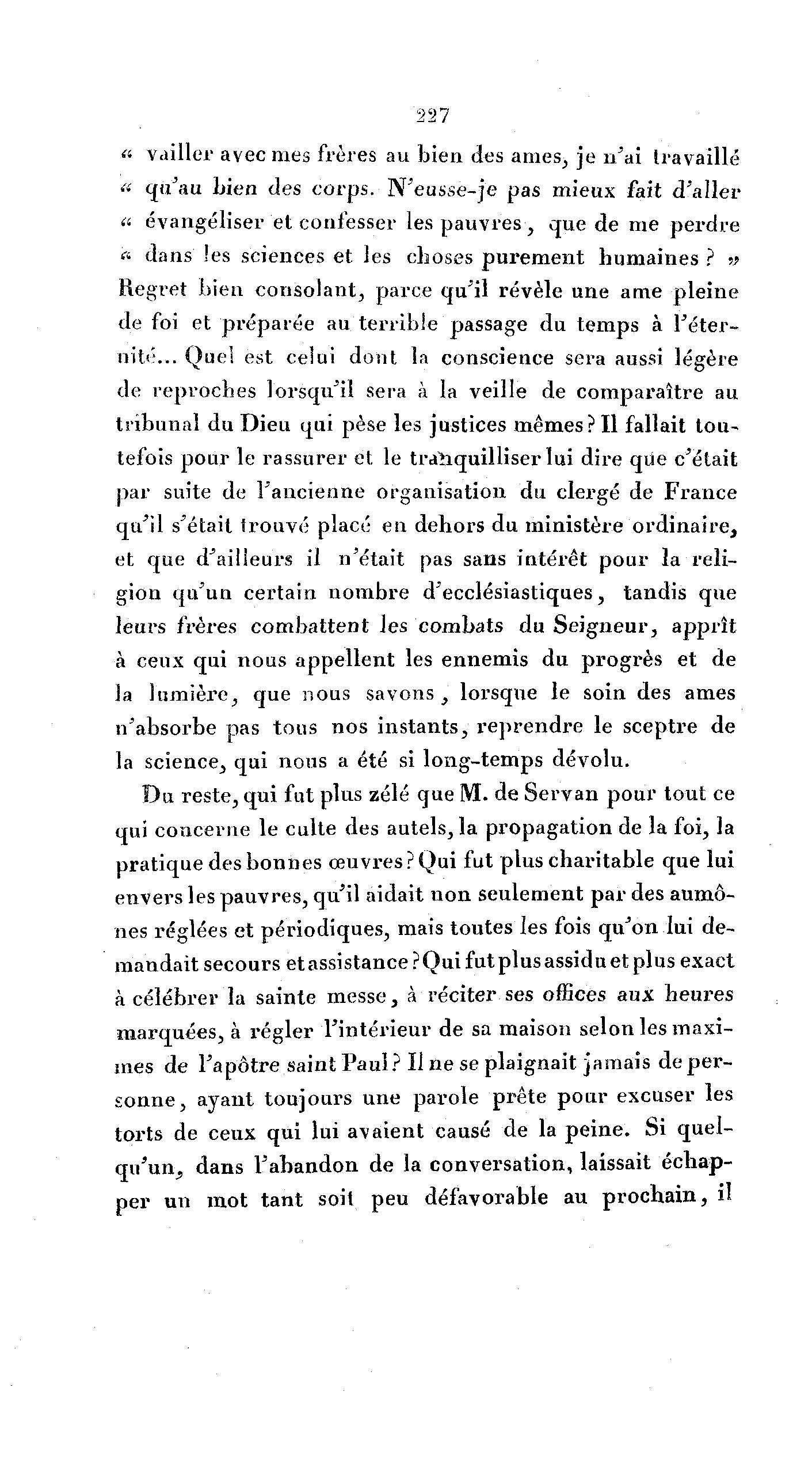 227 « vailler avec mes frères au bien des âmes, je n'ai travaillé « qu'au bien des corps. N'eusse-je pas mieux fait d'aller « évangéliser et confesser les pauvres, que de me perdre « dans les sciences et les choses purement humaines ? » Regret bien consolant, parce qu'il révèle une ame pleine de foi et préparée au terrible passage du temps à l'éter- nité... Quel est celui dont la conscience sera aussi légère de reproches lorsqu'il sera à la veille de comparaître au tribunal du Dieu qui pèse les justices mêmes? Il fallait tou- tefois pour le rassurer et le tranquilliser lui dire que c'était par suite de l'ancienne organisation du clergé de France qu'il s'était trouvé placé en dehors du ministère ordinaire, et que d'ailleurs il n'était pas sans intérêt pour la reli- gion qu'un certain nombre d'ecclésiastiques, tandis que leurs frères combattent les combats du Seigneur, apprît à ceux qui nous appellent les ennemis du progrès et de la lumière, que nous savons, lorsque le soin des âmes n'absorbe pas tous nos instants, reprendre le sceptre de la science, qui nous a été si long-temps dévolu. Du reste, qui fut plus zélé que M. de Servan pour tout ce qui concerne le culte des autels, la propagation de la foi, la pratique des bonnes œuvres?Qui fut plus charitable que lui envers les pauvres, qu'il aidait non seulement par des aumô- nes réglées et périodiques, mais toutes les fois qu'on lui de- mandait secours et assistance ? Qui fut plus assidu et plus exact à célébrer la sainte messe, à réciter ses offices aux heures marquées, à régler l'intérieur de sa maison selon les maxi- mes de l'apôtre saint Paul? Il ne se plaignait jamais de per- sonne, ayant toujours une parole prête pour excuser les torts de ceux qui lui avaient causé de la peine. Si quel- qu'un, dans l'abandon de la conversation, laissait échap- per un mot tant soit peu défavorable au prochain, il