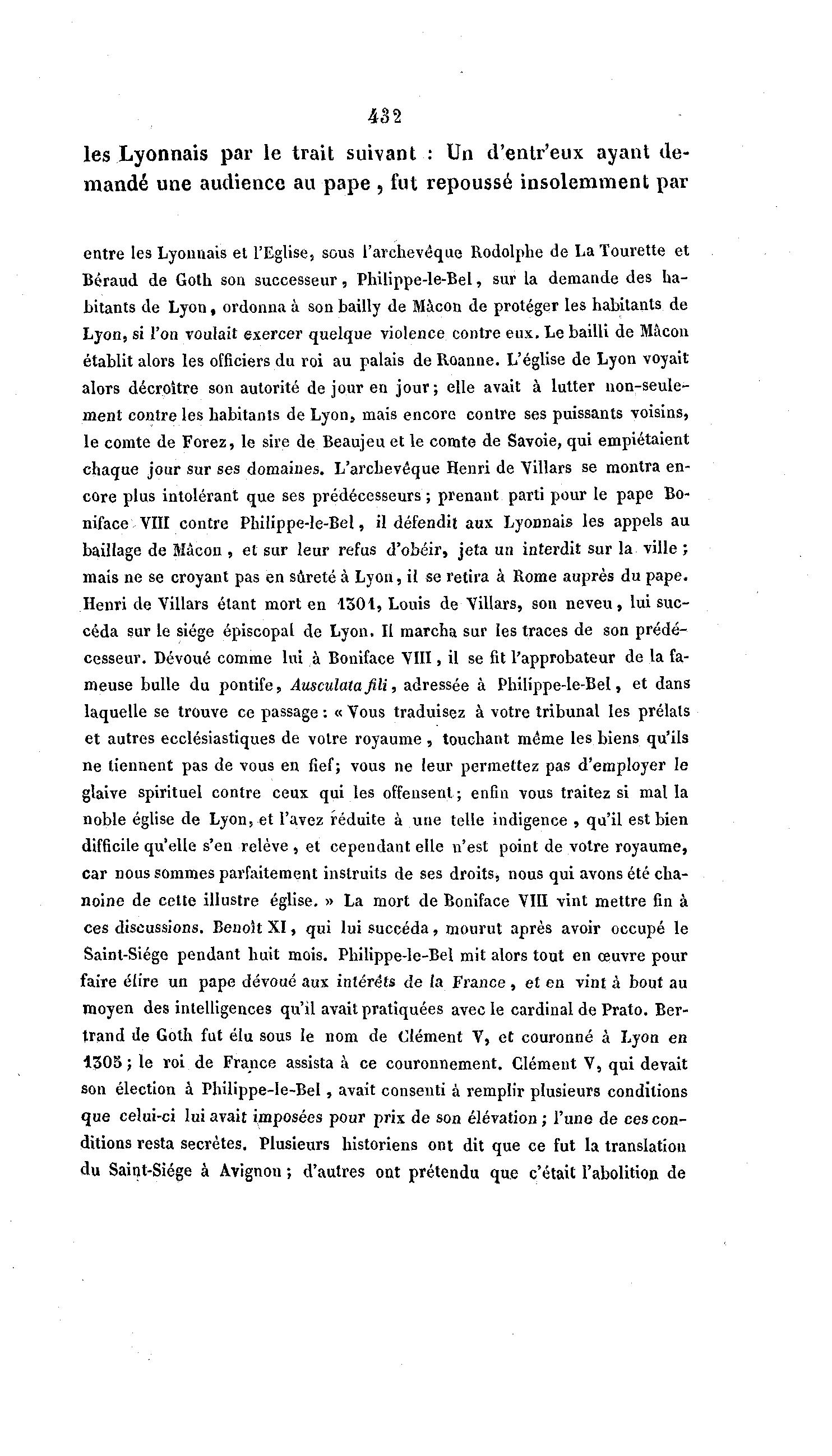 432 les Lyonnais par le trait suivant : Un d'entr'eux ayant de- mandé une audience au pape , fut repoussé insolemment par entre les Lyonnais et l'Eglise, sous l'archevêque Rodolphe de LaTourette et Béraud de Goth son successeur, Philippe-le-Bel, sur la demande des ha- bitants de Lyon, ordonna à son bailly de Mà con de protéger les habitants de Lyon, si l'on voulait exercer quelque violence contre eux. Le bailli de Mâcon établit alors les officiers du roi au palais de Roanne. L'église de Lyon voyait alors décroître son autorité de jour en jour; elle avait à lutter non-seule- ment contre les habitants de Lyon, mais encore contre ses puissants voisins, le comte de Forez, le sire de Beaujeu et le comte de Savoie, qui empiétaient chaque jour sur ses domaines. L'archevêque Henri de Villars se montra en- core plus intolérant que ses prédécesseurs ; prenant parti pour le pape Bo- niface VIII contre Philippe-le-Bel, il défendit aux Lyonnais les appels au baillage de Mâcon , et sur leur refus d'obéir, jeta un interdit sur la ville ; mais ne se croyant pas en sûreté à Lyon, il se retira à Rome auprès du pape. Henri de Villars étant mort en 1301, Louis de Villars, son neveu, lui suc- céda sur le siège épiscopal de Lyon. Il marcha sur les traces de son prédé- cesseur. Dévoué comme lui à Boniface VIII, il se fit l'approbateur de la fa- meuse bulle du pontife, AusculatafiU, adressée à Philippe-le-Bel, et dans laquelle se trouve ce passage : « Vous traduisez à votre tribunal les prélats et autres ecclésiastiques de votre royaume , touchant même les biens qu'ils ne tiennent pas de vous en fief; vous ne leur permettez pas d'employer le glaive spirituel contre ceux qui les offensent ; enfin vous traitez si mal la noble église de Lyon, et l'avez réduite à une telle indigence , qu'il est bien difficile qu'elle s'en relève , et cependant elle n'est point de votre royaume, car nous sommes parfaitement instruits de ses droits, nous qui avons été cha- noine de cette illustre église. » La mort de Boniface VIII vint mettre fin à ces discussions. Benoît XI, qui lui succéda, mourut après avoir occupé le Saint-Siège pendant huit mois. Philippe-le-Bel mit alors tout en œuvre pour faire élire un pape dévoué aux intérêts de la France , et en vint à bout au moyen des intelligences qu'il avait pratiquées avec le cardinal de Prato. Ber- trand de Goth fut élu sous le nom de Clément V, et couronné à Lyon en 1305 ; le roi de France assista à ce couronnement. Clément V, qui devait son élection à Philippe-le-Bel, avait consenti à remplir plusieurs conditions que celui-ci lui avait imposées pour prix de son élévation ; l'une de ces con- ditions resta secrètes. Plusieurs historiens ont dit que ce fut la translation du Saint-Siège à Avignon ; d'autres ont prétendu que c'était l'abolition de