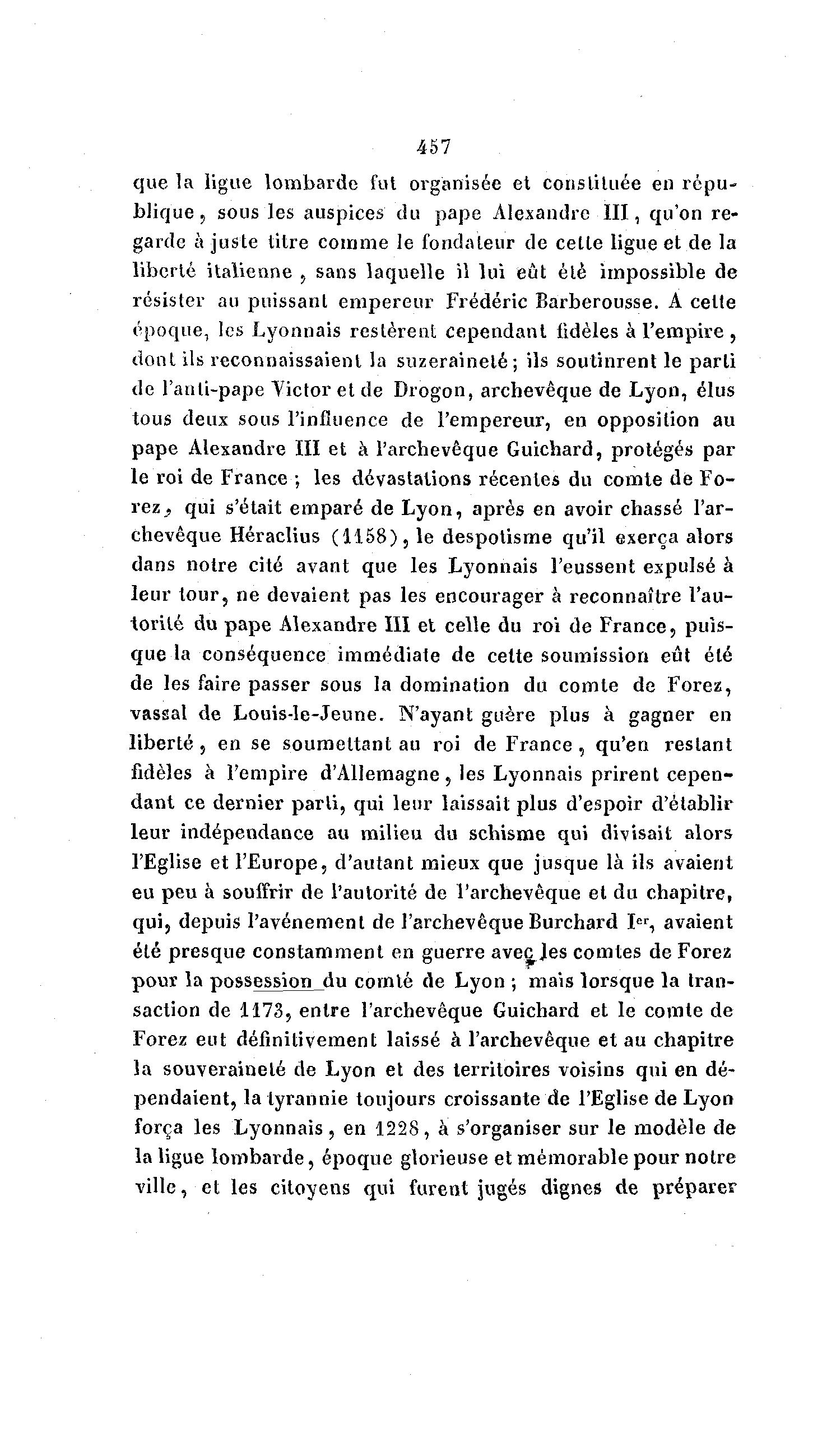457 que la ligue lombarde fut organisée et constituée en répu- blique, sous les auspices du pape Alexandre III, qu'on re- garde à juste titre comme le fondateur de cette ligue et de la liberté italienne , sans laquelle il lui eût été impossible de résister au puissant empereur Frédéric Barberousse. A celte époque, les Lyonnais restèrent cependant fidèles à l'empire , dont ils reconnaissaient la suzeraineté; ils soutinrent le parti de l'anli-pape Victor et de Drogon, archevêque de Lyon, élus tous deux sous l'influence de l'empereur, en opposition au pape Alexandre III et à l'archevêque Guichard, protégés par le roi de France ; les dévastations récentes du comte de Fo- rez., qui s'était emparé de Lyon, après en avoir chassé l'ar- chevêque Héraclius (1158), le despotisme qu'il exerça alors dans notre cité avant que les Lyonnais l'eussent expulsé à leur tour, ne devaient pas les encourager à reconnaître l'au- torité du pape Alexandre III et celle du roi de France, puis- que la conséquence immédiate de cette soumission eût été de les faire passer sous la domination du comte de Forez, vassal de Louis-le-Jeune. N'ayant guère plus à gagner en liberté, en se soumettant au roi de France , qu'en restant fidèles à l'empire d'Allemagne, les Lyonnais prirent cepen- dant ce dernier parti, qui leur laissait plus d'espoir d'établir leur indépendance au milieu du schisme qui divisait alors l'Eglise et l'Europe, d'autant mieux que jusque là ils avaient eu peu à souffrir de l'autorité de l'archevêque et du chapitre, qui, depuis l'avènement de l'archevêque Burchard I er , avaient été presque constamment en guerre avec Jes comtes de Forez pour la possession du comté de Lyon ; mais lorsque la tran- saction de 1173, entre l'archevêque Guichard et le comte de Forez eut définitivement laissé à l'archevêque et au chapitre la souveraineté de Lyon et des territoires voisins qui en dé- pendaient, la tyrannie toujours croissante de l'Eglise de Lyon força les Lyonnais, en 1228, à s'organiser sur le modèle de la ligue lombarde, époque glorieuse et mémorable pour notre ville, et les citoyens qui furent jugés dignes de préparer