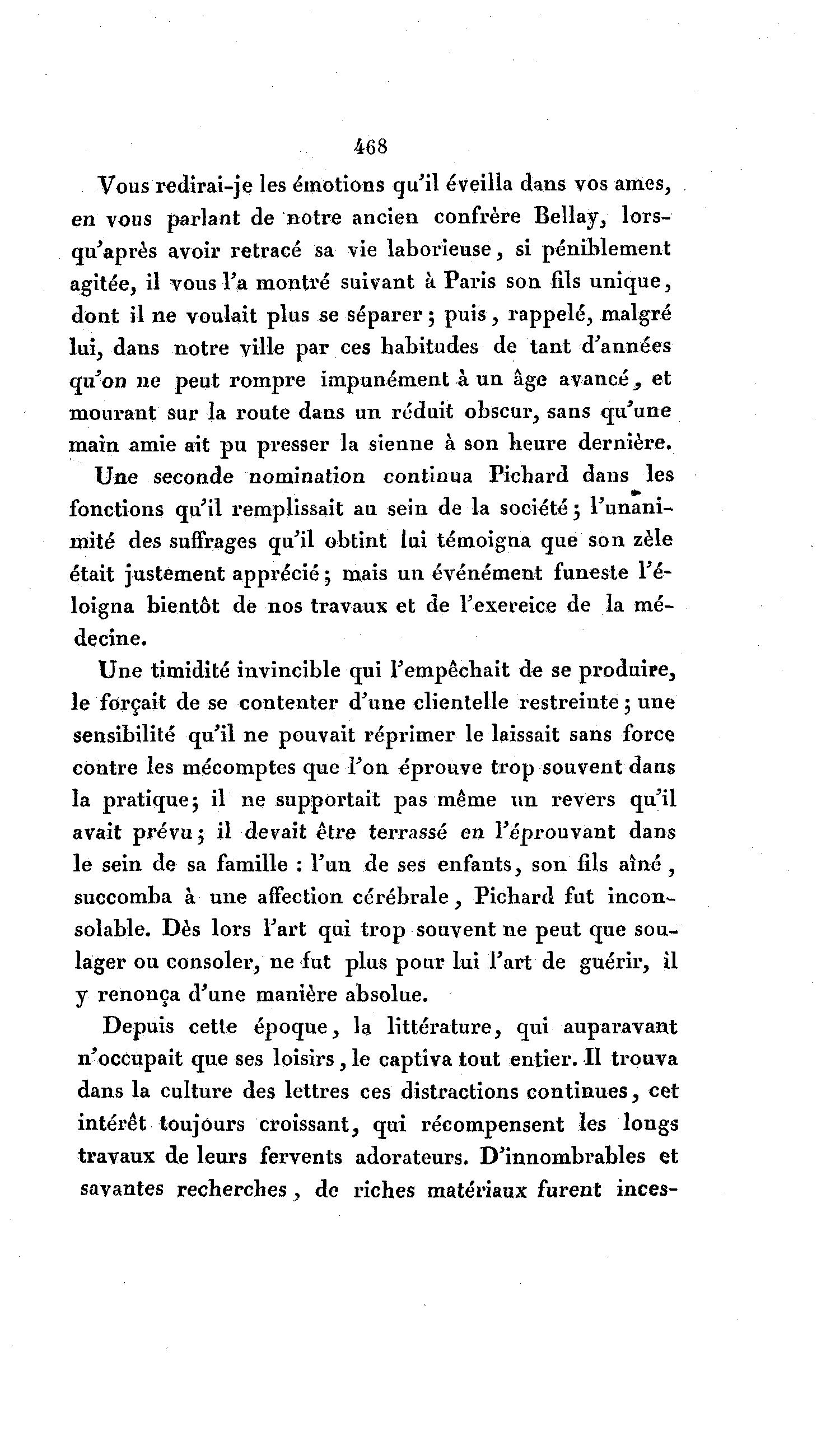 468 Vous redirai-je les émotions qu'il éveilla dans vos âmes, en vous parlant de notre ancien confrère Bellay, lors- qu'après avoir retracé sa vie laborieuse, si péniblement agitée, il vous l'a montré suivant à Paris son fils unique, dont il ne voulait plus se séparer ; puis, rappelé, malgré lui, dans notre ville par ces habitudes de tant d'années qu'on ne peut rompre impunément à un âge avancé, et mourant sur la route dans un réduit obscur, sans qu'une main amie ait pu presser la sienne à son heure dernière. Une seconde nomination continua Pichard dans les fonctions qu'il remplissait au sein de la société; l'unani- mité des suffrages qu'il obtint lui témoigna que son zèle était justement apprécié ; mais un événement funeste l'é- loigna bientôt de nos travaux et de l'exereice de la mé- decine. Une timidité invincible qui l'empêchait de se produire, le forçait de se contenter d'une clientelle restreinte ; une sensibilité qu'il ne pouvait réprimer le laissait sans force contre les mécomptes que l'on éprouve trop souvent dans la pratique; il ne supportait pas même un revers qu'il avait prévu; il devait être terrassé en l'éprouvant dans le sein de sa famille : l'un de ses enfants, son fils aîné , succomba à une affection cérébrale, Pichard fut incon- solable. Dès lors l'art qui trop souvent ne peut que sou- lager ou consoler, ne fut plus pour lui l'art de guérir, il y renonça d'une manière absolue. Depuis cette époque, la littérature, qui auparavant n'occupait que ses loisirs, le captiva tout entier. II trouva dans la culture des lettres ces distractions continues, cet intérêt toujours croissant, qui récompensent les longs travaux de leurs fervents adorateurs. D'innombrables et savantes recherches, de riches matériaux furent inces-
