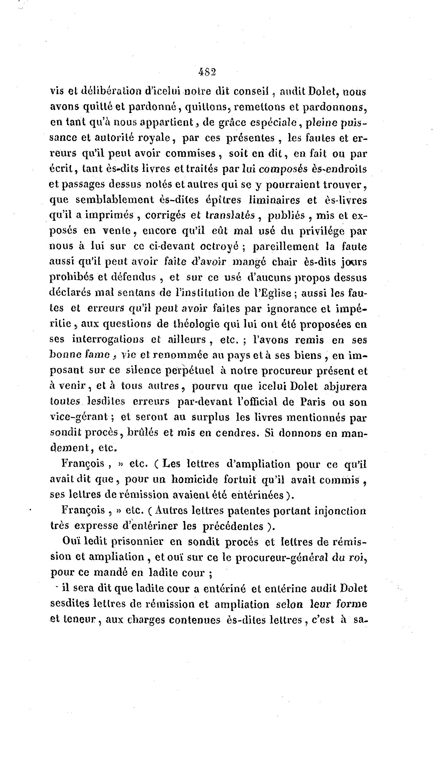 482 vis et délibération d'icelui notre dit conseil, audit Dolet, nous avons quitté et pardonné, quittons, remettons et pardonnons, en tant qu'à nous appartient 3 de grâce espéciale, pleine puis- sance et autorité royale, par ces présentes , les fautes et er- reurs qu'il peut avoir commises , soit en dit, en fait ou par écrit, tant ès-dits livres et traités par lui composés ès-endroils et passages dessus notés et autres qui se y pourraient trouver, que semblablement ès-dites épîtres liminaires et ès-livres qu'il a imprimés , corrigés et translatés , publiés , mis et ex- posés en vente, encore qu'il eût mal usé du privilège par nous à lui sur ce ci-devant octroyé ; pareillement la faute aussi qu'il peut avoir faite d'avoir mangé chair ès-dits jours prohibés et défendus , et sur ce usé d'aucuns propos dessus déclarés mal sentans de l'institution de l'Eglise; aussi les fau- tes et erreurs qu'il peut avoir faites par ignorance et impé- rilie , aux questions de théologie qui lui ont été proposées en ses interrogations et ailleurs , etc. ; l'avons remis en ses bonne famé ^ vie et renommée au pays et à ses biens , en im- posant sur ce silence perpétuel à notre procureur présent et avenir, et â tous autres, pourvu que icelui Dolet abjurera toutes lesdiles erreurs par-devant l'official de Paris ou son vice-gérant ; et seront au surplus les livres mentionnés par sondit procès, brûlés et mis en cendres. Si donnons en man- dement, etc. François , » etc. ( Les lettres d'ampliation pour ce qu'il avait dit que, pour un homicide fortuit qu'il avait commis, ses lettres de rémission avaient été entérinées). François, » etc. ( Autres lettres patentes portant injonction très expresse d'entériner les précédentes ). Ouï ledit prisonnier en sondit procès et lettres de rémis- sion et amplialion, et ouï sur ce le procureur-général du roi, pour ce mandé en ladite cour ; • il sera dit que ladite cour a entériné et entérine audit Dolet sesdites lettres de rémission et ampliation selon leur forme et teneur, aux charges contenues ès-dites lettres, c'est à sa-