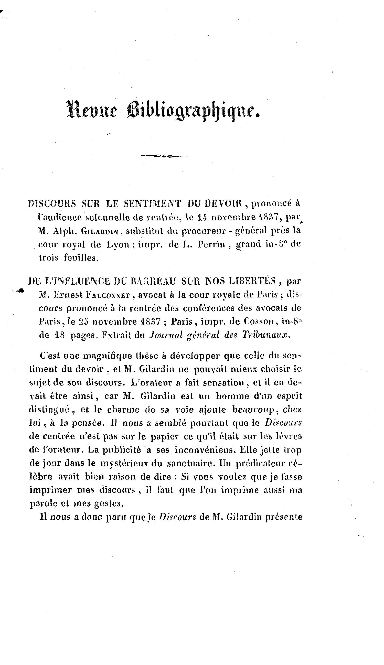 Hernie 0ibltogtapt)tque. DISCOURS SUR LE SENTIMENT DU DEVOIR , prononcé à l'audience solennelle de rentrée, le 14 novembre 1837, par^ M. Âlph. GILARDIN , substitut du procureur - général près la cour royal de Lyon ; impr. de L. Perrin , grand in-8° de trois feuilles. DE L'INFLUENCE DU BARREAU SUR NOS LIBERTÉS , par M. Ernest FALCOMET , avocat à la cour royale de Paris ; dis- cours prononcé à la rentrée des conférences des avocats de Paris, le 25 novembre 1837 ; Paris, impr. de Cosson, in-8° de 18 pages. Extrait du Journal général des Tribunaux. C'est une magnifique thèse à développer que celle du sen- timent du devoir , et M. Gilardin ne pouvait mieux choisir le sujet de son discours. L'orateur a fait sensation, et il en de- vait être ainsi, car M. Gilardin est un homme d'un esprit distingué, et le charme de sa voie ajoute beaucoup, chez lui , à la pensée. Il nous a semblé pourtant que le Discours de rentrée n'est pas sur le papier ce qu'il était sur les lèvres de l'orateur. La publicité a ses inconvéniens. Elle jette trop de jour dans le mystérieux du sanctuaire. Un prédicateur cé- lèbre avait bien raison de dire : Si vous voulez que je fasse imprimer mes discours , il faut que l'on imprime aussi ma parole et mes gesles. Il nous a donc paru que Je Discours de M. Gilardin présente
