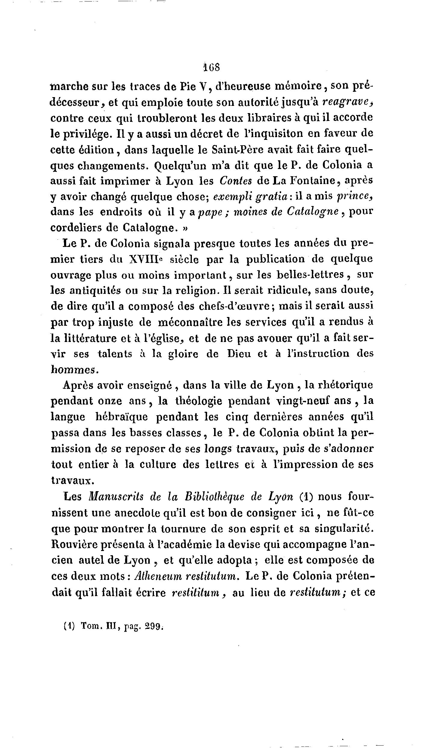 108 marche sur les traces de Pie V, d'heureuse mémoire, son pré- décesseur, et qui emploie toute son autorité jusqu'à reagrave, contre ceux qui troubleront les deux libraires à qui il accorde le privilège. Il y a aussi un décret de l'inquisiton en faveur de cette édition, dans laquelle le Saint-Père avait fait faire quel- ques changements. Quelqu'un m'a dit que le P. de Colonia a aussi fait imprimer à Lyon les Contes de La Fontaine, après y avoir changé quelque chose; exempli gratta: il a mis prince, dans les endroits où il y a pape ; moines de Catalogne , pour cordeliers de Catalogne. » Le P. de Colonia signala presque toutes les années du pre- mier tiers du XVIII« siècle par la publication de quelque ouvrage plus ou moins important, sur les belles-lettres , sur les antiquités ou sur la religion. Il serait ridicule, sans doute, de dire qu'il a composé des chefs-d'œuvre ; mais il serait aussi par trop injuste de méconnaître les services qu'il a rendus à la littérature et à l'église, et de ne pas avouer qu'il a fait ser- vir ses talents à la gloire de Dieu et à l'instruction des hommes. Après avoir enseigné , dans la ville de Lyon , la rhétorique pendant onze ans, la théologie pendant vingt-neuf ans , la langue hébraïque pendant les cinq dernières années qu'il passa dans les basses classes, le P. de Colonia obtint la per- mission de se reposer de ses longs travaux, puis de s'adonner tout entier à la culture des lettres et à l'impression de ses travaux. Les Manuscrits de la Bibliothèque de Lyon (1) nous four- nissent une anecdote qu'il est bon de consigner ici, ne fût-ce que pour montrer la tournure de son esprit et sa singularité. Rouvière présenta à l'académie la devise qui accompagne l'an- cien autel de Lyon , et qu'elle adopta ; elle est composée de ces deux mots : Atheneum restitutum. Le P. de Colonia préten- dait qu'il fallait écrire restititum, au lieu de restitutum; et ce (1) Tom. III, pag. 299.