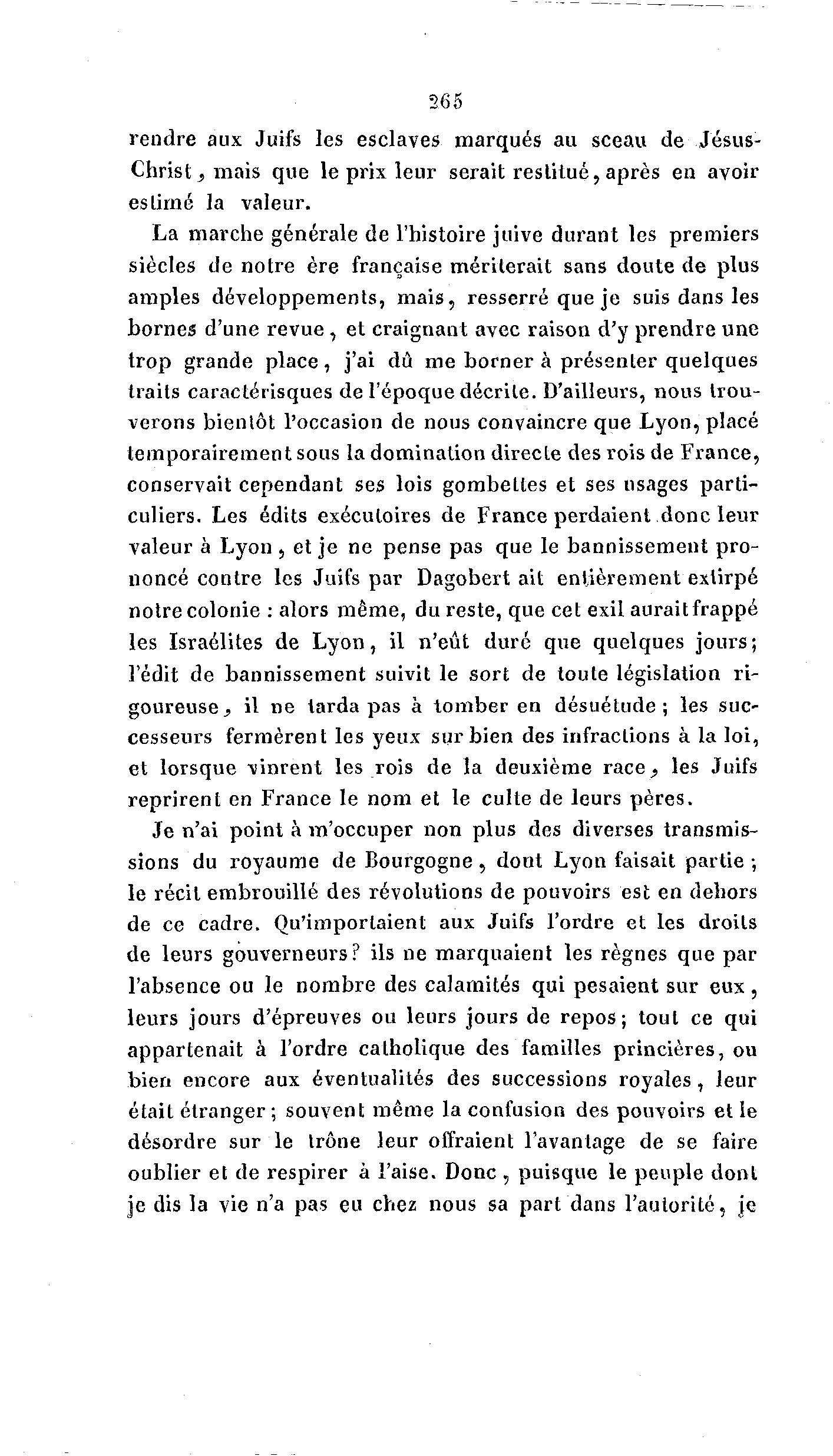 265 rendre aux Juifs les esclaves marqués au sceau de Jésus- Christ^ mais que le prix leur serait restitué, après en avoir es limé la valeur. La marche générale de l'histoire juive durant les premiers siècles de notre ère française mériterait sans doute de plus amples développements, m a i s , resserré que je suis dans les bornes d'une r e v u e , et craignant avec raison d'y prendre une trop grande place, j'ai dû me borner à présenter quelques traits caractérisques de l'époque décrite. D'ailleurs, nous trou- verons bientôt l'occasion de nous convaincre que Lyon, placé temporairement sous la domination direcle des rois de France, conservait cependant ses lois gombetles et ses usages parti- culiers. Les édits exécutoires de France perdaient donc leur valeur à Lyon , et je ne pense pas que le bannissement pro- noncé contre les Juifs par Dagobert ait entièrement extirpé notre colonie : alors même, du reste, que cet exil aurait frappé les Israélites de L y o n , il n'eût duré que quelques jours ; l'édit de bannissement suivit le sort de toute législation ri- goureuse^ il ne tarda pas à tomber en désuétude; les suc- cesseurs fermèrent les yeux sur bien des infractions à la loi, et lorsque vinrent les rois de la deuxième race^ les Juifs reprirent en France le nom et le culte de leurs pères. Je n'ai point à m'occuper non plus des diverses transmis- sions du royaume de Bourgogne , dont Lyon faisait partie ; le récit embrouillé des révolutions de pouvoirs est en dehors de ce cadre. Qu'importaient aux Juifs l'ordre et les droits de leurs gouverneurs? ils ne marquaient les règnes que par l'absence ou le nombre des calamités qui pesaient sur eux , leurs jours d'épreuves ou leurs jours de repos; tout ce qui appartenait à l'ordre catholique des familles princières, ou bien encore aux éventualités des successions royales, leur était étranger ; souvent même la confusion des pouvoirs et le désordre sur le trône leur offraient l'avantage de se faire oublier et de respirer à l'aise. Donc , puisque le peuple dont je dis la vie n'a pas eu chez nous sa part dans l'autorité, je