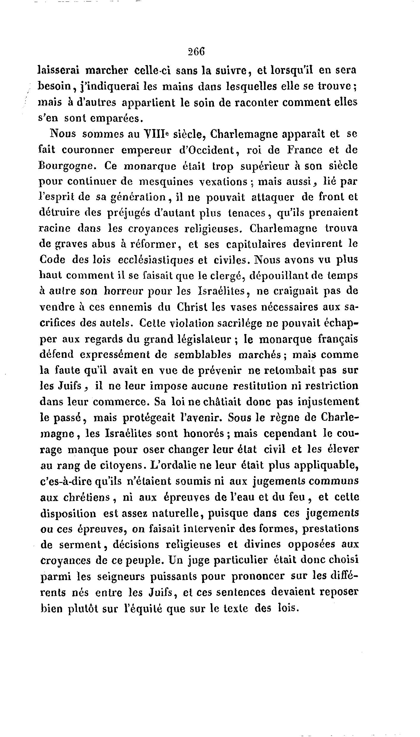26G laisserai marcher celle-ci sans la suivre, et lorsqu'il en sera besoin, j'indiquerai les mains dans lesquelles elle se trouve; mais à d'autres appartient le soin de raconter comment elles s'en sont emparées. Nous sommes au "VIIIe siècle, Charlemagne apparaît et se fait couronner empereur d'Occident, roi de France et de Bourgogne. Ce monarque était trop supérieur à son siècle pour continuer de mesquines vexations ; mais aussi, lié par l'esprit de sa génération, il ne pouvait attaquer de front et détruire des préjugés d'autant plus tenaces, qu'ils prenaient racine dans les croyances religieuses. Charlemagne trouva de graves abus à réformer, et ses capitulaires devinrent le Code des lois ecclésiastiques et civiles. Nous avons vu plus haut comment il se faisait que le clergé, dépouillant de temps à aulre son horreur pour les Israélites, ne craignait pas de vendre à ces ennemis du Christ les vases nécessaires aux sa- crifices des autels. Cette violation sacrilège ne pouvait échap- per aux regards du grand législateur ; le monarque français défend expressément de semblables marchés ; mais comme la faute qu'il avait en vue de prévenir ne retombait pas sur les Juifs, il ne leur impose aucune restitution ni restriction dans leur commerce. Sa loi ne châtiait donc pas injustement le passé, mais protégeait l'avenir. Sous le règne de Charle- magne, les Israélites sont honorés; mais cependant le cou- rage manque pour oser changer leur état civil et les élever au rang de citoyens. L'ordalie ne leur était plus appliquable, c'es-à -dire qu'ils n'étaient soumis ni aux jugements communs aux chrétiens , ni aux épreuves de l'eau et du feu , et cette disposition est assez naturelle, puisque dans ces jugements ou ces épreuves, on faisait intervenir des formes, prestations de serment, décisions religieuses et divines opposées aux Croyances de ce peuple. Un juge particulier était donc choisi parmi les seigneurs puissants pour prononcer sur les diffé- rents nés entre les Juifs, et ces sentences devaient reposer bien plutôt sur l'équité que sur le texte des lois.
