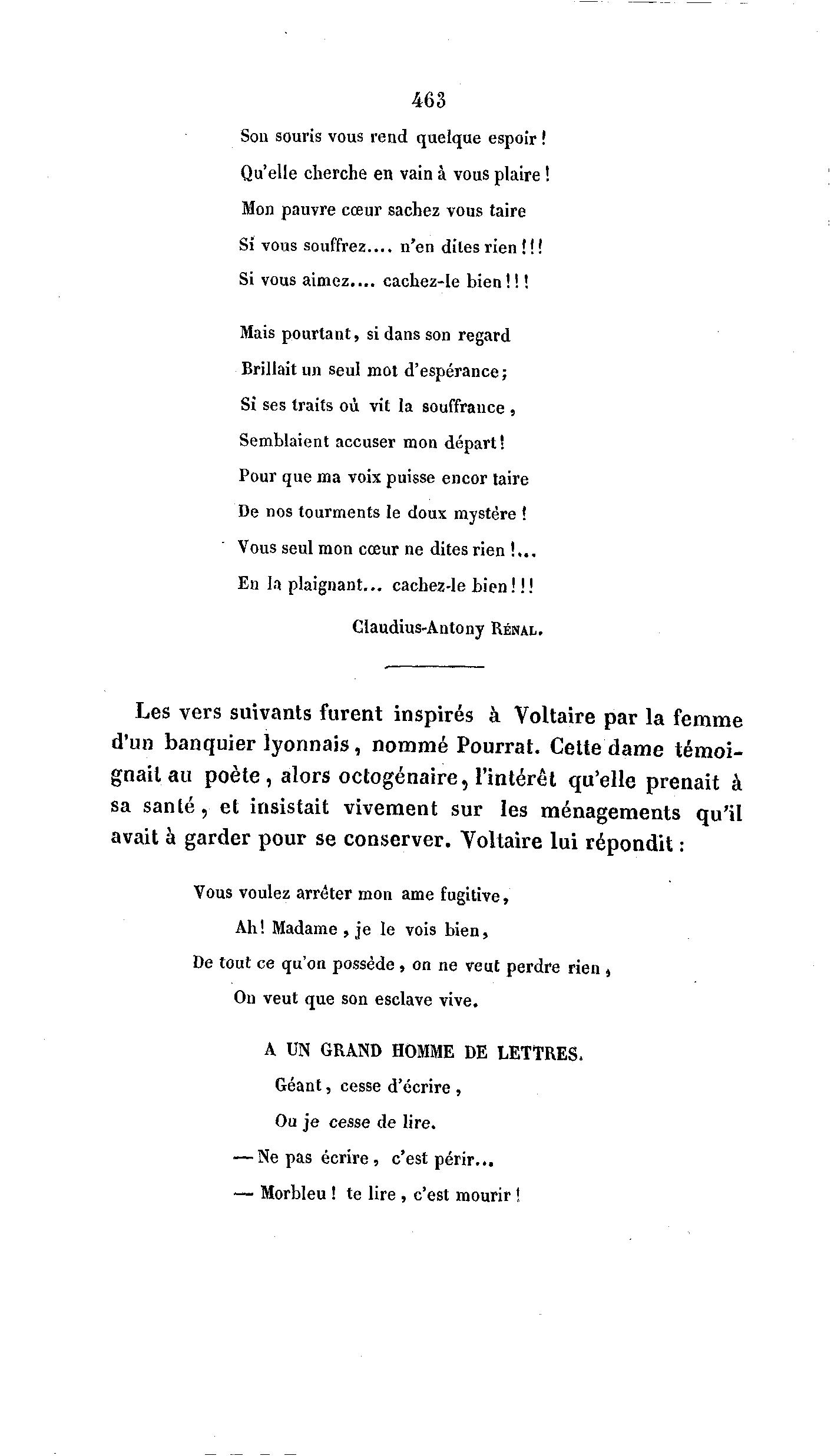 Les vers suivants furent inspirés à Voltaire par la femme