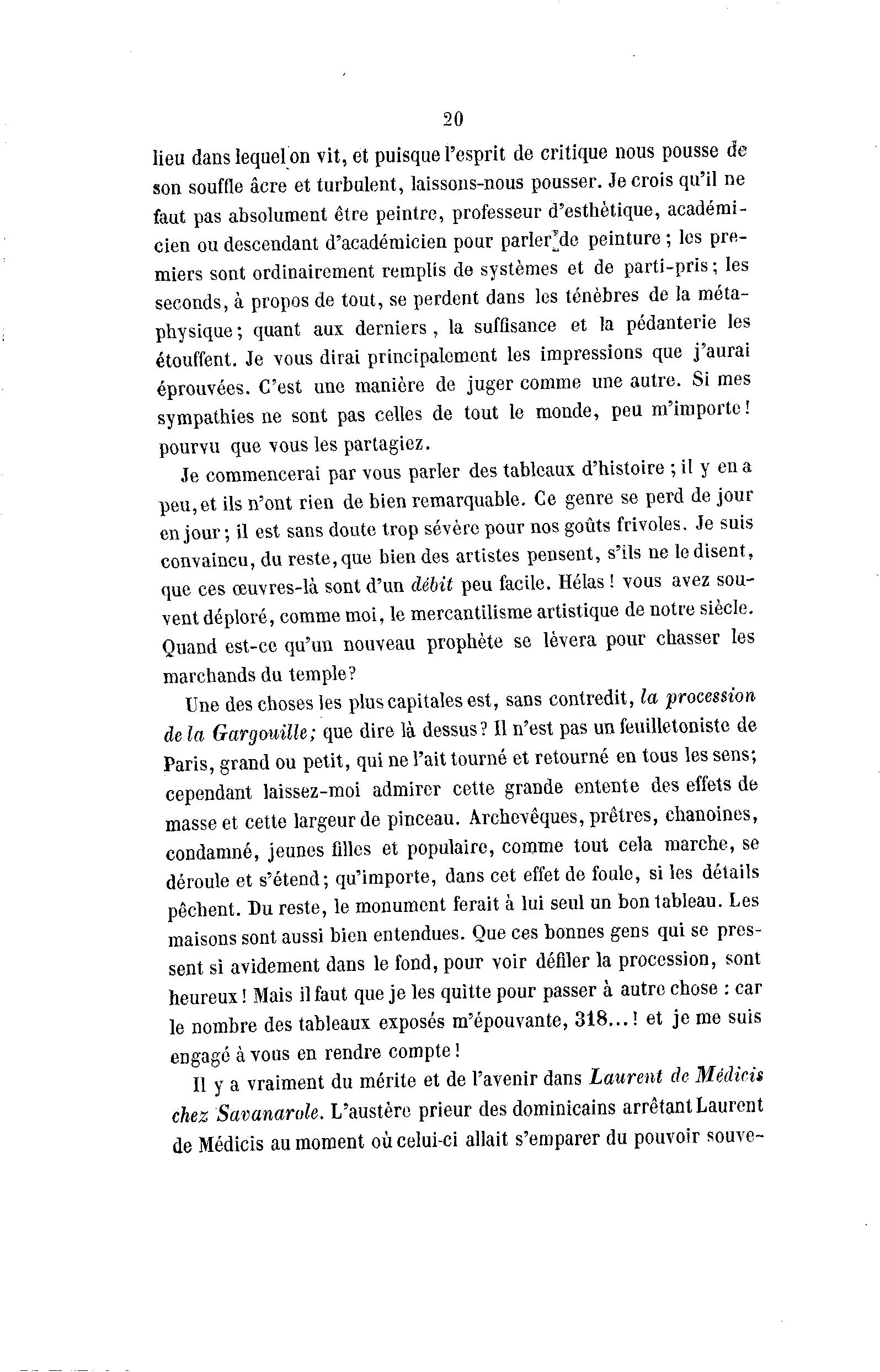 20 lieu dans lequel on vit, et puisque l'esprit de critique nous pousse de son souffle acre et turbulent, laissons-nous pousser. Je crois qu'il ne faut pas absolument être peintre, professeur d'esthétique, académi- cien ou descendant d'académicien pour parler'de peinture ; les pre- miers sont ordinairement remplis de systèmes et de parti-pris ; les seconds, à propos de tout, se perdent dans les ténèbres de la méta- physique ; quant aux derniers, la suffisance et la pédanterie les étouffent. Je vous dirai principalement les impressions que j'aurai éprouvées. C'est une manière de juger comme une autre. Si mes sympathies ne sont pas celles de tout le monde, peu m'importe! pourvu que vous les partagiez. Je commencerai par vous parler des tableaux d'histoire ; il y en a peu, et ils n'ont rien de bien remarquable. Ce genre se perd de jour en jour; il est sans doute trop sévère pour nos goûts frivoles. Je suis convaincu, du reste, que bien des artistes pensent, s'ils ne le disent, que ces œuvres-là sont d'un débit peu facile. Hélas ! vous avez sou- vent déploré, comme moi, le mercantilisme artistique de notre siècle. Quand est-ce qu'un nouveau prophète se lèvera pour chasser les marchands du temple? Une des choses les plus capitales est, sans contredit, la procession de la Gargouille; que dire là dessus? Il n'est pas un feuilletoniste de Paris, grand ou petit, qui ne l'ait tourné et retourné en tous les sens; cependant laissez-moi admirer cette grande entente des effets de masse et cette largeur de pinceau. Archevêques, prêtres, chanoines, condamné, jeunes filles et populaire, comme tout cela marche, se déroule et s'étend; qu'importe, dans cet effet de foule, si les détails pèchent. Du reste, le monument ferait à lui seul un bon tableau. Les maisons sont aussi bien entendues. Que ces bonnes gens qui se pres- sent si avidement dans le fond, pour voir défiler la procession, sont heureux ! Mais il faut que je les quitte pour passer à autre chose : car le nombre des tableaux exposés m'épouvante, 318...! et je me suis engagé à vous en rendre compte ! Il y a vraiment du mérite et de l'avenir dans Laurent de Médicis chez Savanarole. L'austère prieur des dominicains arrêtant Laurent de Médicis au moment où celui-ci allait s'emparer du pouvoir souve-