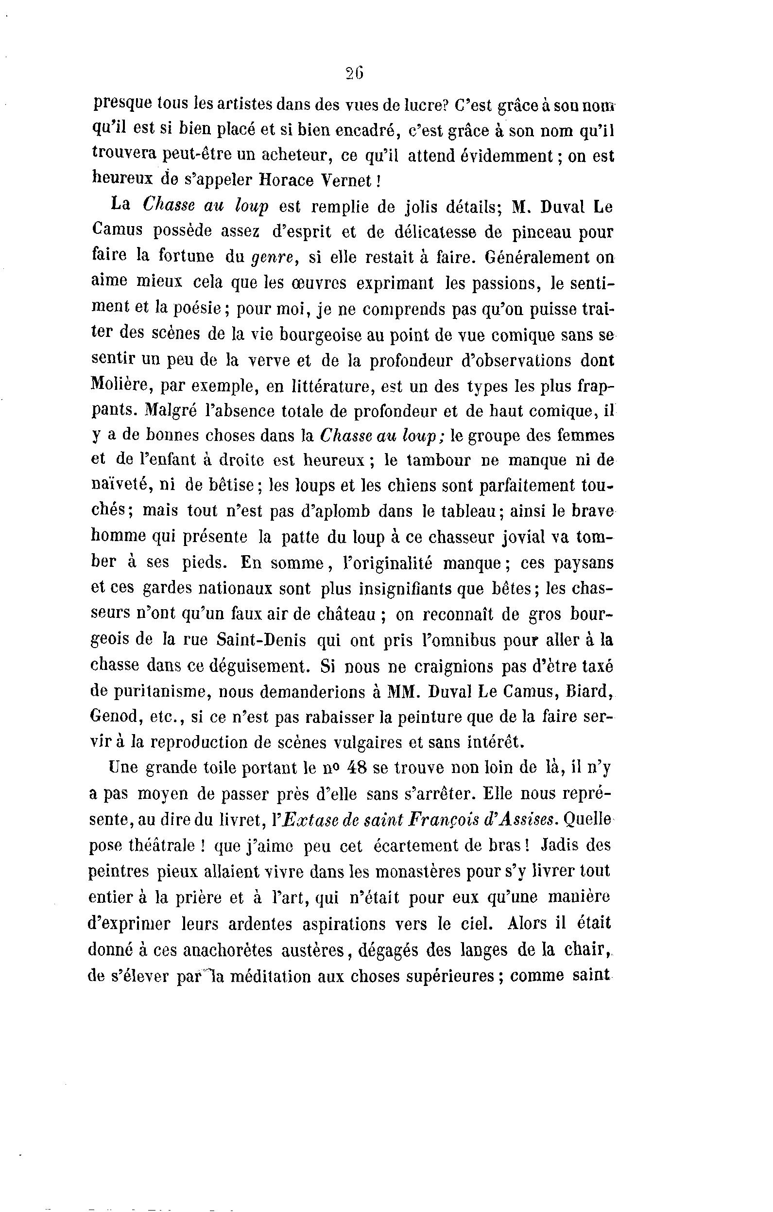 2G presque tous les artistes dans des vues de lucre? C'est grâce à son nom qu'il est si bien placé et si bien encadré, c'est grâce à son nom qu'il trouvera peut-être un acheteur, ce qu'il attend évidemment ; on est heureux de s'appeler Horace Vernet ! La Chasse au loup est remplie de jolis détails; M. Duval Le Camus possède assez d'esprit et de délicatesse de pinceau pour faire la fortune du genre, si elle restait à faire. Généralement on aime mieux cela que les œuvres exprimant les passions, le senti- ment et la poésie ; pour moi, je ne comprends pas qu'on puisse trai- ter des scènes de la vie bourgeoise au point de vue comique sans se sentir un peu de la verve et de la profondeur d'observations dont Molière, par exemple, en littérature, est un des types les plus frap- pants. Malgré l'absence totale de profondeur et de haut comique, il y a de bonnes choses dans la Chasse au loup; le groupe des femmes et de l'enfant à droite est heureux ; le tambour ne manque ni de naïveté, ni de bêtise ; les loups et les chiens sont parfaitement tou- chés; mais tout n'est pas d'aplomb dans le tableau; ainsi le brave homme qui présente la patte du loup à ce chasseur jovial va tom- ber à ses pieds. En somme, l'originalité manque ; ces paysans et ces gardes nationaux sont plus insignifiants que bêtes ; les chas- seurs n'ont qu'un faux air de château ; on reconnaît de gros bour- geois de la rue Saint-Denis qui ont pris l'omnibus pour aller à la chasse dans ce déguisement. Si nous ne craignions pas d'être taxé de puritanisme, nous demanderions à MM. Duval Le Camus, Biard, Genod, etc., si ce n'est pas rabaisser la peinture que de la faire ser- vira la reproduction de scènes vulgaires et sans intérêt. Une grande toile portant le n° 48 se trouve non loin de là , il n'y a pas moyen de passer près d'elle sans s'arrêter. Elle nous repré- sente, au dire du livret, YExtase de saint François d'Assises. Quelle pose théâtrale ! que j'aime peu cet écartement de bras ! Jadis des peintres pieux allaient vivre dans les monastères pour s'y livrer tout entier à la prière et à l'art, qui n'était pour eux qu'une manière d'exprimer leurs ardentes aspirations vers le ciel. Alors il était donné à ces anachorètes austères, dégagés des langes de la chair, de s'élever parla méditation aux choses supérieures ; comme saint