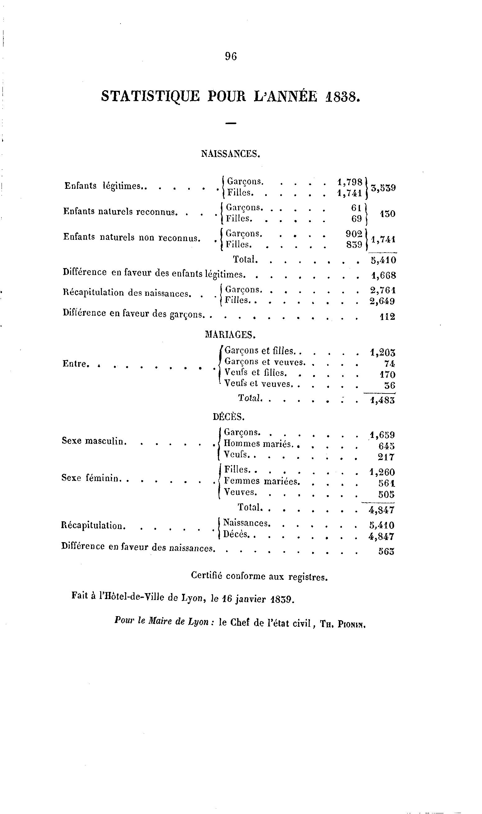 Pour le Maire de Lyon : le Chef de l'état civil, TH. PIONW.