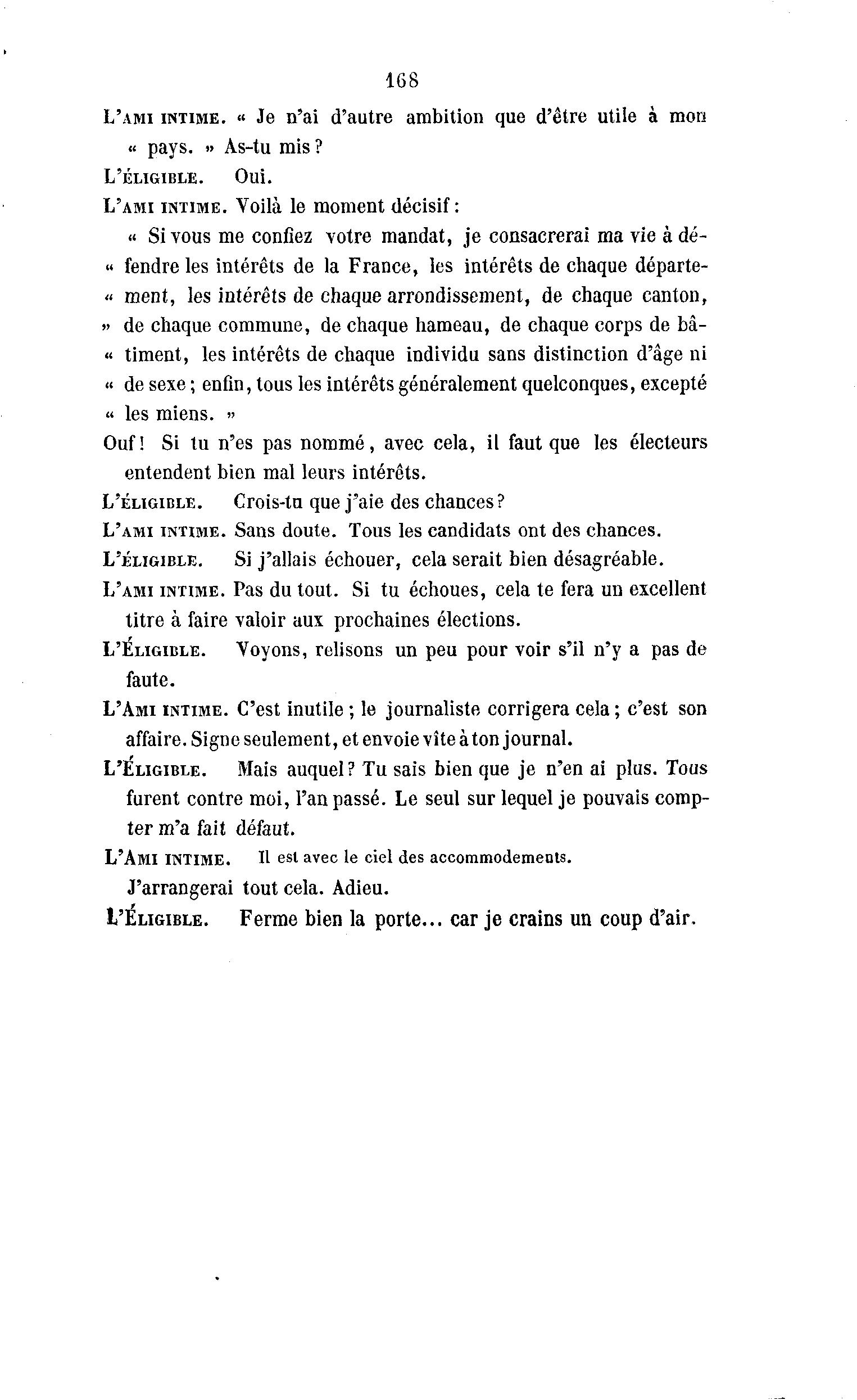 168 L'AMI INTIME. « Je n'ai d'autre ambition que d'être utile à mon « pays. » As-tu mis? L'ELIGIBLE. Oui. L'AMI INTIME. Voilà le moment décisif: « Si vous me confiez votre mandat, je consacrerai ma vie à dé- « fendre les intérêts de la France, les intérêts de chaque départe- « ment, les intérêts de chaque arrondissement, de chaque canton, » de chaque commune, de chaque hameau, de chaque corps de bâ- « timent, les intérêts de chaque individu sans distinction d'âge ni « de sexe ; enfin, tous les intérêts généralement quelconques, excepté « les miens. » Ouf! Si tu n'es pas nommé, avec cela, il faut que les électeurs entendent bien mal leurs intérêts. L'ELIGIBLE. Crois-tu que j'aie des chances? L'AMI INTIME. Sans doute. Tous les candidats ont des chances. L'ELIGIBLE. Si j'allais échouer, cela serait bien désagréable. L'AMI INTIME. Pas du tout. Si tu échoues, cela te fera un excellent titre à faire valoir aux prochaines élections. L'ELIGIBLE. Voyons, relisons un peu pour voir s'il n'y a pas de faute. L'AMI INTIME. C'est inutile ; le journaliste corrigera cela ; c'est son affaire. Signe seulement, et envoie vite à ton journal. L'ELIGIBLE. Mais auquel? Tu sais bien que je n'en ai plus. Tous furent contre moi, l'an passé. Le seul sur lequel je pouvais comp- ter m'a fait défaut. L ' A M I INTIME. Il est avec le ciel des accommodements. J'arrangerai tout cela. Adieu. I'ELIGIBLE. Ferme bien la porte... car je crains un coup d'air.