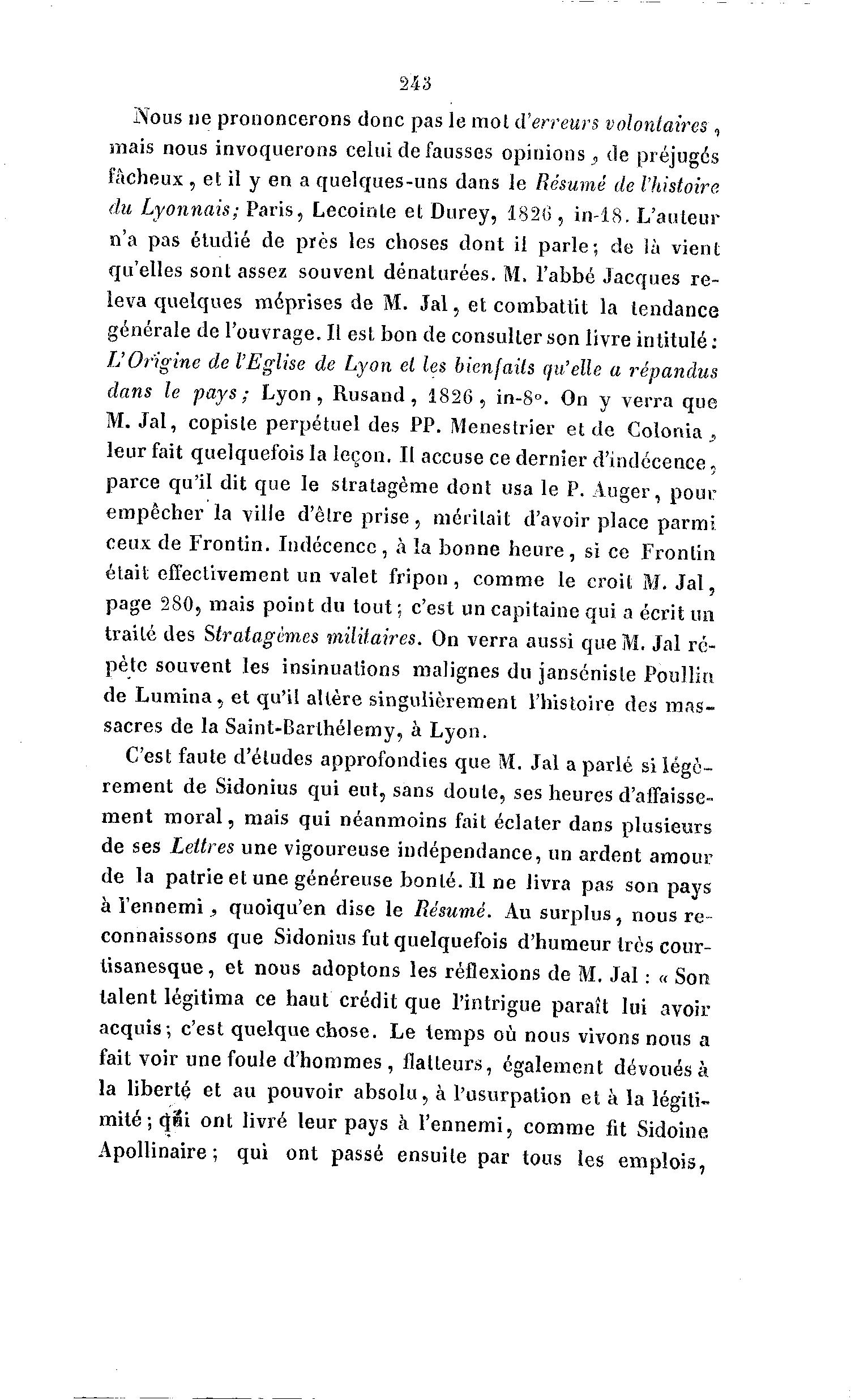 243 Nous ne prononcerons donc pas le mot d'erreurs volontaires , mais nous invoquerons celui défausses opinions } de préjuges fâcheux , et il y en a quelques-uns dans le Résumé de l'histoire du Lyonnais; Paris, Lecoinle et Durey, 1826 , in-18. L'auteur n'a pas étudié de près les choses dont il parle; de là vient qu'elles sont assez souvent dénaturées. M. l'abbé Jacques re- leva quelques méprises de M. J a l , et combattit la tendance générale de l'ouvrage. Il est bon de consulter son livre intitulé : L'Origine de l'Eglise de Lyon el les bienfaits qu'elle a répandus dans le pays; L y o n , Rusand , 1 8 2 6 , in-8°. On y verra que M. J a l , copiste perpétuel des PP. Menestrier et de Colonia _ , leur fait quelquefois la leçon. II accuse ce dernier d'indécence, parce qu'il dit que le stratagème dont usa le P. Auger, pour empêcher la ville d'être p r i s e , méritait d'avoir place parmi ceux de Frontin. Indécence, à la bonne h e u r e , si ce Fronlin était effectivement un valet fripon, comme le croit M. J a l , page 280, mais point du tout ; c'est un capitaine qui a écrit un traité des Stratagèmes militaires. On verra aussi que M. Jal ré- pète souvent les insinuations malignes du janséniste Poullin de L u m i n a , et qu'il altère singulièrement l'histoire des m a s - sacres de la Saint-Barthélémy, à Lyon. C'est faute d'études approfondies que M. Jal a parlé si légè- rement de Sidonius qui eut, sans doute, ses heures d'affaisse- ment m o r a l , mais qui néanmoins fait éclater dans plusieurs de ses Lettres une vigoureuse indépendance, un ardent amour de la patrie et une généreuse bonté. Il ne livra pas son pays à l ' e n n e m i , quoiqu'en dise le Résumé. Au surplus, nous re- connaissons que Sidonius fut quelquefois d'humeur très cour- tisanesque, et nous adoptons les réflexions de M. Jal : « Son talent légitima ce haut crédit que l'intrigue paraît lui avoir acquis; c'est quelque chose. Le temps où nous vivons nous a fait voir une foule d'hommes, flatteurs, également dévoués à la liberté et au pouvoir absolu, à l'usurpation et à la légiti- mité ; qBi ont livré leur pays à l'ennemi, comme fit Sidoine Apollinaire; qui ont passé ensuite par tous les emplois,